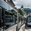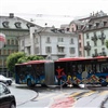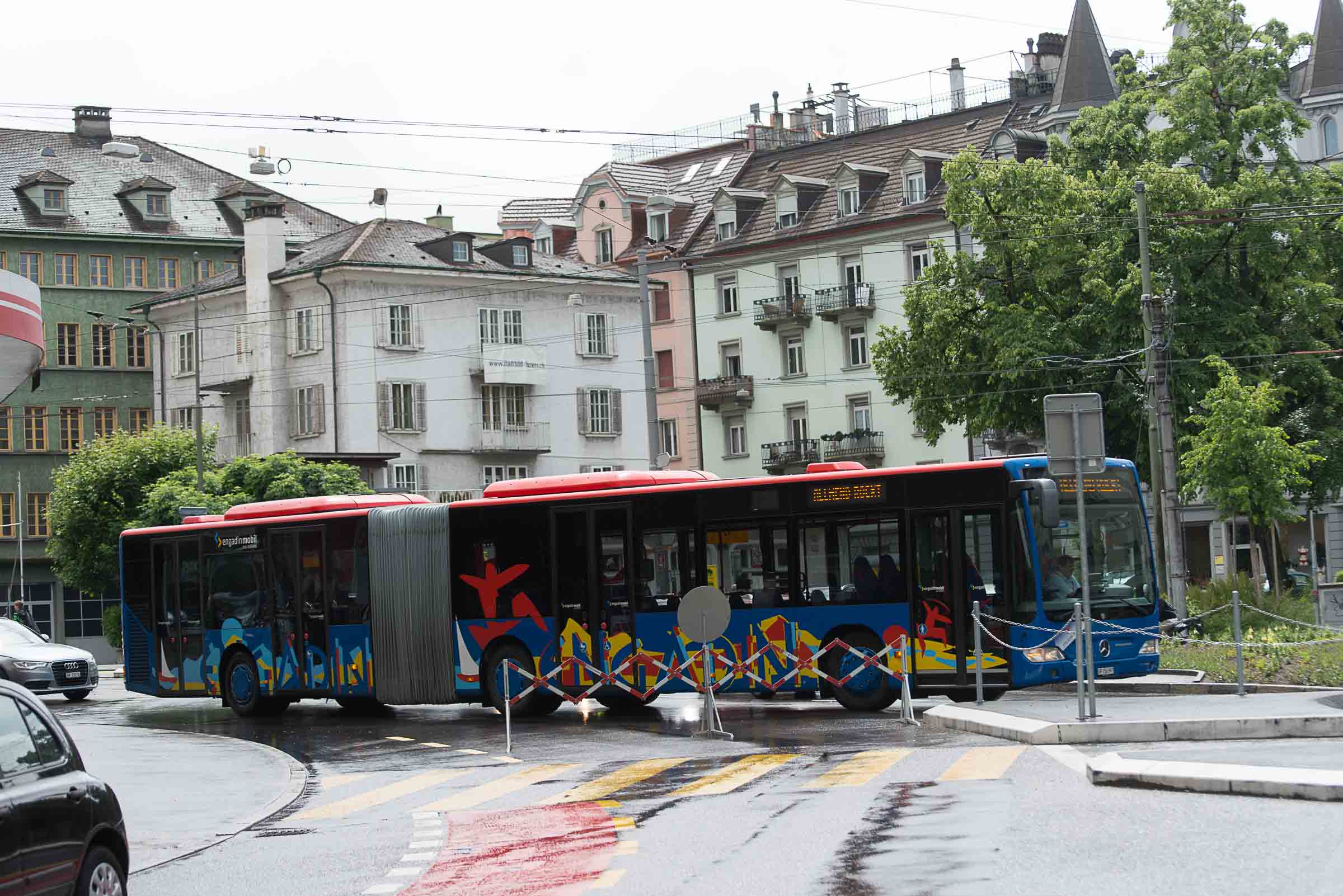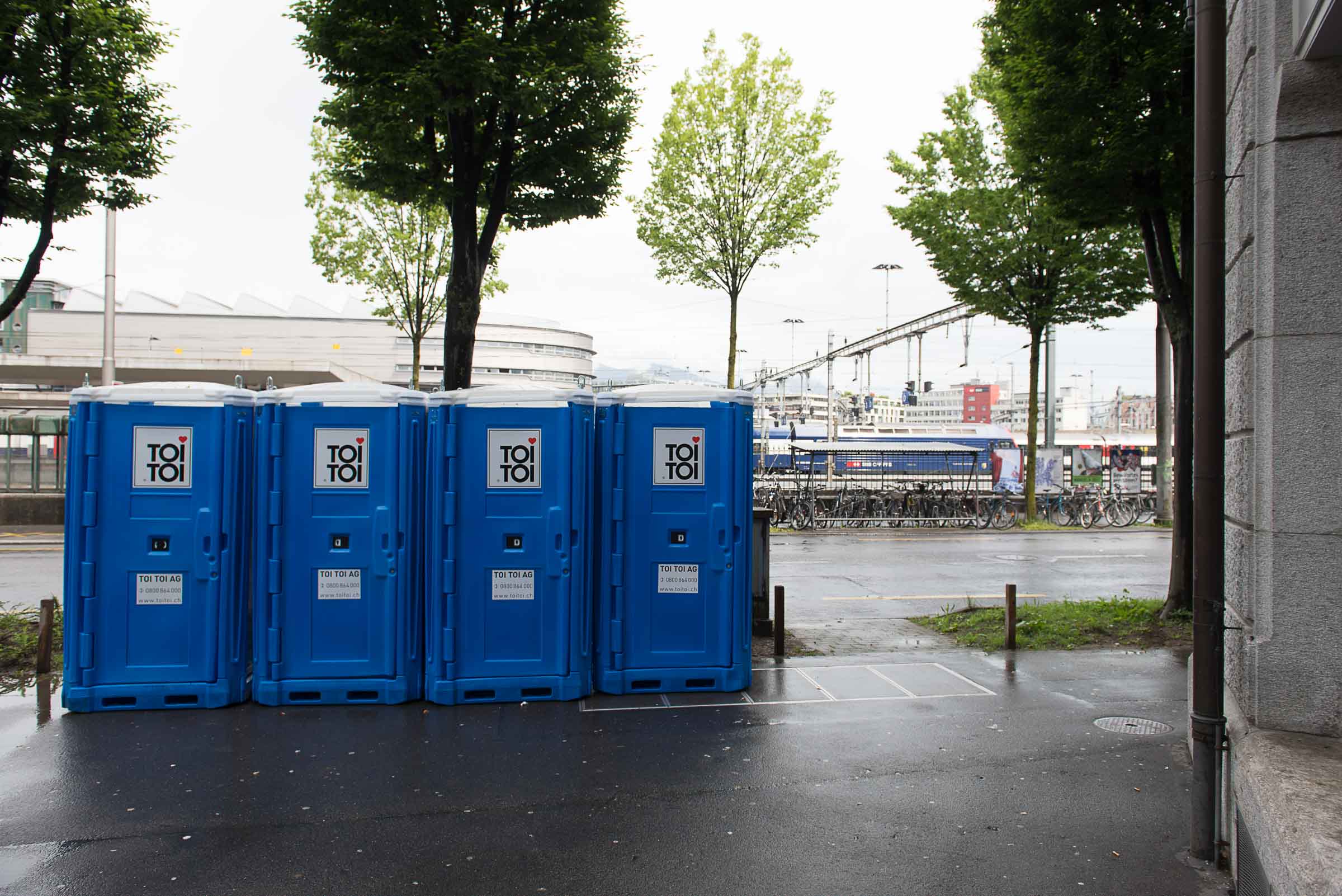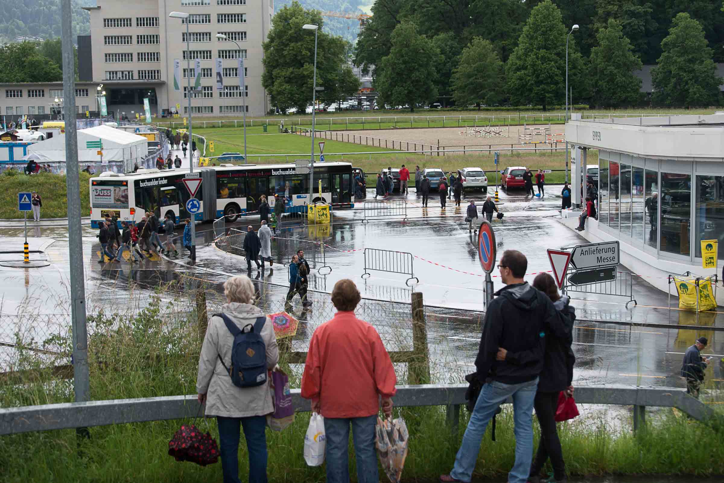 Mit einem Bus der normalerweise zwischen Sameden und St. Moritz fährt, gelangen die Konzert Besucher auf die Allmend. Die Busse fahren ab der Zentralstrasse. Die Bahnhofstrasse hat sich  dieses Wochenende ein Bus-Depot gewandelt. Alles perfekt organisiert - kein Gedränge. Die blauen Häuschen stehen bereit, falls sich das grüne, gelbe oder das Bündner Bier zum Abgang meldet.