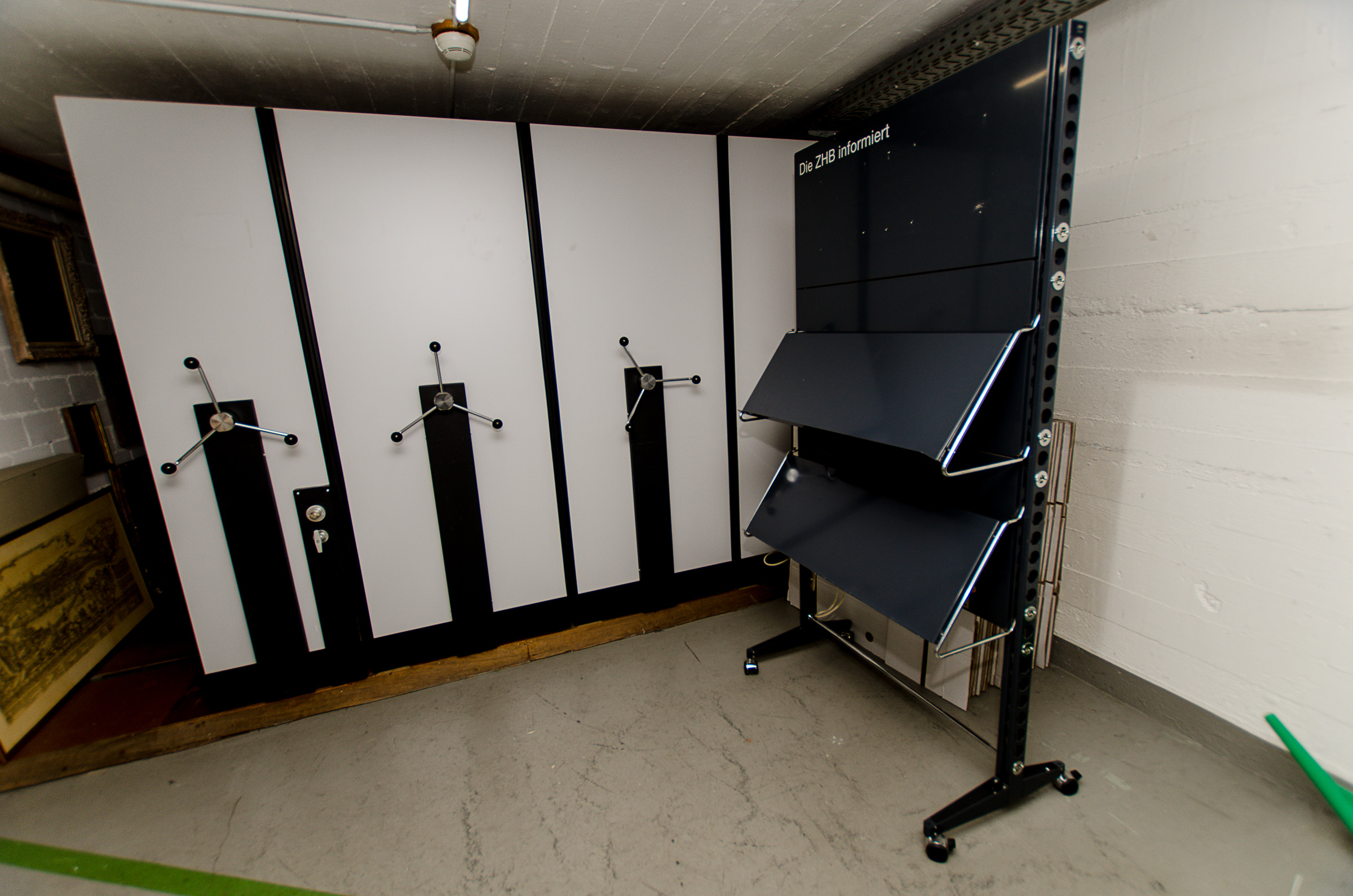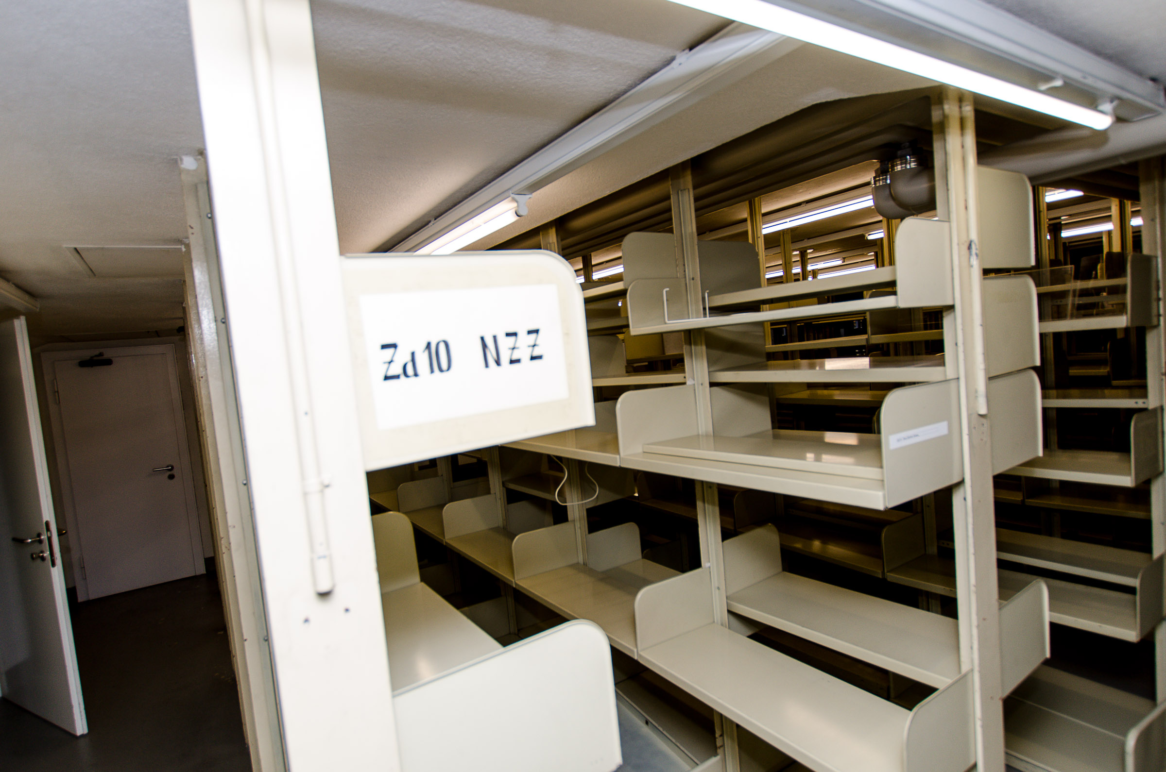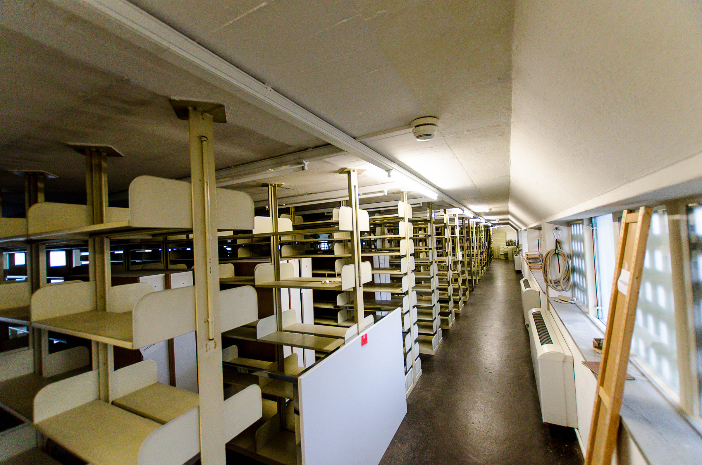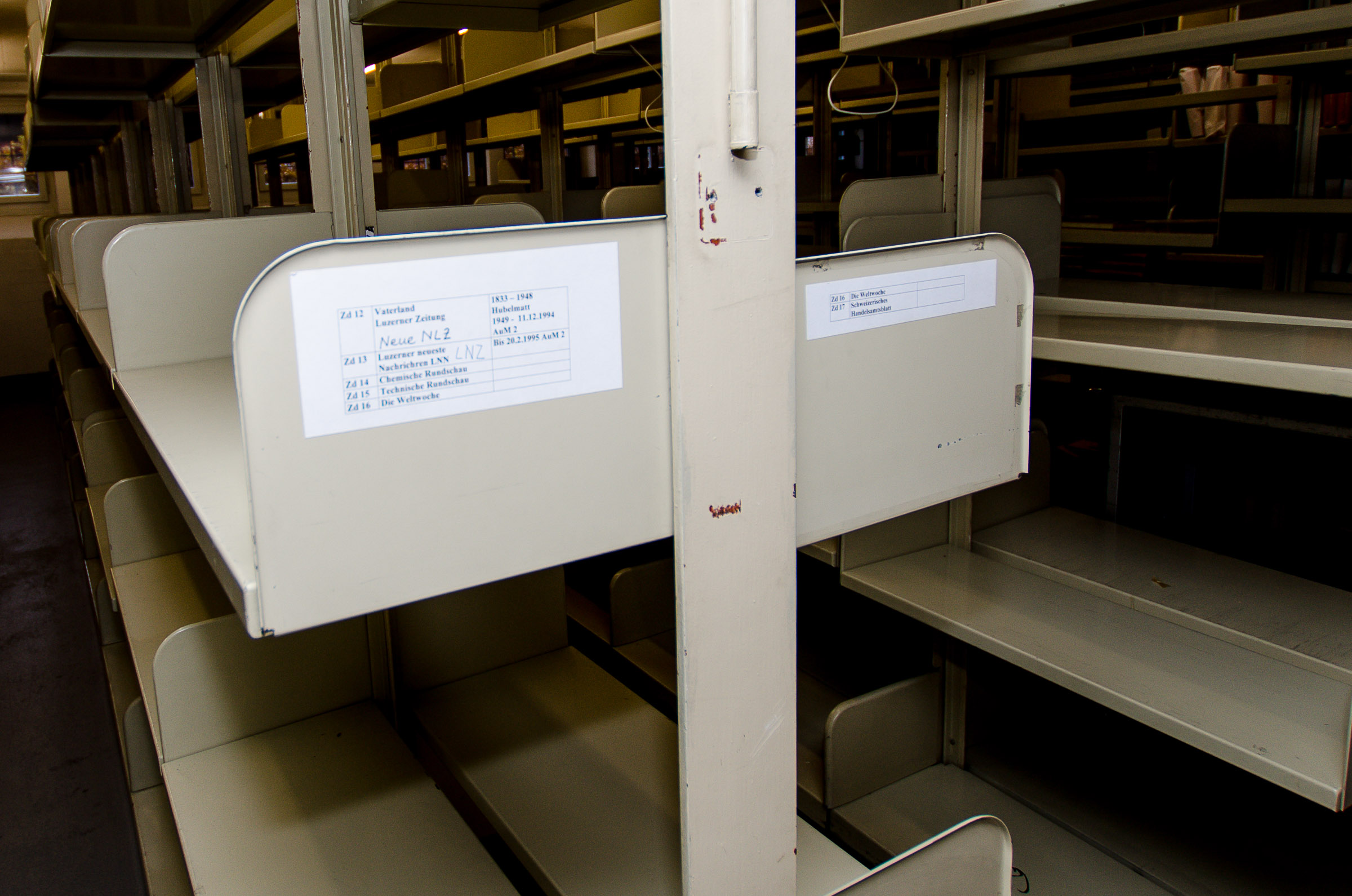 Auf vier Stöcken stehen die Metallgestelle. In der internen Cafeteria ist die Farbe bunter, jedoch mit der gleichen Aufgabe. Die Stützen müssen auf jedem Stockwerk am genau gleichen Ort stehen, damit die Tragfähigkeit während der Lagerung der Bücher im Haus gewährleistet wird. Sonst kamen die Jahresbände des Vaterlands, der neuen LZ, Luzerner neusten Nachrichten LNN, Chemische Rundschau und Technische Rundschau in Schieflage und liegen auf der alten Tante (NZZ).