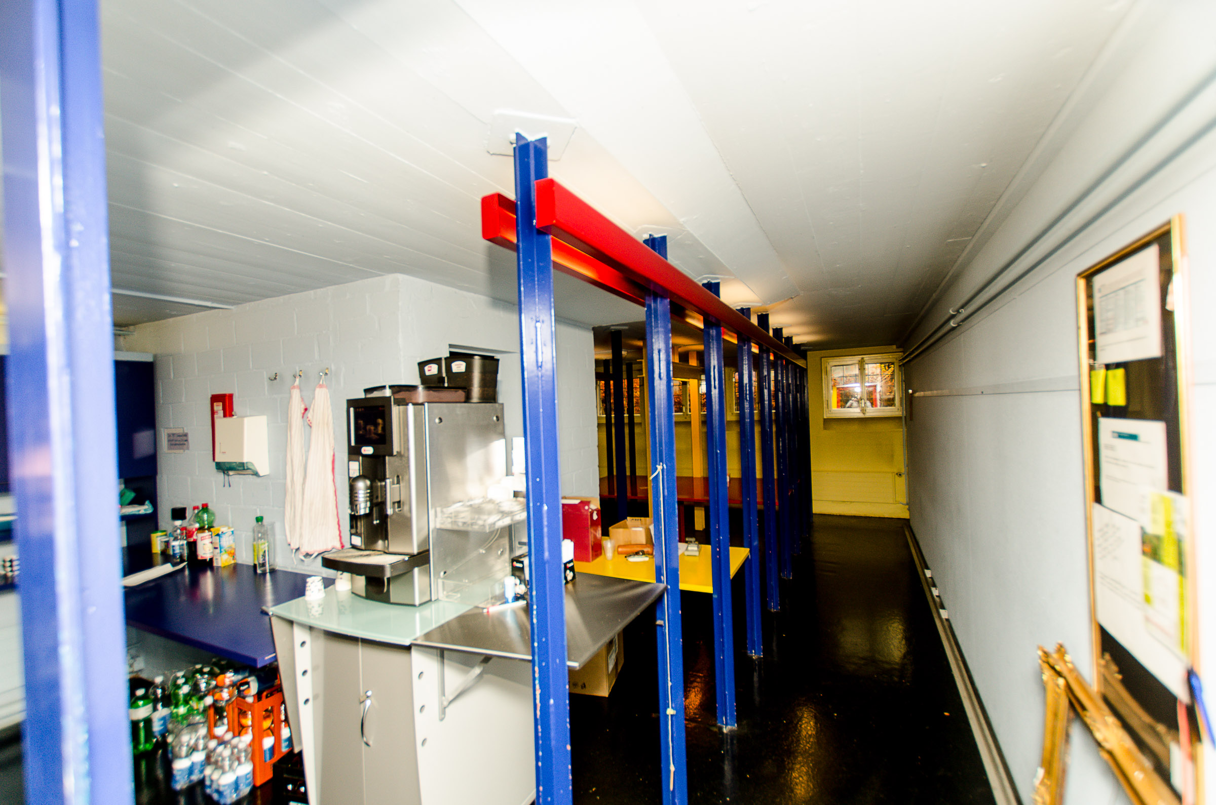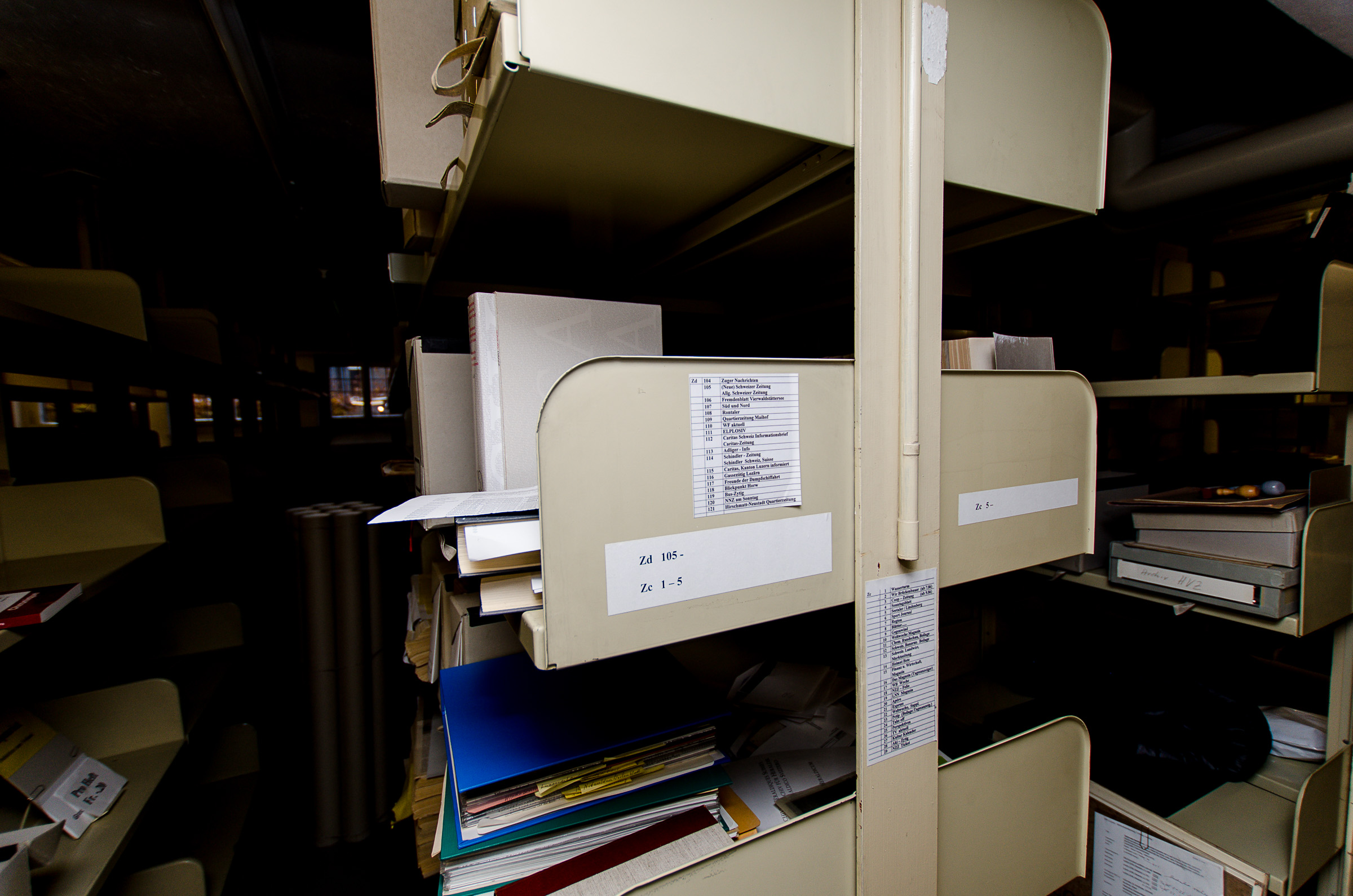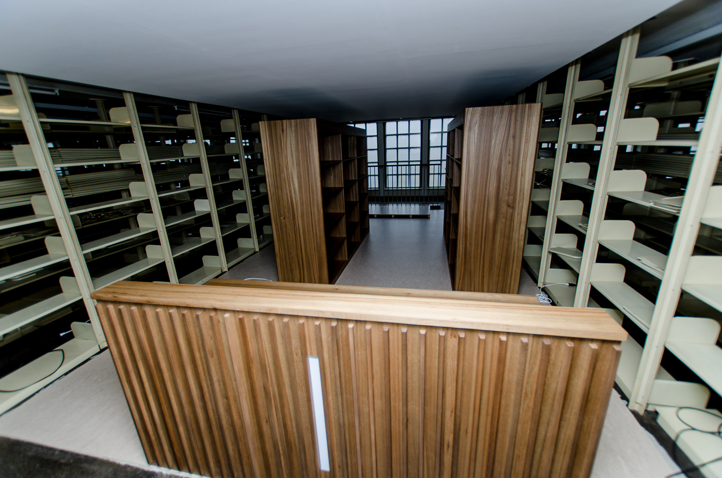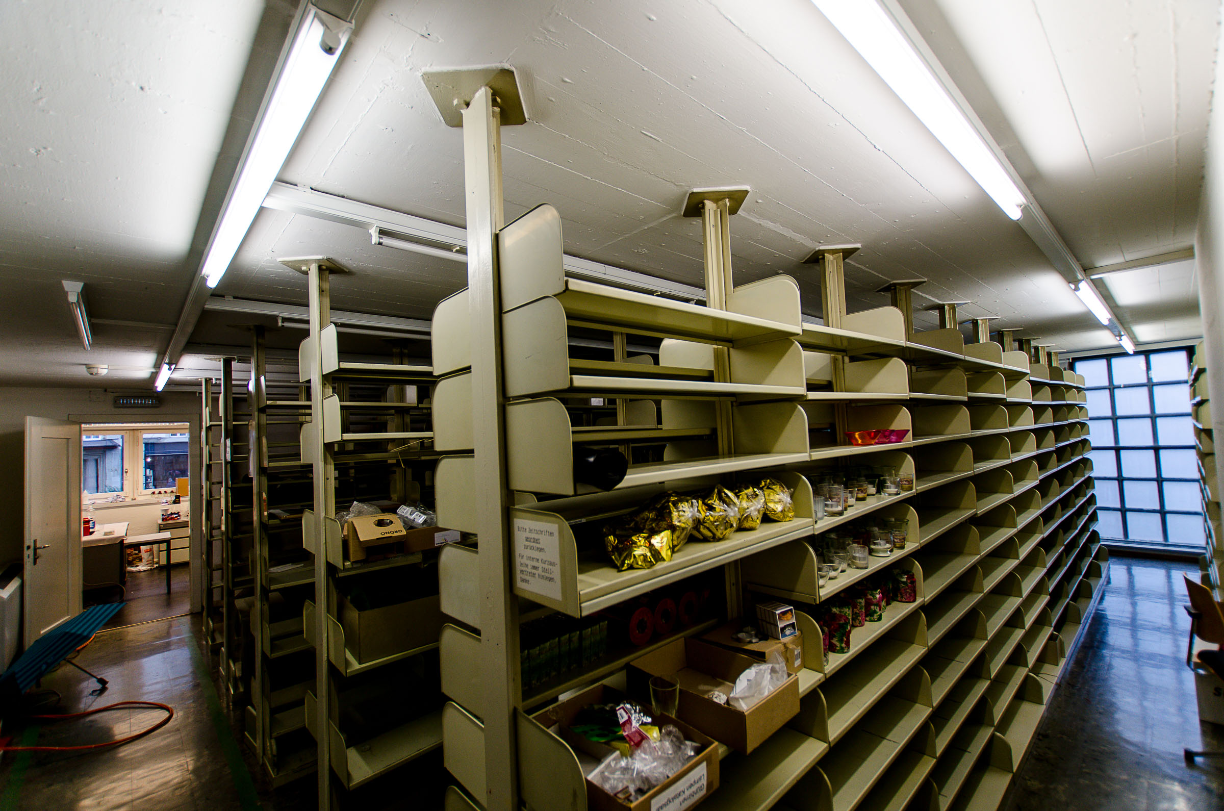 Auf vier Stöcken stehen die Metallgestelle. In der internen Cafeteria ist die Farbe bunter, jedoch mit der gleichen Aufgabe. Die Stützen müssen auf jedem Stockwerk am genau gleichen Ort stehen, damit die Tragfähigkeit während der Lagerung der Bücher im Haus gewährleistet wird. Sonst kamen die Jahresbände des Vaterlands, der neuen LZ, Luzerner neusten Nachrichten LNN, Chemische Rundschau und Technische Rundschau in Schieflage und liegen auf der alten Tante (NZZ).