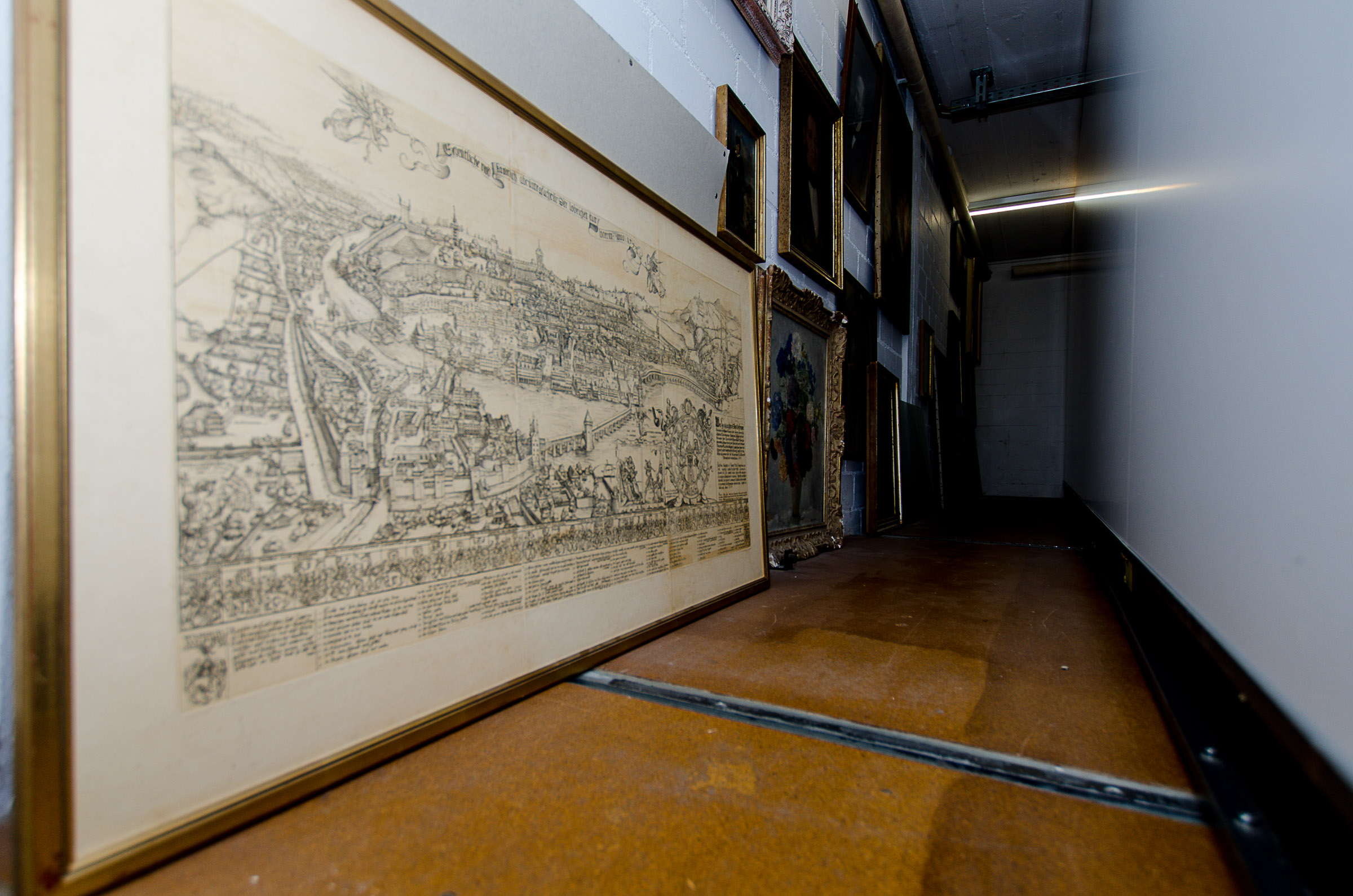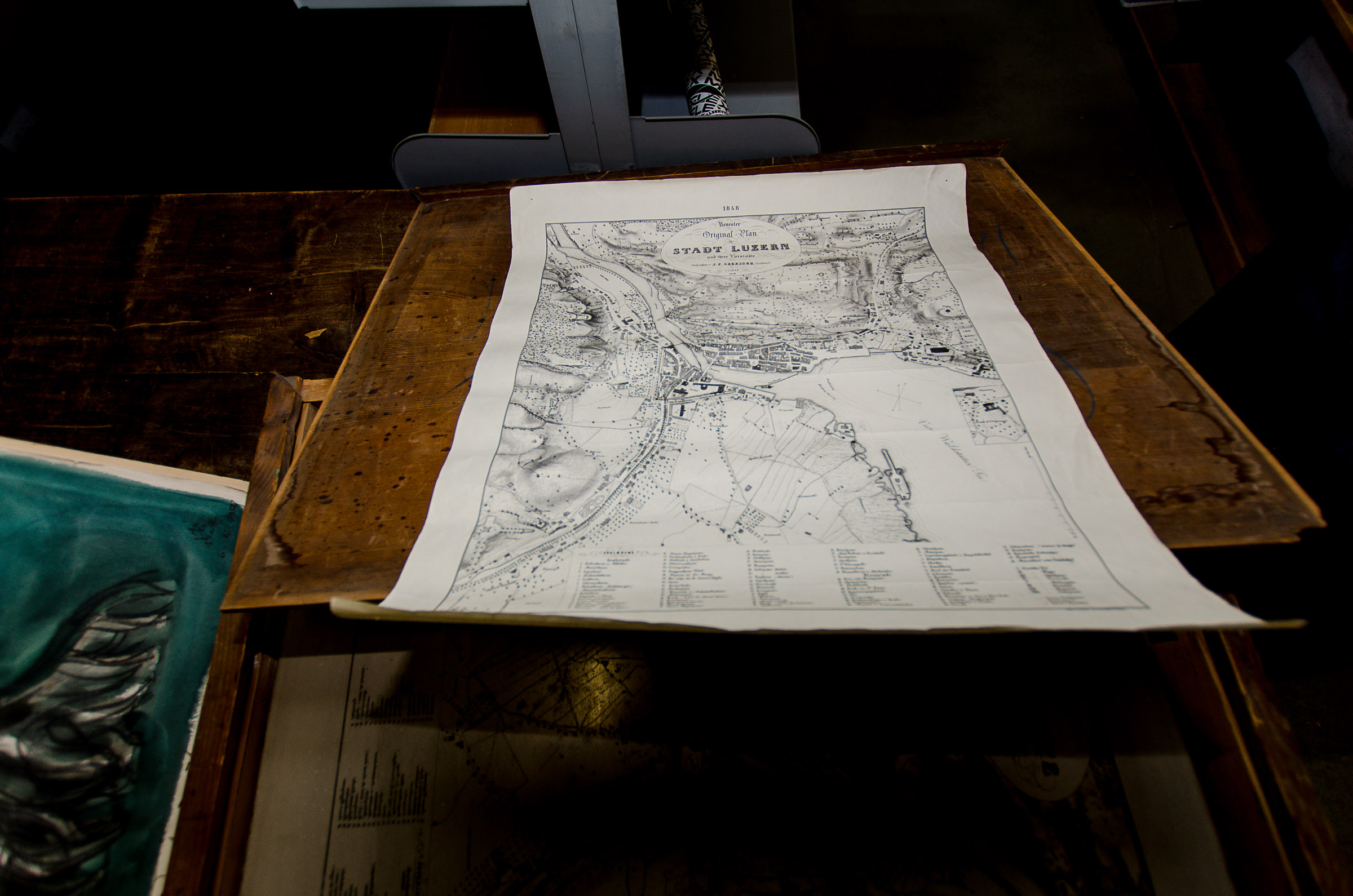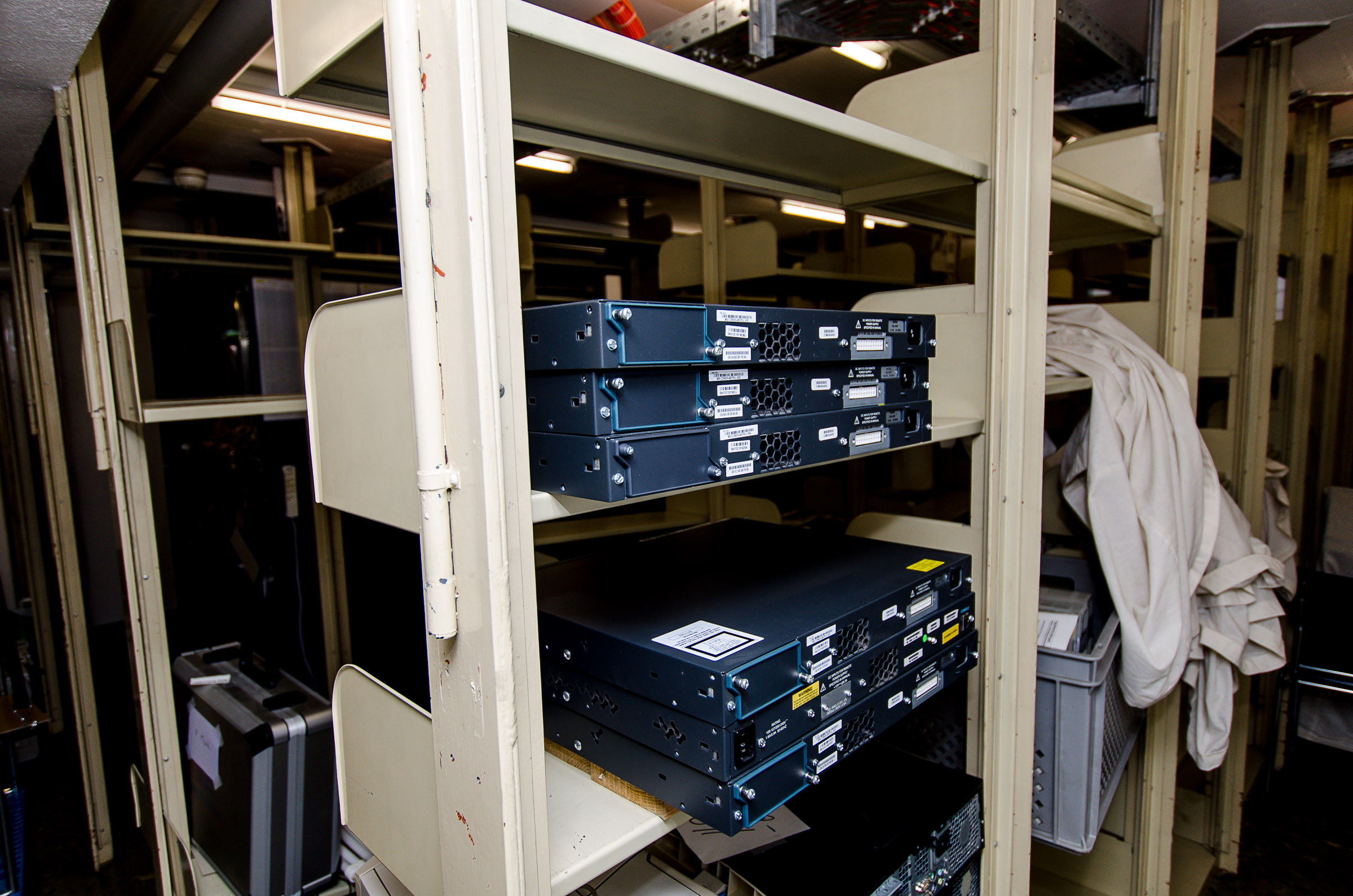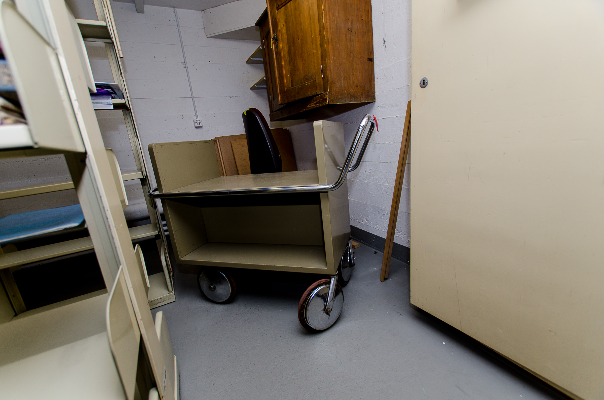 Auf vier Stöcken stehen die Metallgestelle. In der internen Cafeteria ist die Farbe bunter, jedoch mit der gleichen Aufgabe. Die Stützen müssen auf jedem Stockwerk am genau gleichen Ort stehen, damit die Tragfähigkeit während der Lagerung der Bücher im Haus gewährleistet wird. Sonst kamen die Jahresbände des Vaterlands, der neuen LZ, Luzerner neusten Nachrichten LNN, Chemische Rundschau und Technische Rundschau in Schieflage und liegen auf der alten Tante (NZZ).