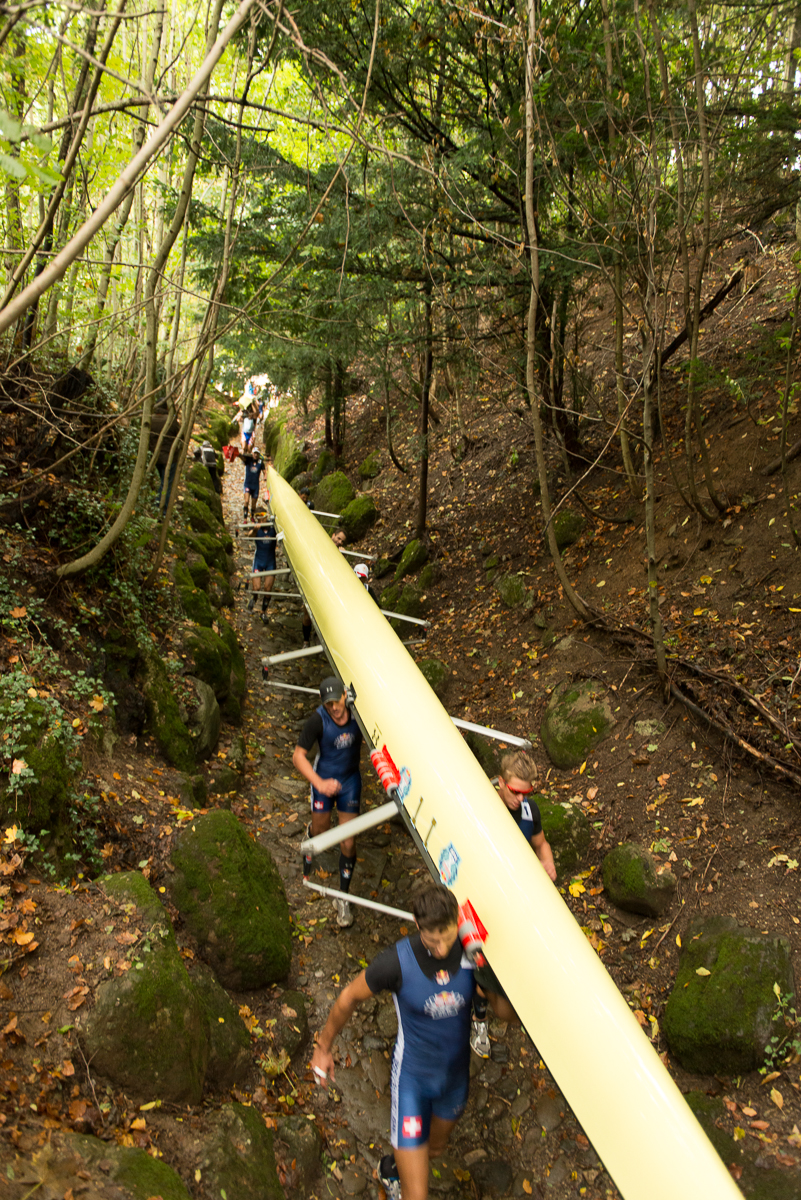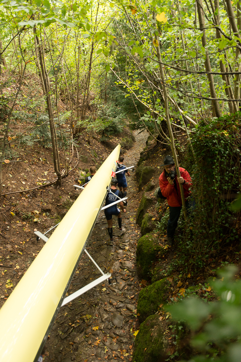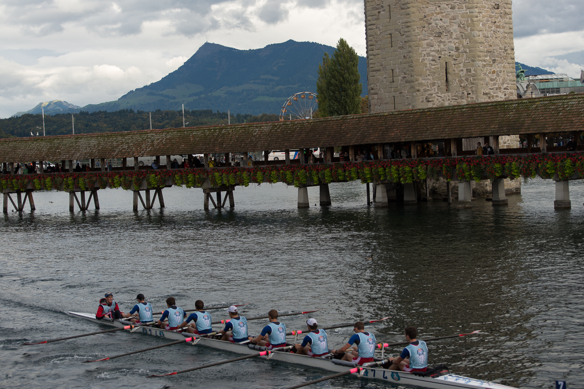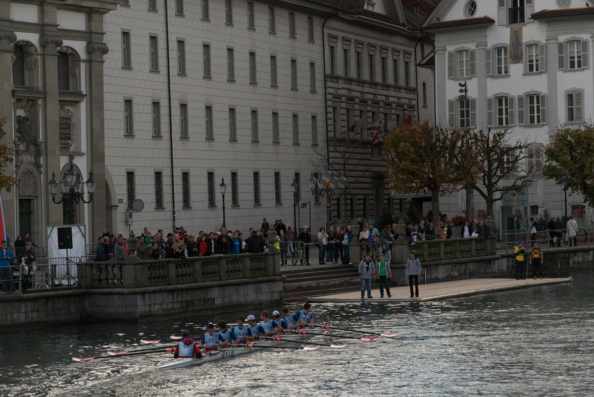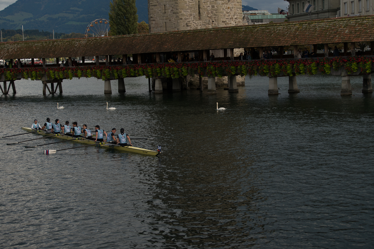 Durch die Hohlen Gasse in Küssnacht kommt heute kein Gessler durch. Die Platzverhältnisse sind viel zu knapp für die 21 Achterboote die in Zug gestartet sind. Das Ziel: Luzern zu erreichen zu Fuss über Asphalt und zu Wasser. In Immensee heisst es aus dem Boot, Ruder zusammenschnüren und ab auf die Strasse. 100 kg ein Boot, getragen von den Rudern nach Küssnacht über Stock und Stein. Durch die Hohlen Gasse wird es eng. Die Zuschauer stehen am Eingang zur Gasse. Der Kampf durch die glitschige Gasse beginnt. Boot drehen, verlorenes Maskotchen holen, weiter geht’s, die Steuerfrau gibt Anweisung, drehen! Go go!