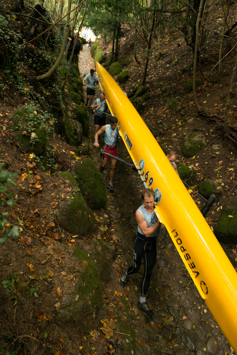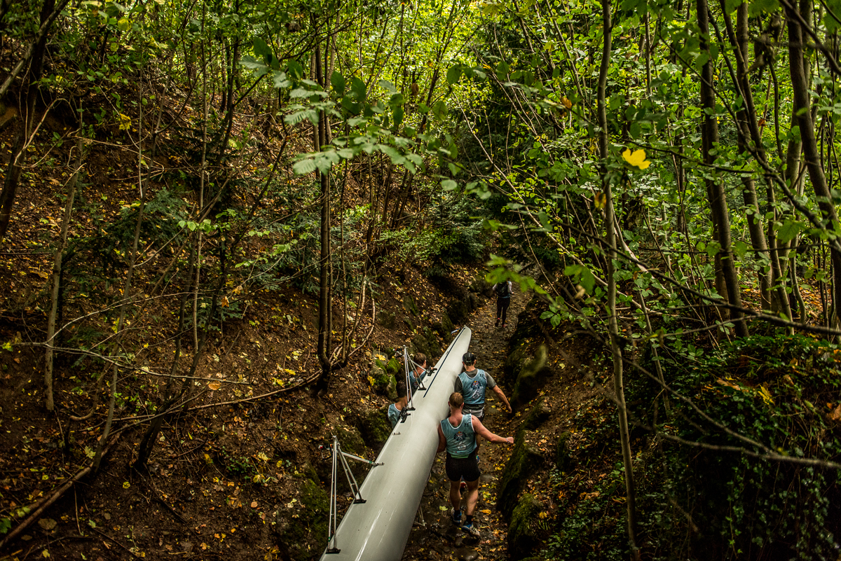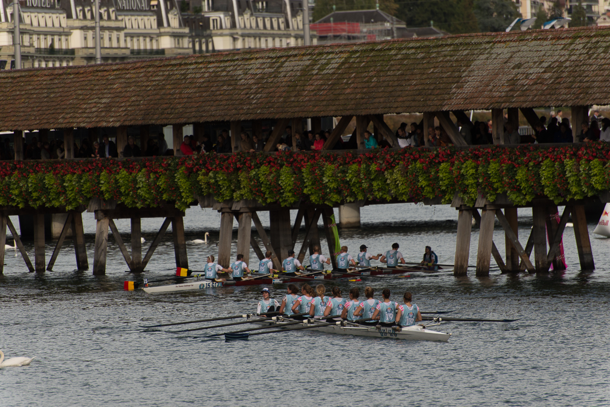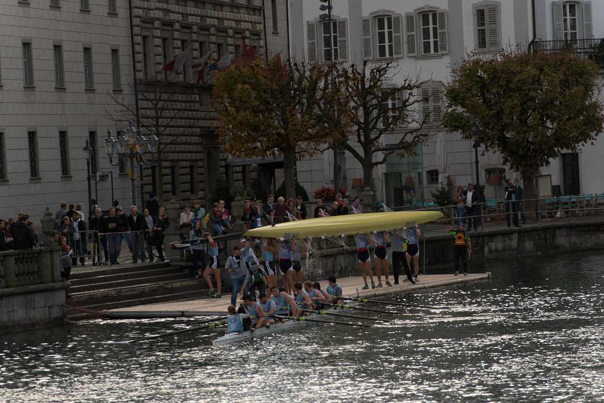 Durch die Hohlen Gasse in Küssnacht kommt heute kein Gessler durch. Die Platzverhältnisse sind viel zu knapp für die 21 Achterboote die in Zug gestartet sind. Das Ziel: Luzern zu erreichen zu Fuss über Asphalt und zu Wasser. In Immensee heisst es aus dem Boot, Ruder zusammenschnüren und ab auf die Strasse. 100 kg ein Boot, getragen von den Rudern nach Küssnacht über Stock und Stein. Durch die Hohlen Gasse wird es eng. Die Zuschauer stehen am Eingang zur Gasse. Der Kampf durch die glitschige Gasse beginnt. Boot drehen, verlorenes Maskotchen holen, weiter geht’s, die Steuerfrau gibt Anweisung, drehen! Go go!