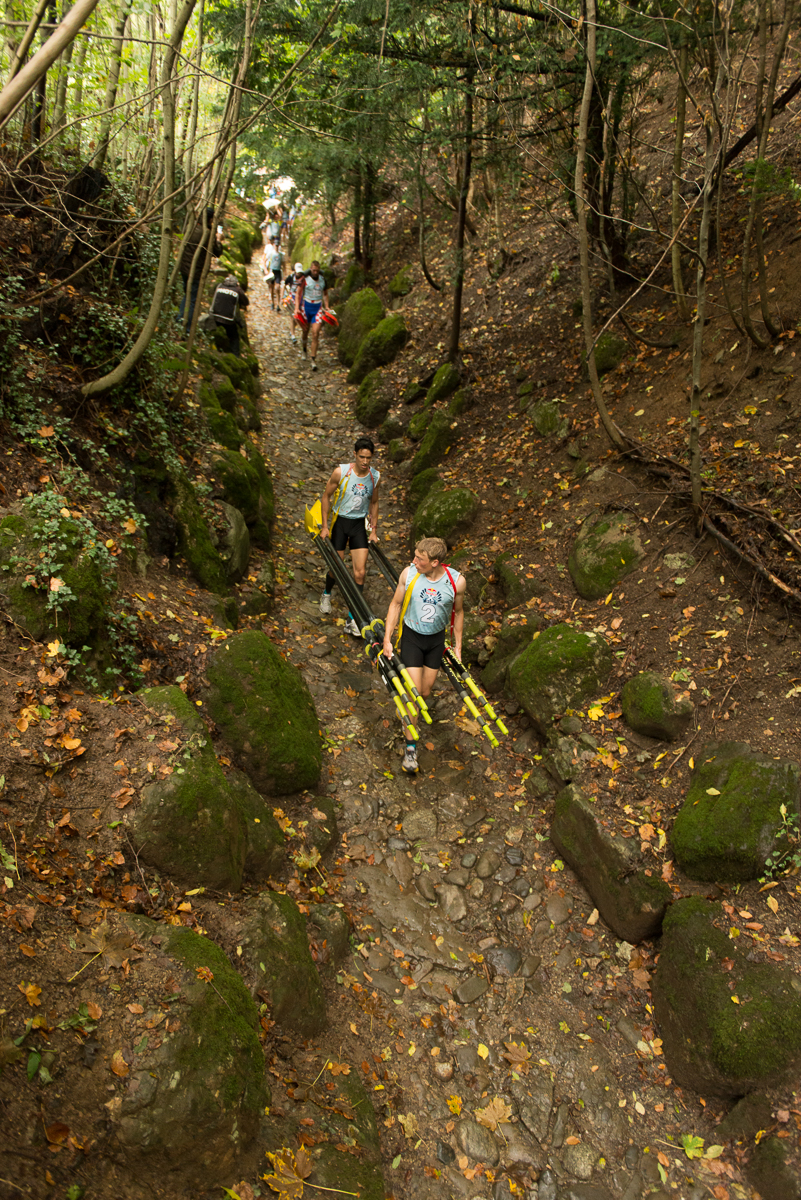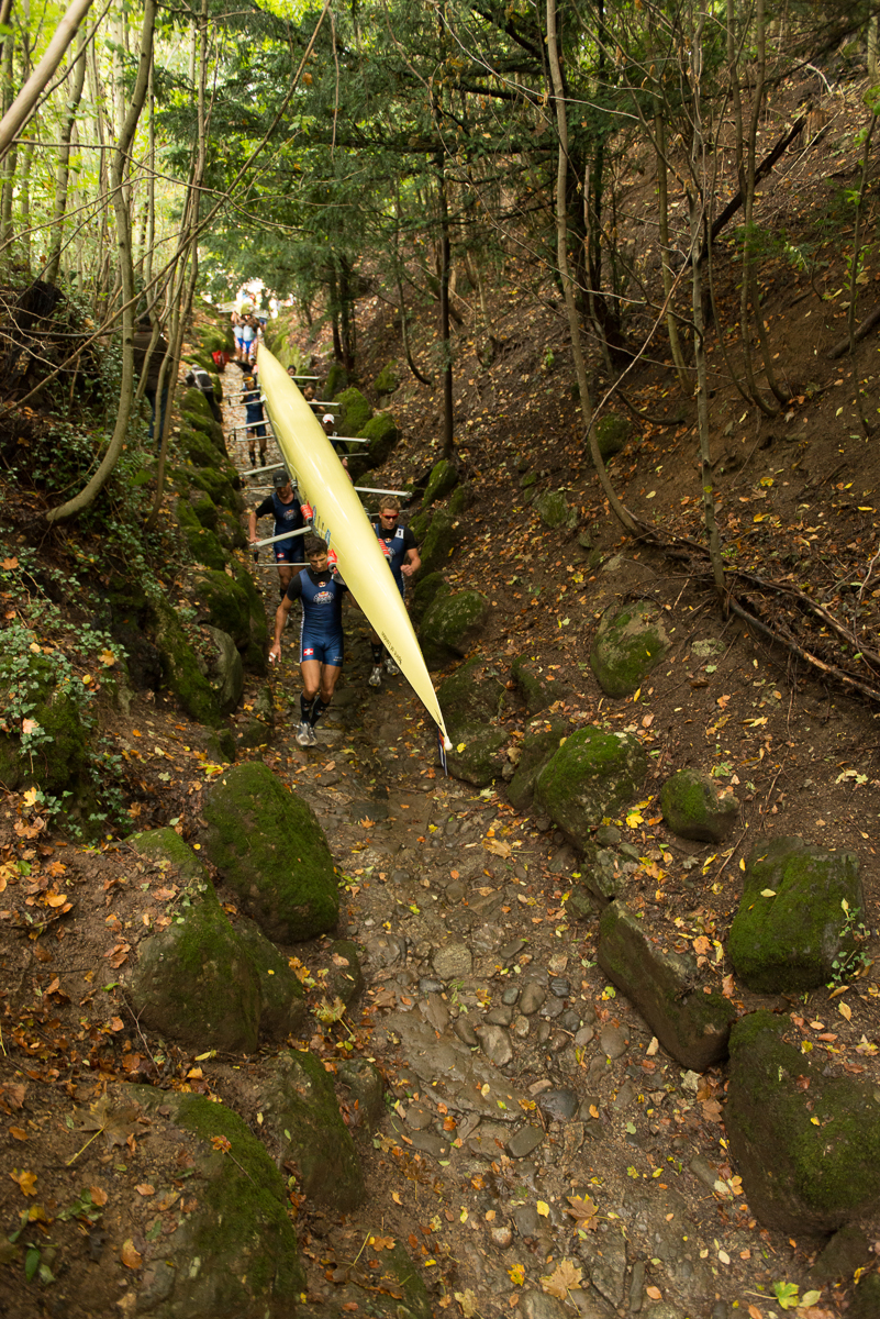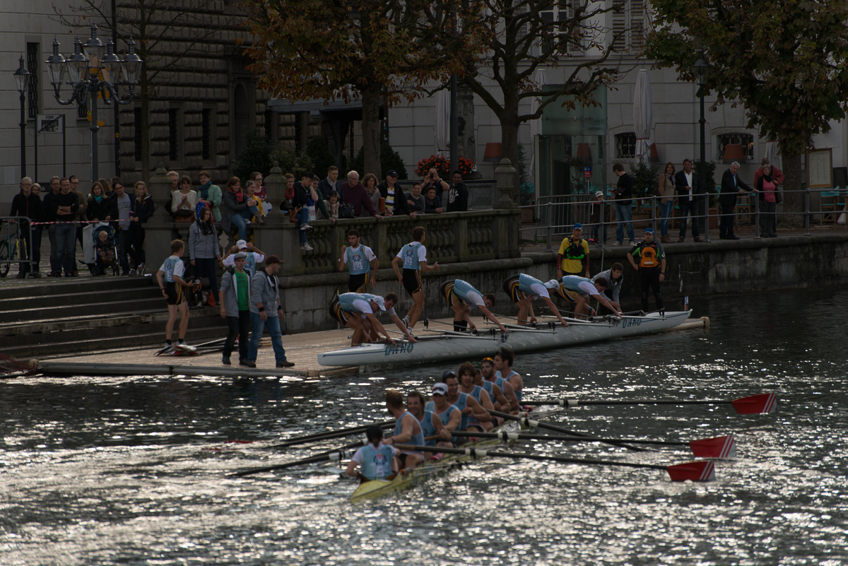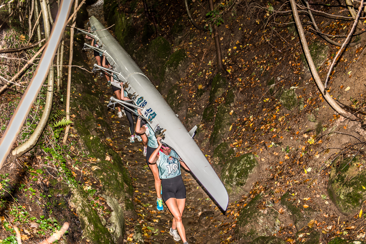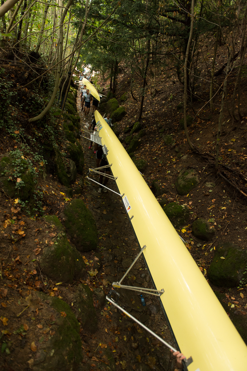 Durch die Hohlen Gasse in Küssnacht kommt heute kein Gessler durch. Die Platzverhältnisse sind viel zu knapp für die 21 Achterboote die in Zug gestartet sind. Das Ziel: Luzern zu erreichen zu Fuss über Asphalt und zu Wasser. In Immensee heisst es aus dem Boot, Ruder zusammenschnüren und ab auf die Strasse. 100 kg ein Boot, getragen von den Rudern nach Küssnacht über Stock und Stein. Durch die Hohlen Gasse wird es eng. Die Zuschauer stehen am Eingang zur Gasse. Der Kampf durch die glitschige Gasse beginnt. Boot drehen, verlorenes Maskotchen holen, weiter geht’s, die Steuerfrau gibt Anweisung, drehen! Go go!