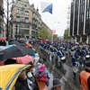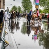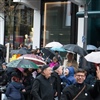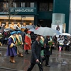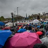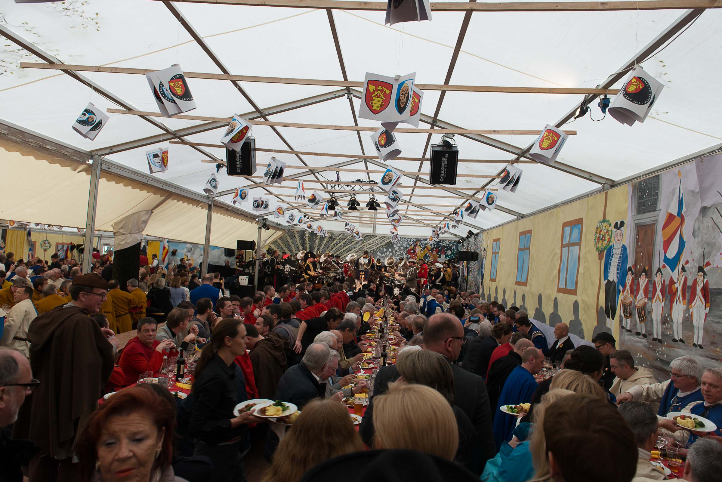 Die Menschen Menge unter dern farbigen Schirmen lacht laut und verlässt Platz, ohne das obligate Bratwurstgrillen.