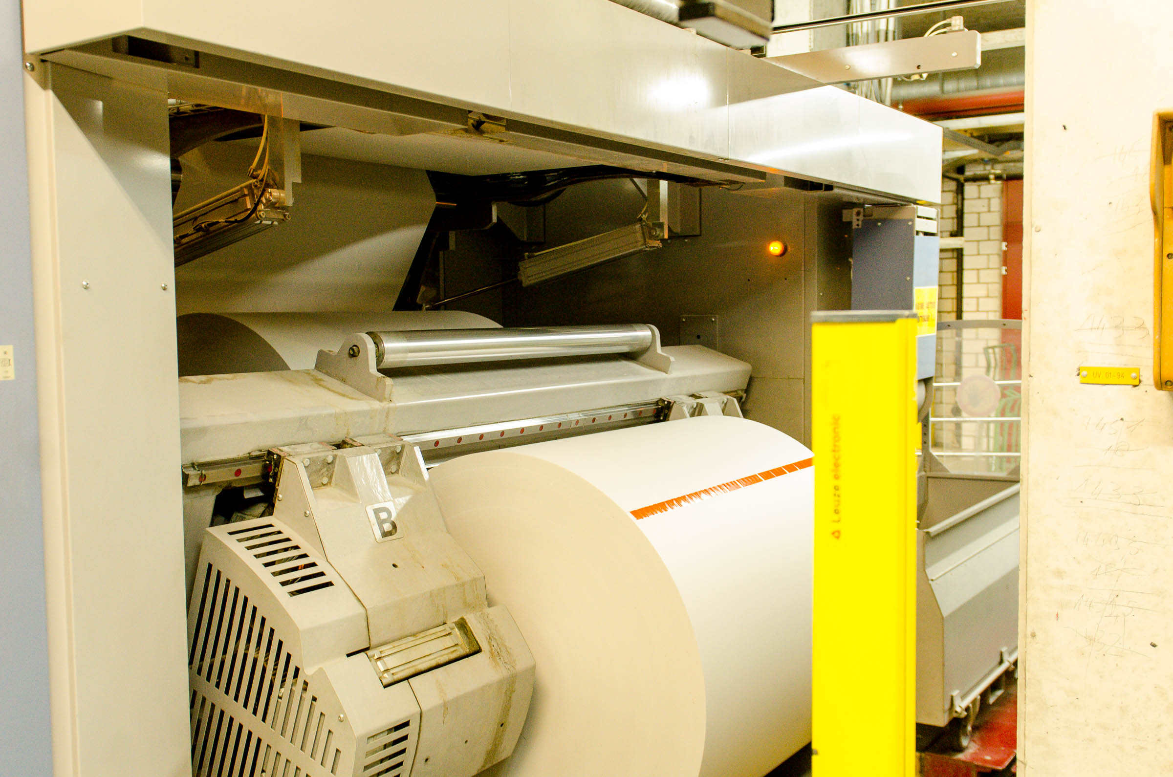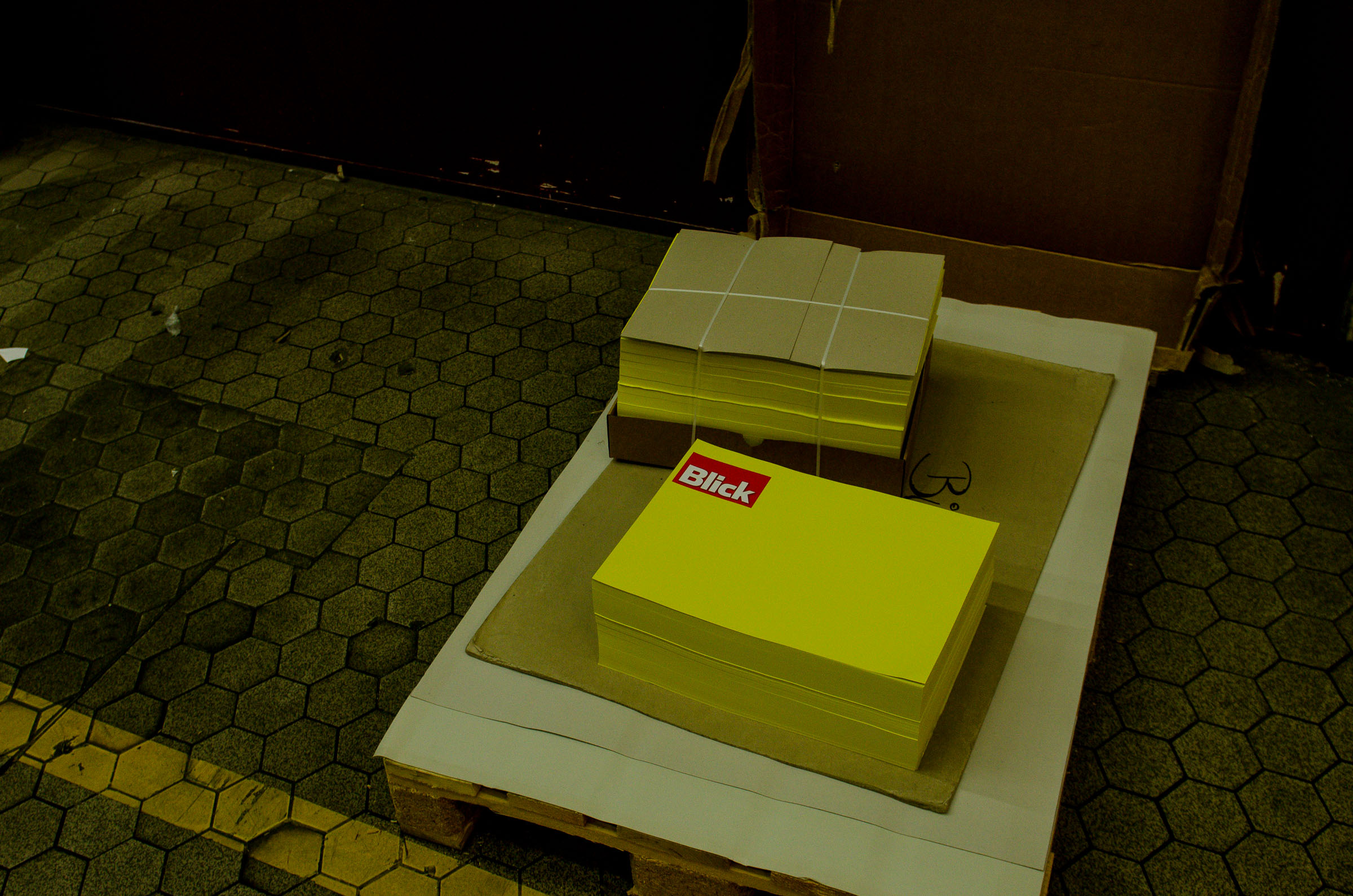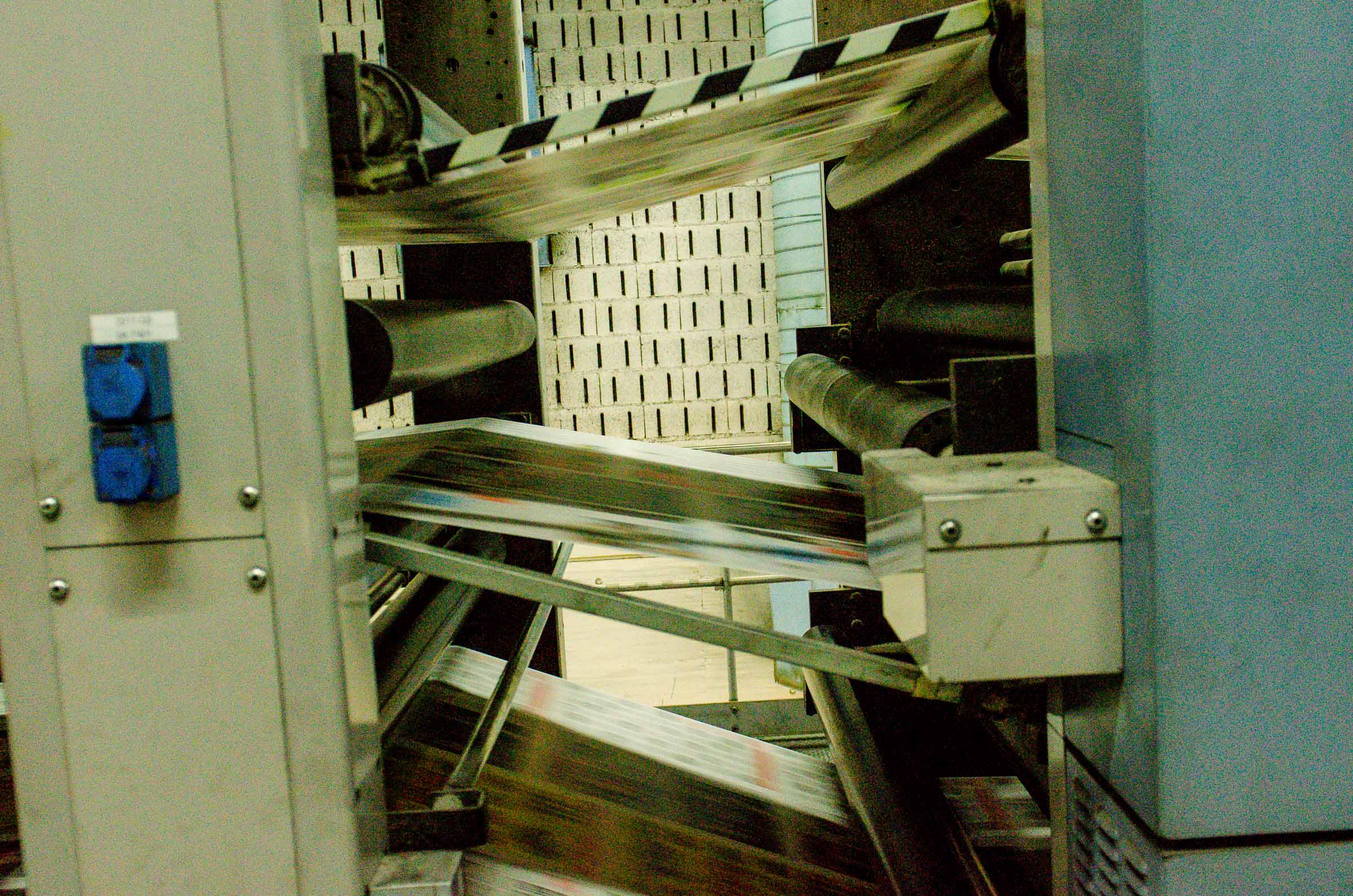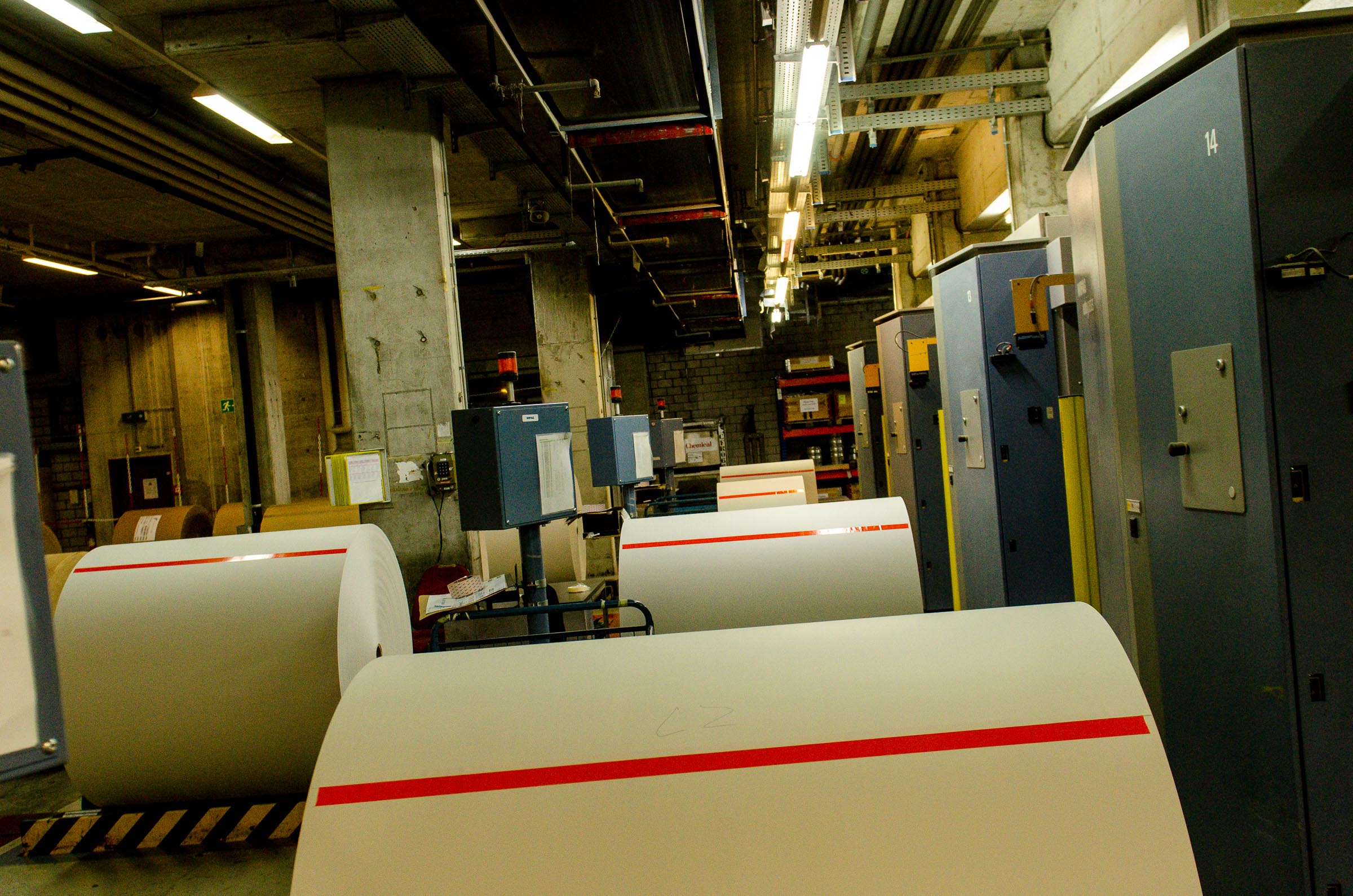 Die ersten 10'000 Blick-Exemplare sind über die Druckzylinder gelaufen und steuern Richtung Weiterverarbeitung. Ein Zwischenstop, aufgewickelt auf grossen Rollen, warten sie auf den nächsten Arbeitsschritt. Zwischen Druckmaschine und Versandstrasse kann es zu technischen Unstimmigkeiten kommen. Mit dem Puffer der aufgewickelten Zeitungen, kann dies elegant gelöst werden. Draussen in der grossen Halle stehen die ersten Kuriere bereit. Sie fahren die Zeitungsbündel durch die ganze Schweiz zu den Depots für die Verteilung.