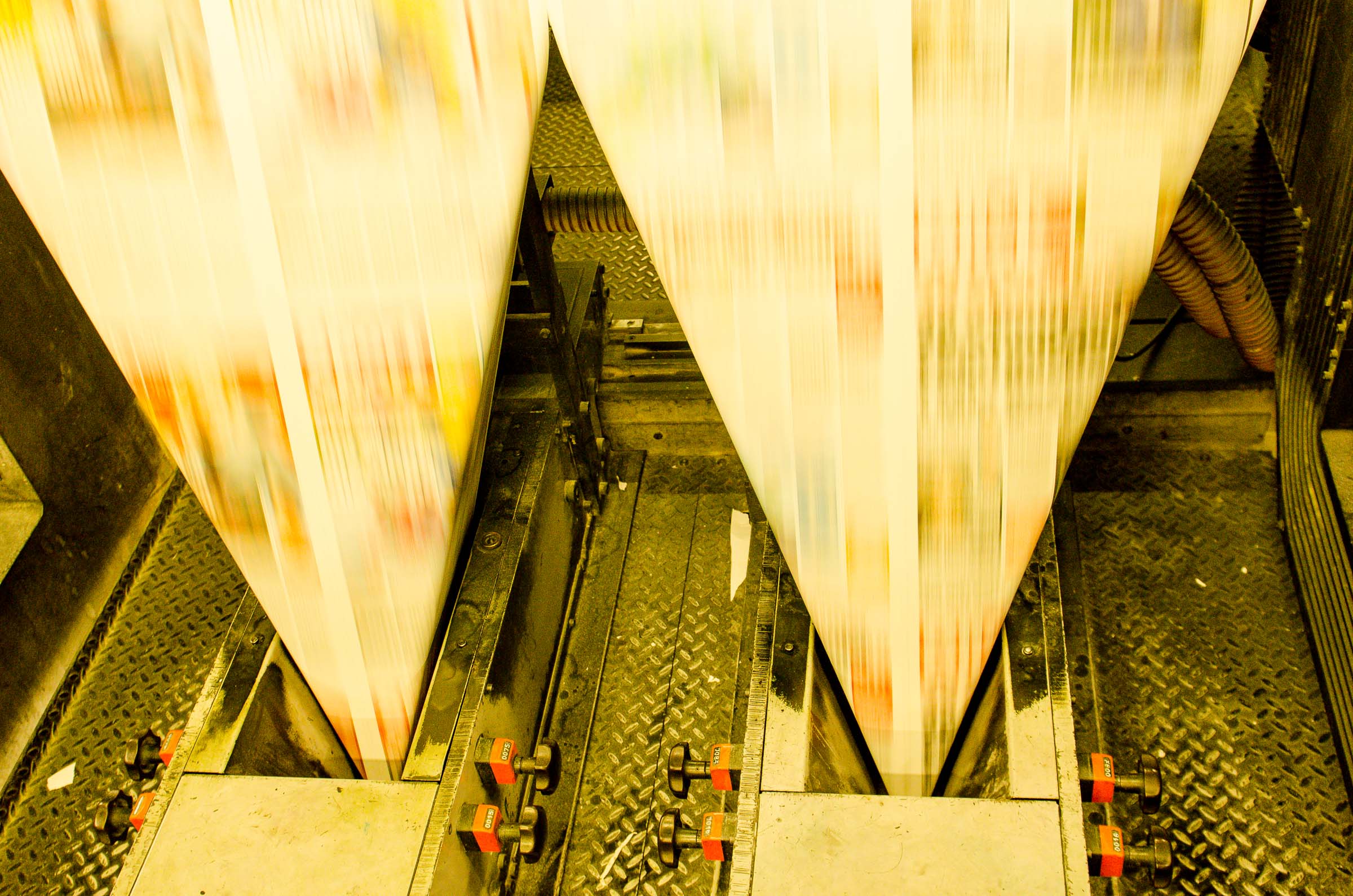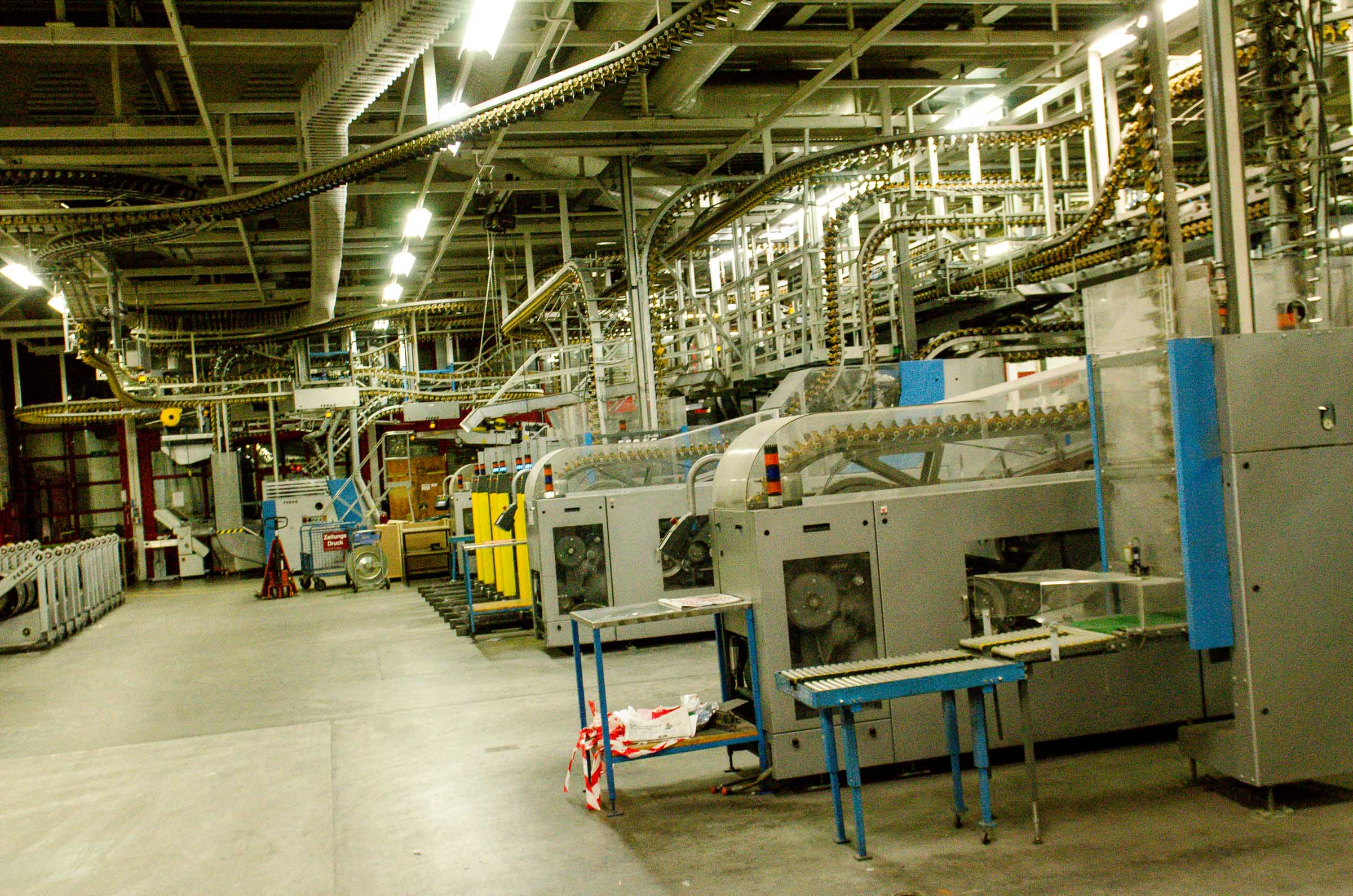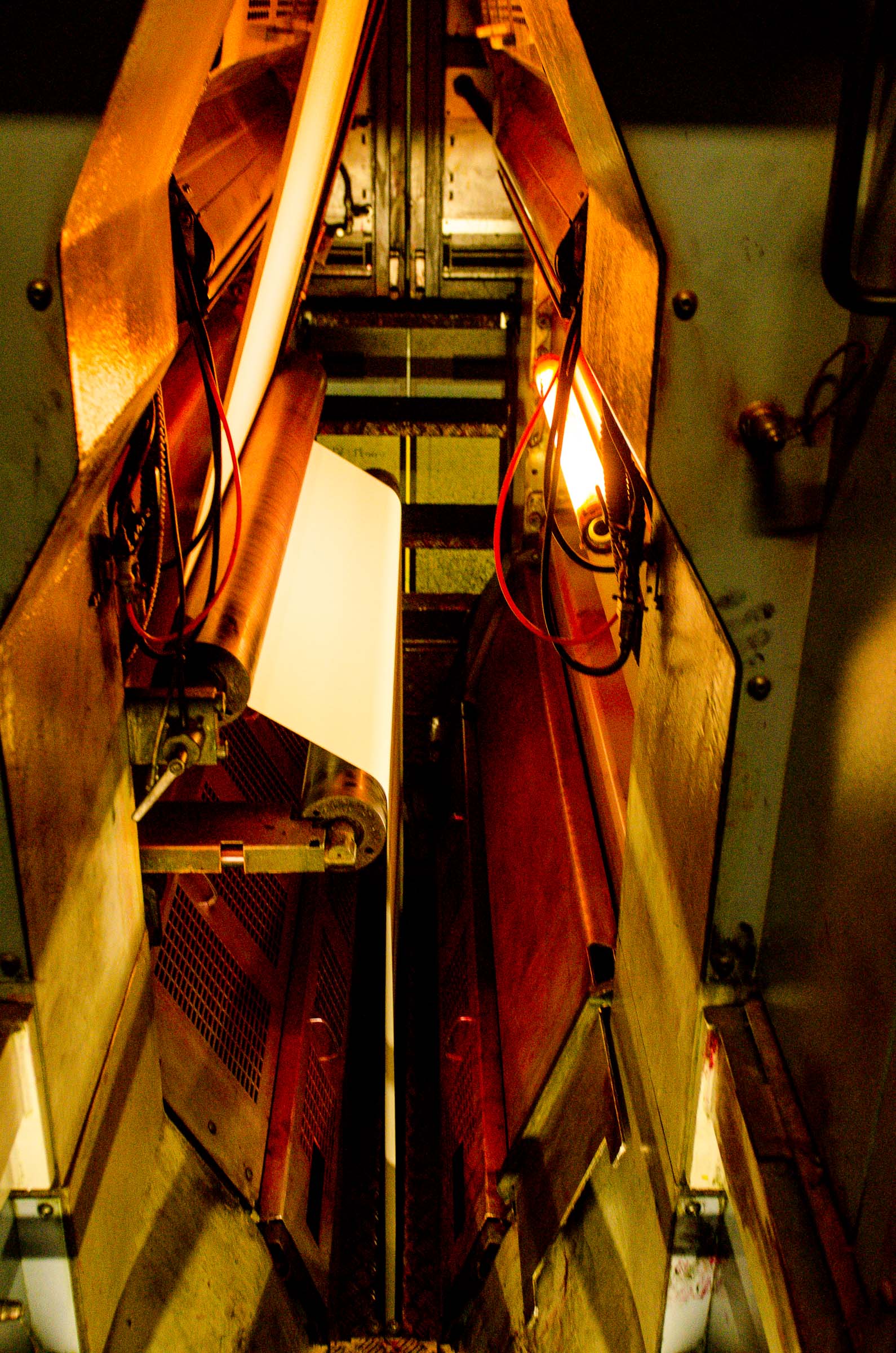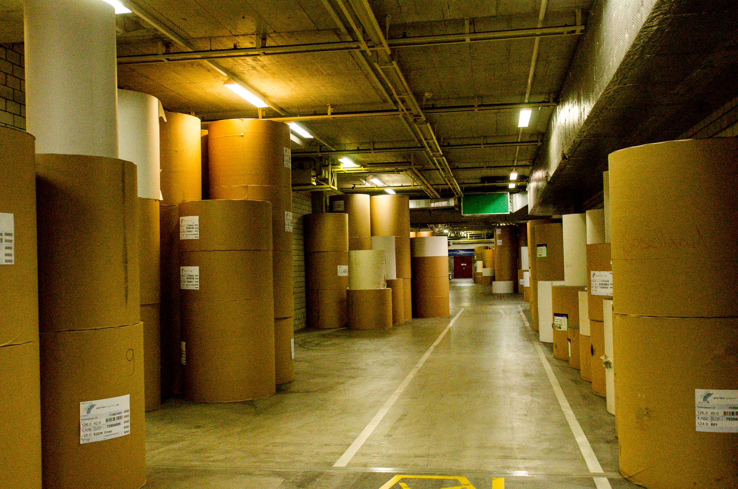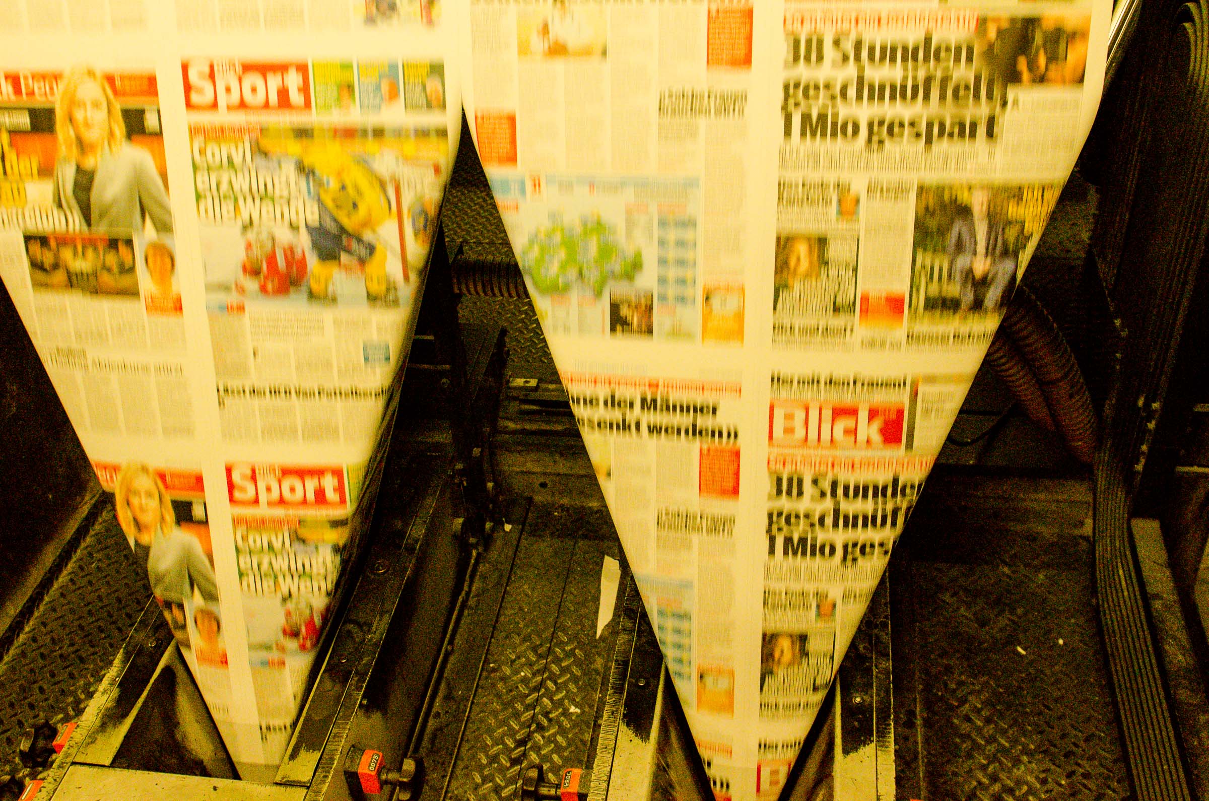 Die ersten 10'000 Blick-Exemplare sind über die Druckzylinder gelaufen und steuern Richtung Weiterverarbeitung. Ein Zwischenstop, aufgewickelt auf grossen Rollen, warten sie auf den nächsten Arbeitsschritt. Zwischen Druckmaschine und Versandstrasse kann es zu technischen Unstimmigkeiten kommen. Mit dem Puffer der aufgewickelten Zeitungen, kann dies elegant gelöst werden. Draussen in der grossen Halle stehen die ersten Kuriere bereit. Sie fahren die Zeitungsbündel durch die ganze Schweiz zu den Depots für die Verteilung.