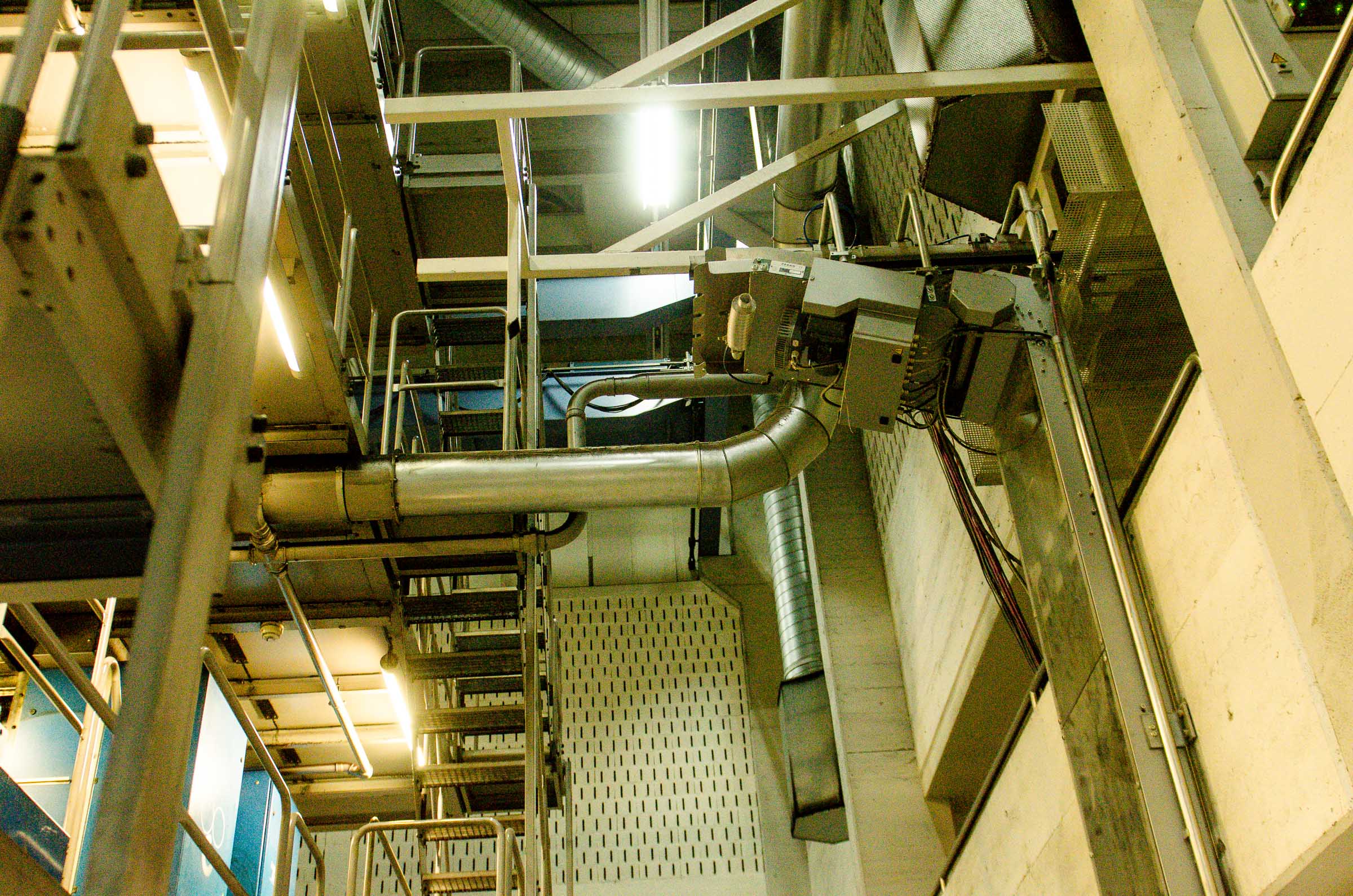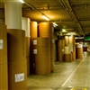 Ein Stockwerk tiefer unter der Maschine: Das Papier der ersten Rolle ist aufgebraucht. Automatisch gibt’s Ersatz, die restlichen Meter fallen in den Auffangbehälter und die neue grosse Rolle wird eingespannt.
