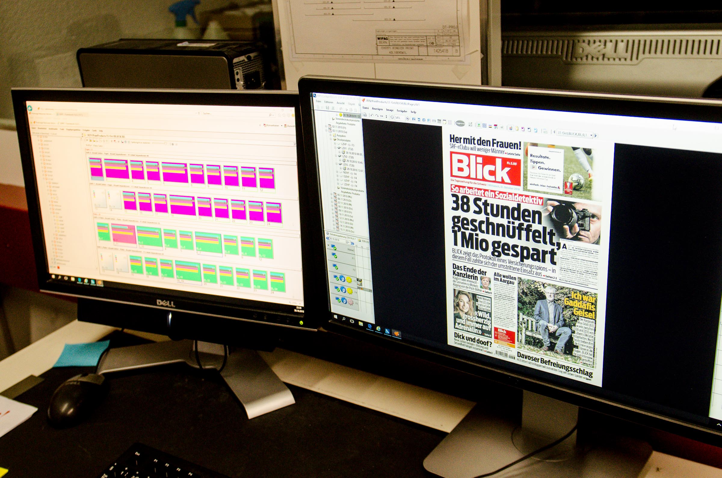 Damit im oberen Stock die Druckmaschinen die 4 Farben auf das soeben eingezogene Papier gebracht werden kann, werden die Druckplatten belichtet. Alle warten noch auf die letzten 2 Seiten. Angekommen sind sie, müssen aber noch auf die Plattenzylinder. Heute will das automatisch gesteuerte System nicht so richtig arbeiten. Die Platten des Blick landen auf der LuzernerZeitung. Zwischen der Umschlagseite des Blick verirrt sich eine Luzerner Platte. Kein Problem, ein Griff und der richtige Ort für die Weiterverarbeitung ist ausgewählt.