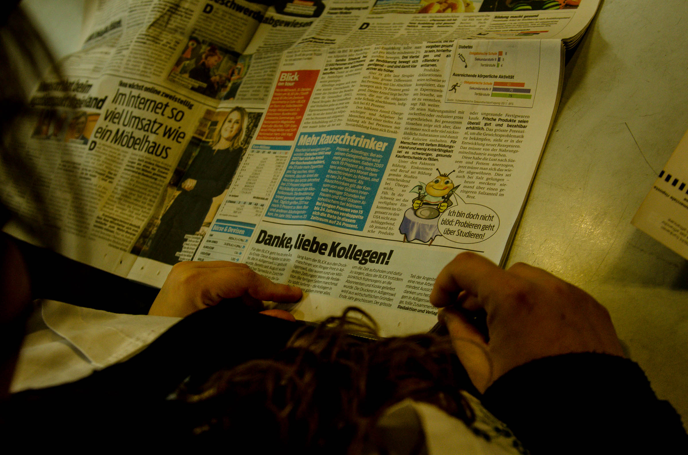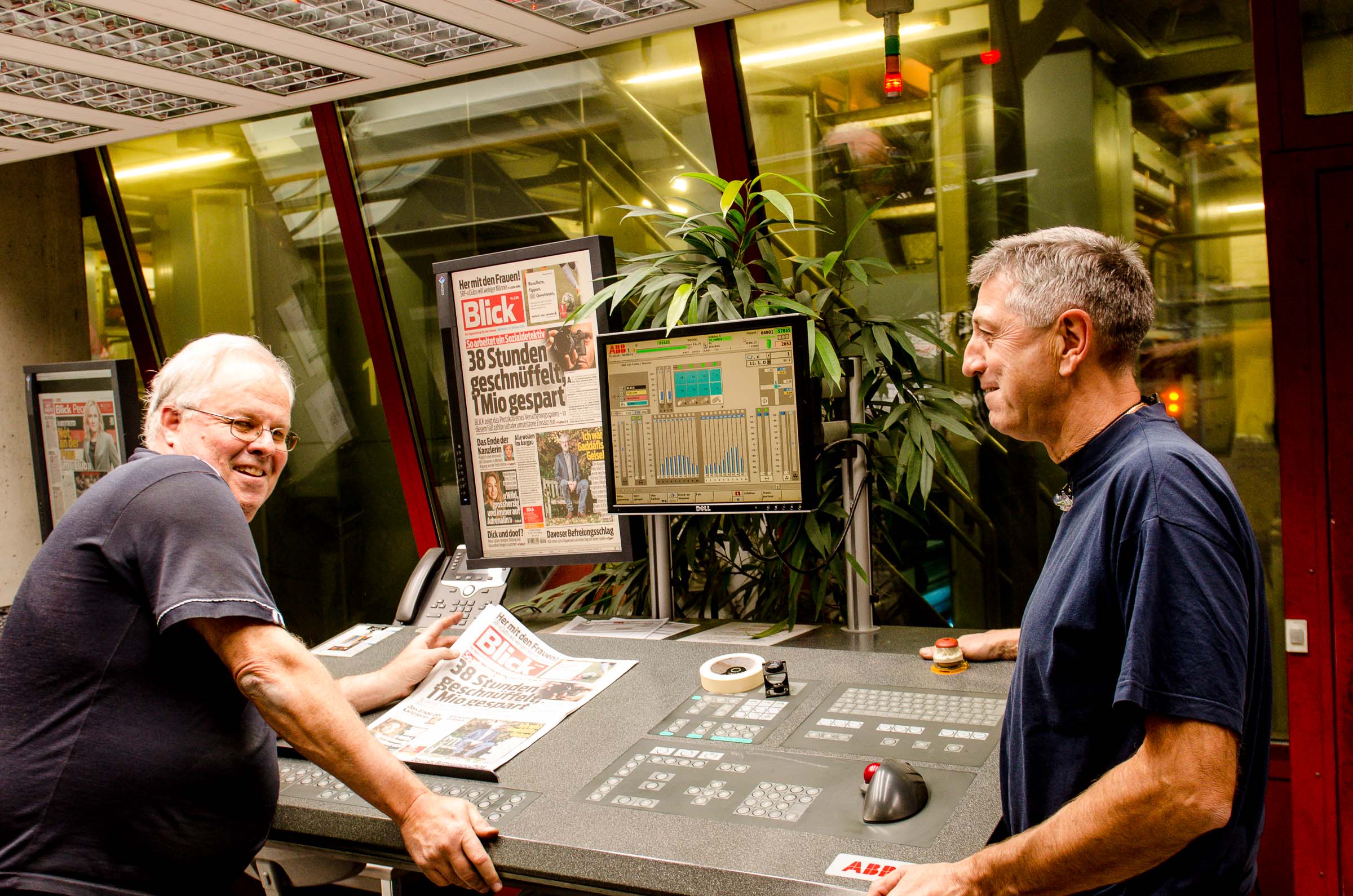 Bruno steht neben dem Regiepult im Kontrollpult. "Noch 6 Minuten - dann ist fertig." Ein Teil der Auflage wird in Zürich gedruckt. Über 60'000 Zeitungen sind in dieser Nacht mit Hochgeschwindigkeit durch die Maschine gelaufen. Einige Exemplare liegen zerknüllt im Altpapier-Sammelwagen. Sie werden morgen entsorgt und der Abbau weiterer Maschinen kann starten.