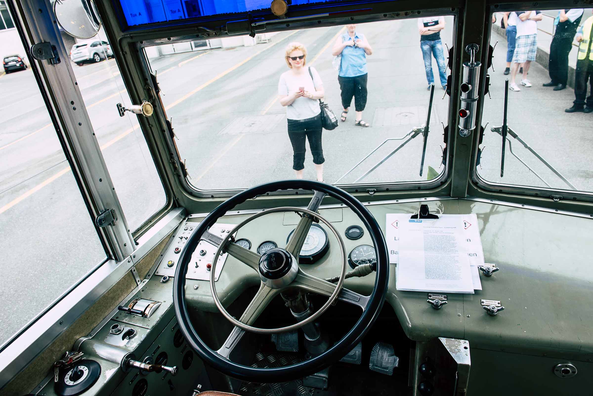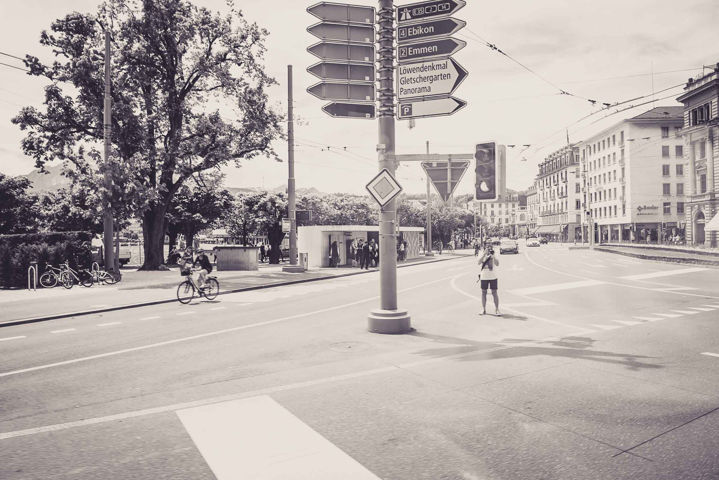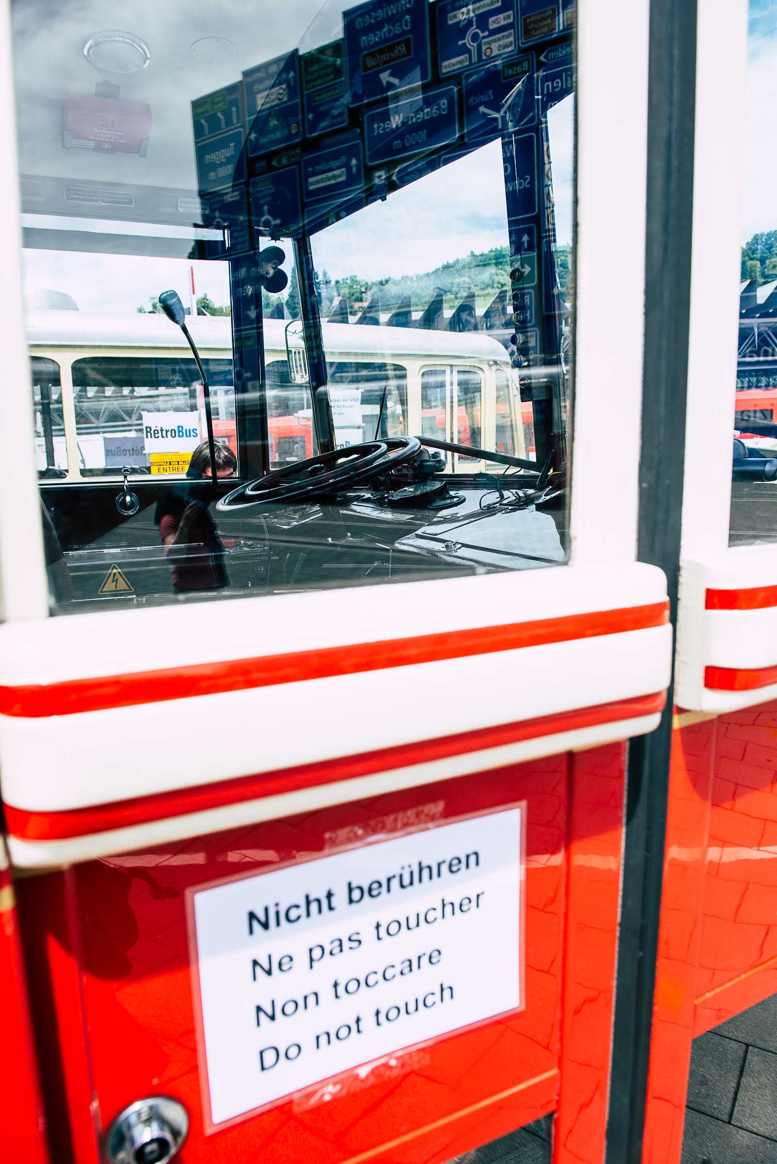 Die Fahrt führt ins Depot im Weinbergli. Ein Halt, Photo hier, Photo da, und weiter durch's innere des Busdepots, eine freie Fahrbahn suchen und vorne wieder raus. Der Buschauffeur darf am Victoriaplatz so richtig ins Steuerrad greifen. Das auch heute Autofahrer (GE), vom Oldtimer in diesem Erscheinungsbild vielleicht geblendet werden zeigt, dass beim Bahnhof, von der Pilatusstrasse her Richtung KKL, nicht mehr abgebogen werden darf. Den 25er lässt es kalt.