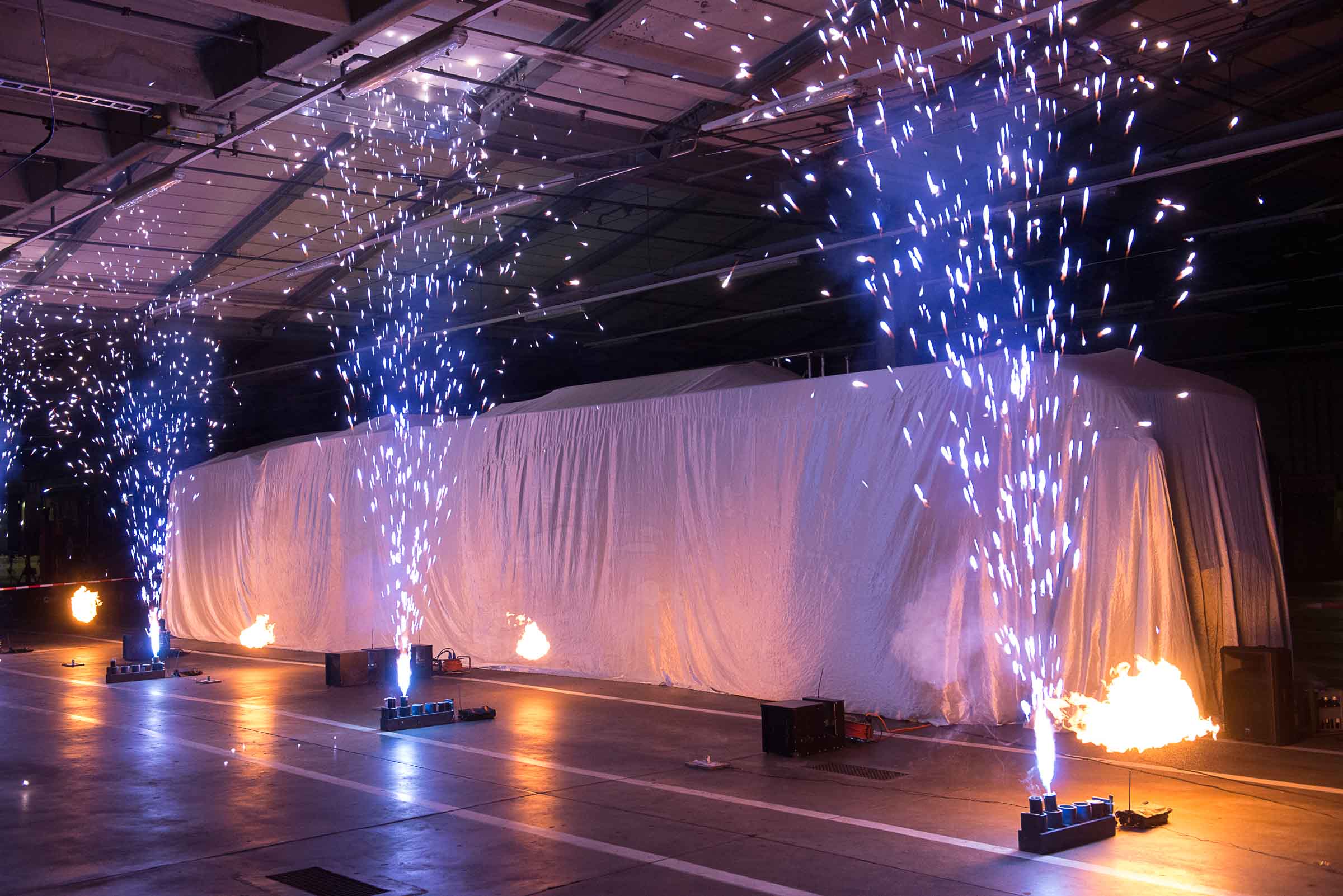 Mit der feuertechnischen Begrüßung durch die Pyromantiker konnten die Mitarbeiter den neu verpackten Bus im Depot in Empfang nehmen.