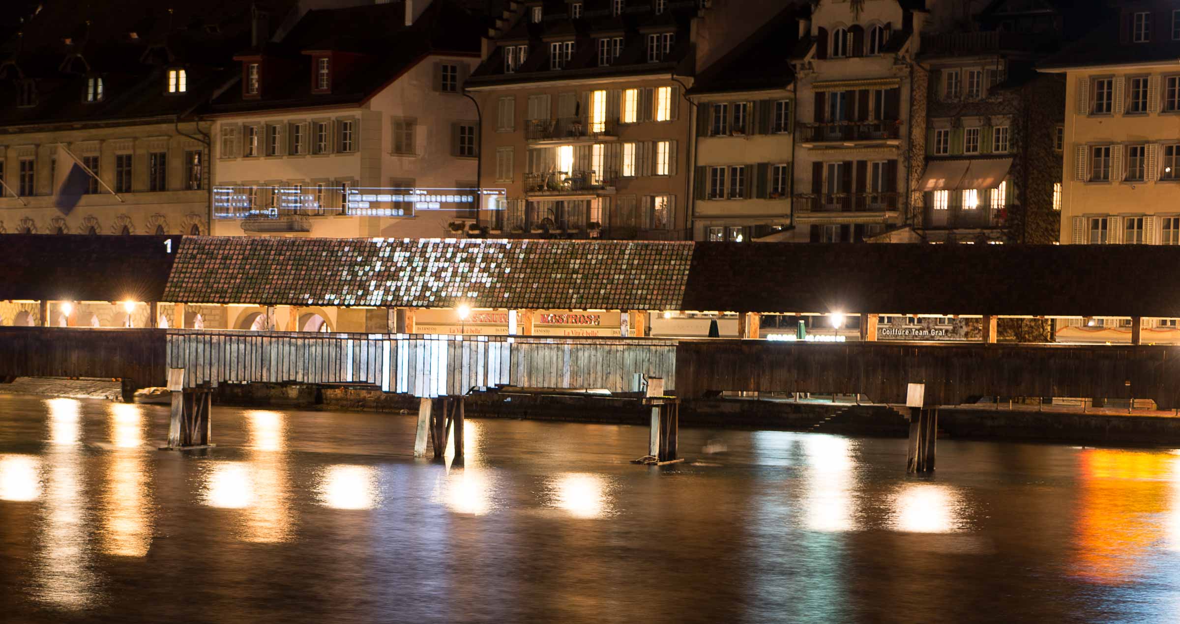 Anstatt dass zu dieser Jahreszeit Schnee auf der Kapellbrücke in Luzern liegt, zaubert der Gewinner des Wettbewerbs, zur Illumination des Wahrzeichen von Luzern, den Lichtkegel auf die Brücke.