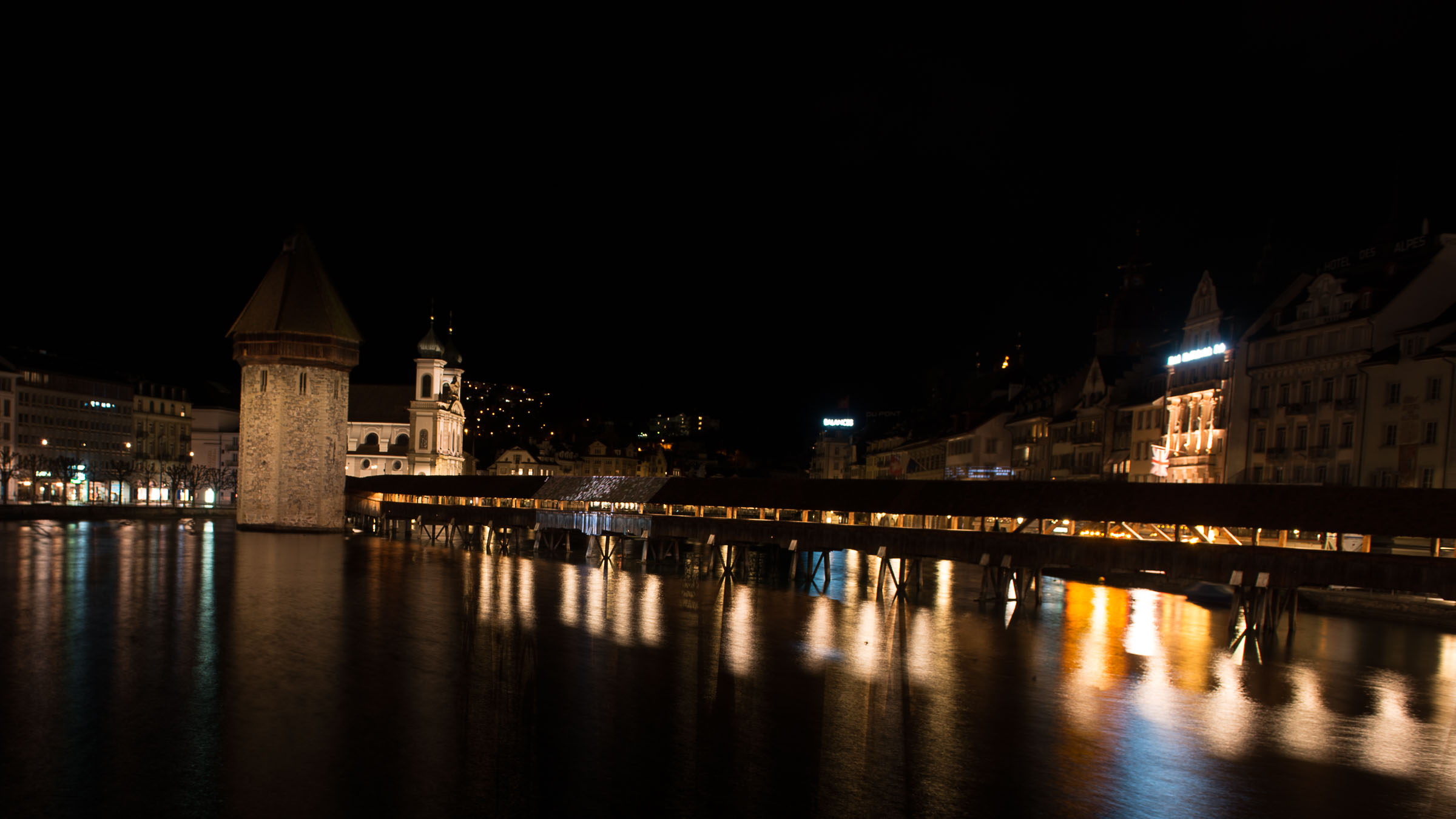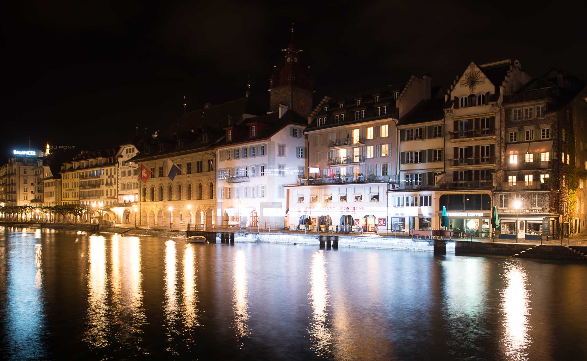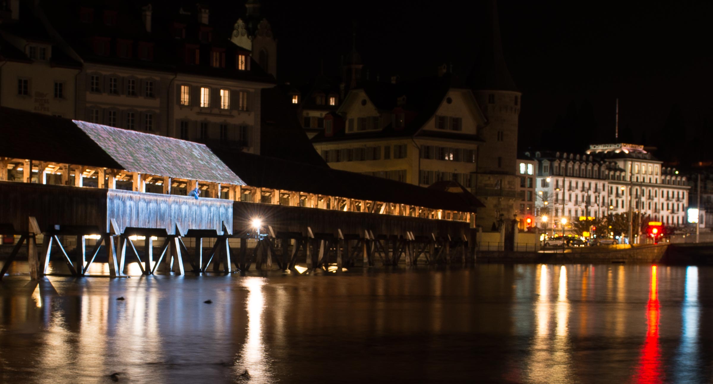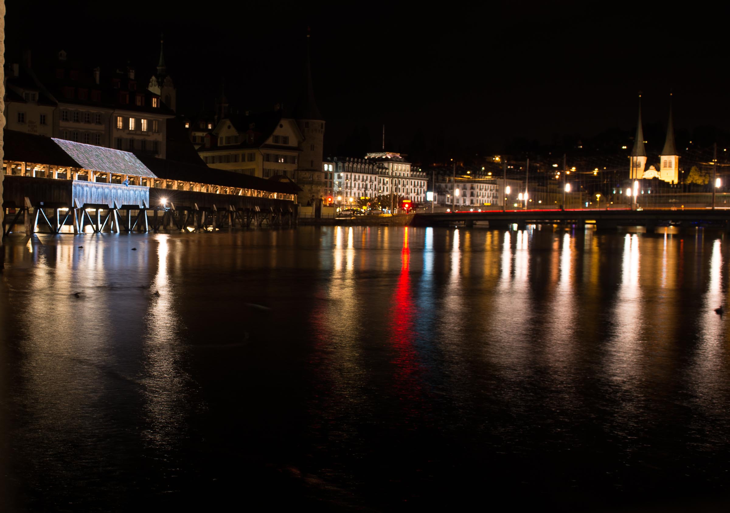 Liegt es vielleicht an den auffälligen Leuchtreklamen die von einigen Häusern ihr Licht auf die Reuss werfen und der Licht Inszenierung der Kapellbrücke die Show stehlen?