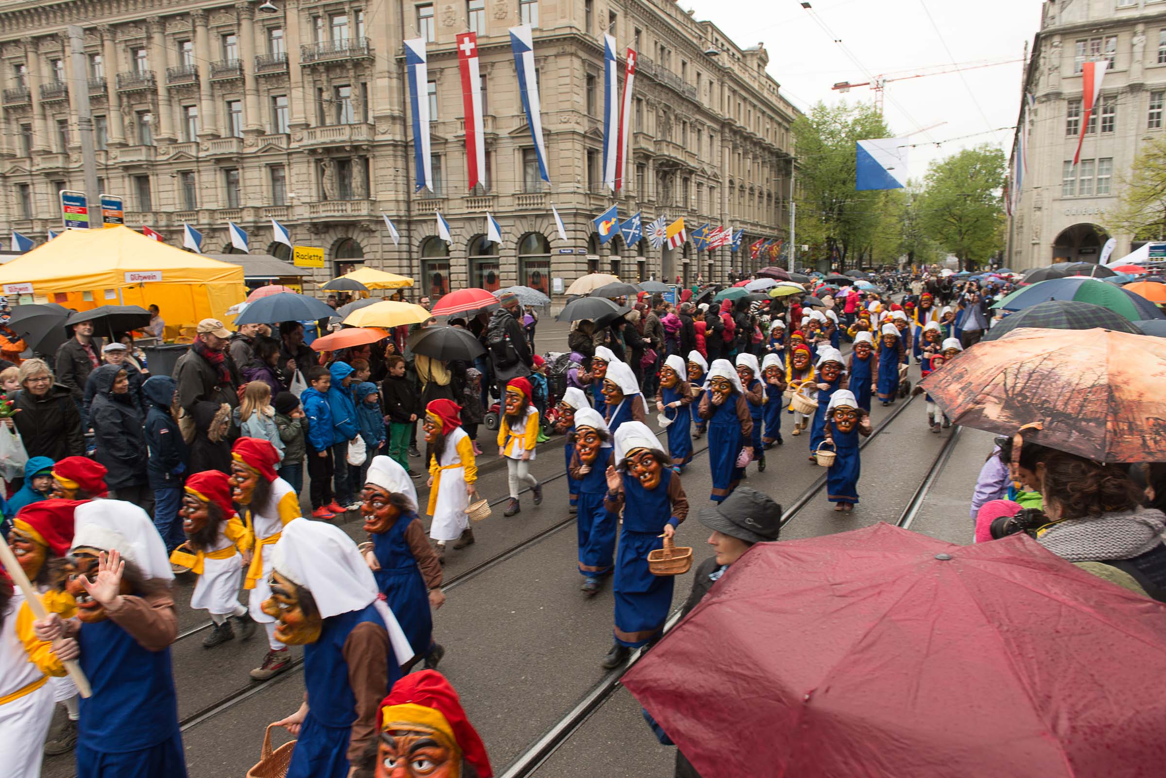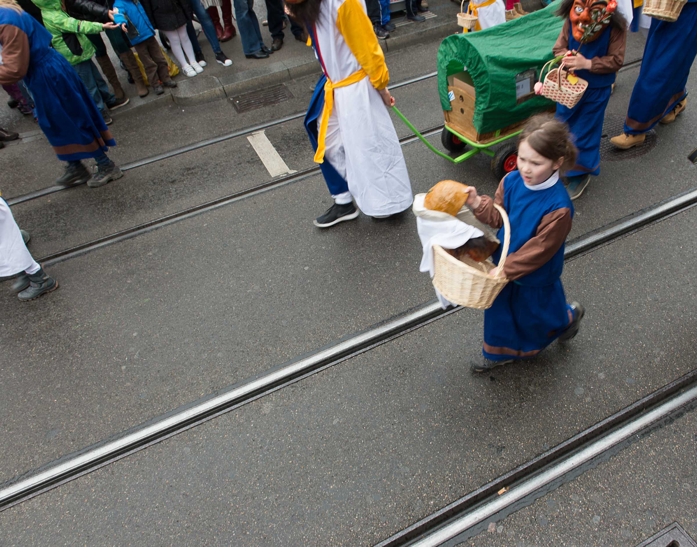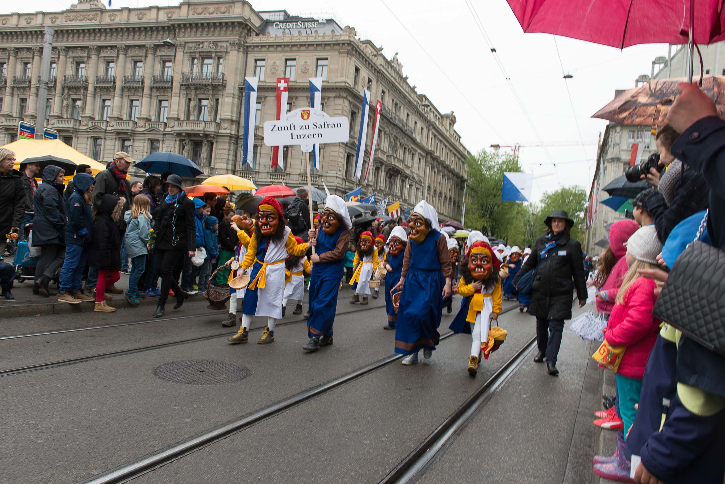 Den Kinderumzug führen 60 mit Grend verkleidete Lozärner Kinder an. Von den 2680 Kindern flanieren die Lozärner, ungeachtet des feuchten Wetters, ohne Regenpellerinen durch die Zürcher Strassen. Ob da der Einfluss der Safran-Väter, bei jedem Wetter an die Fasnacht zu gehen, mitspielt?