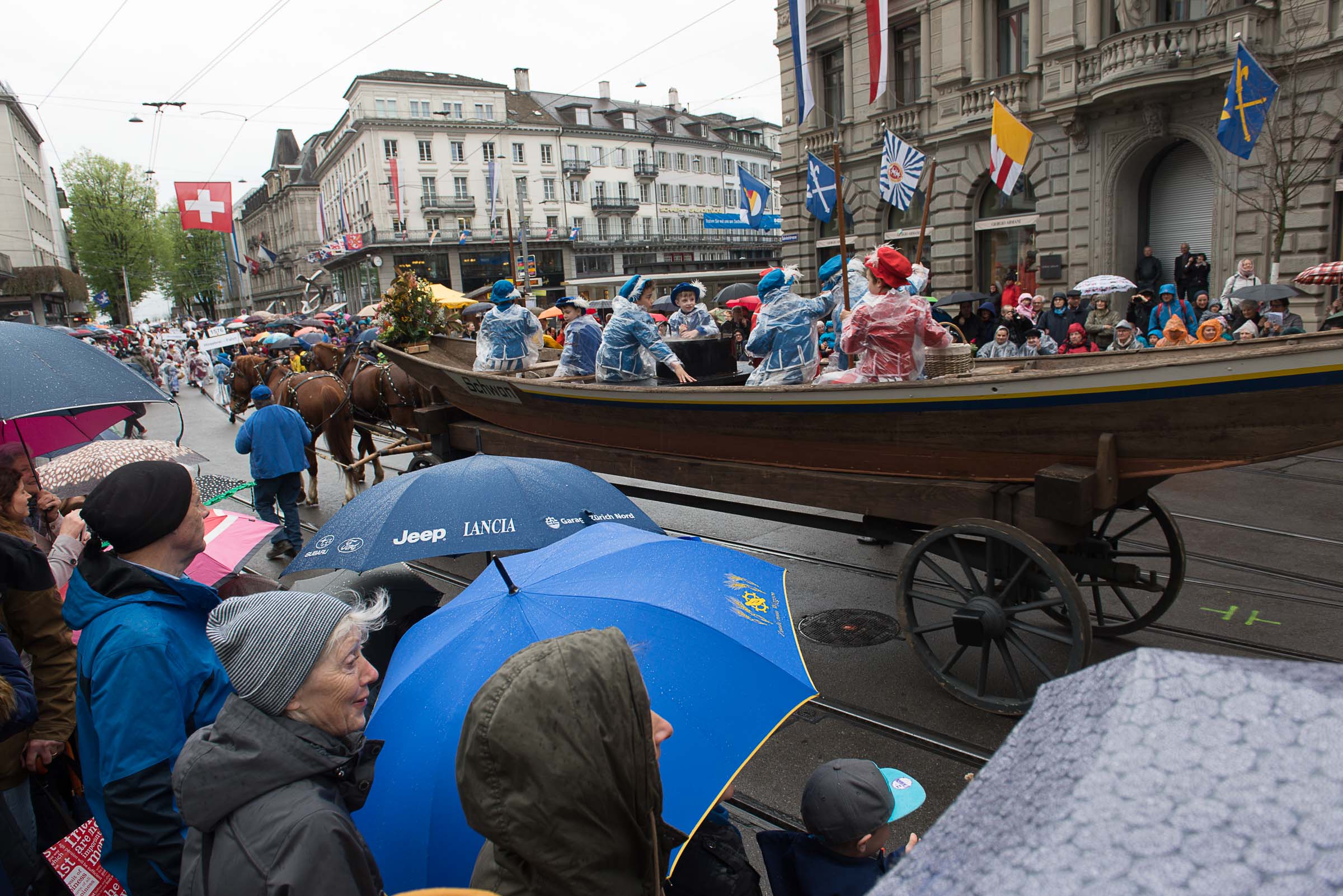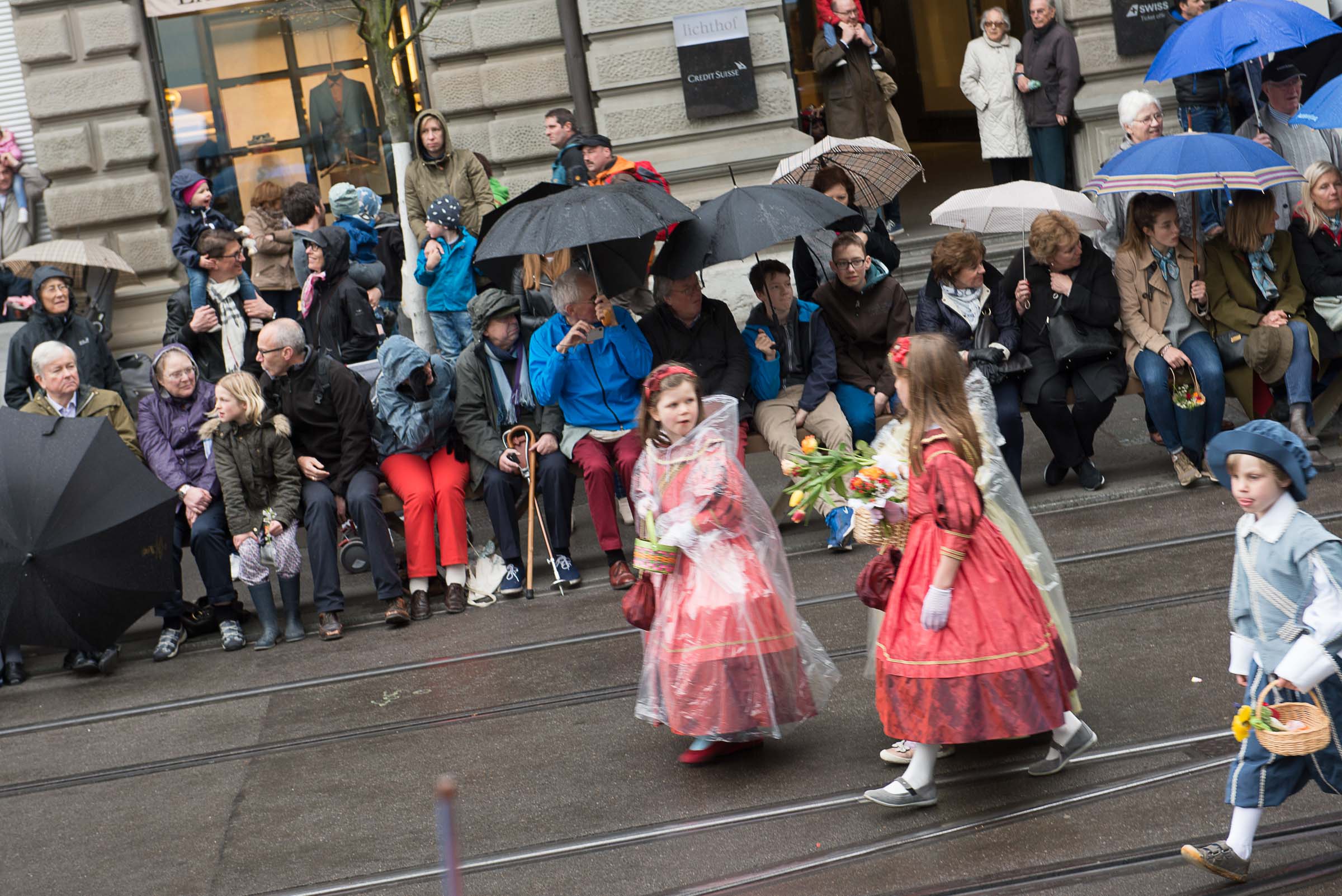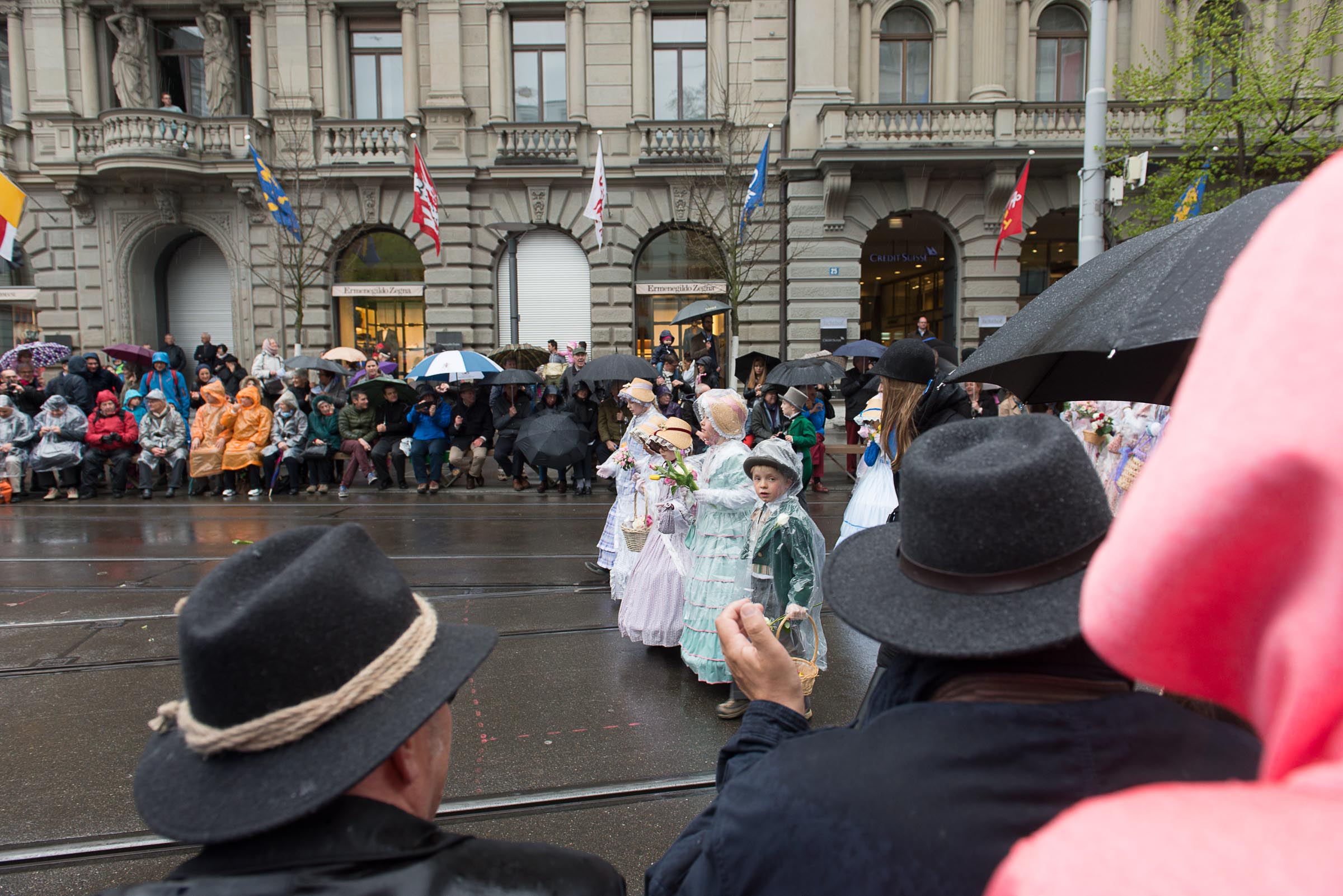 Den Kinderumzug führen 60 mit Grend verkleidete Lozärner Kinder an. Von den 2680 Kindern flanieren die Lozärner, ungeachtet des feuchten Wetters, ohne Regenpellerinen durch die Zürcher Strassen. Ob da der Einfluss der Safran-Väter, bei jedem Wetter an die Fasnacht zu gehen, mitspielt?