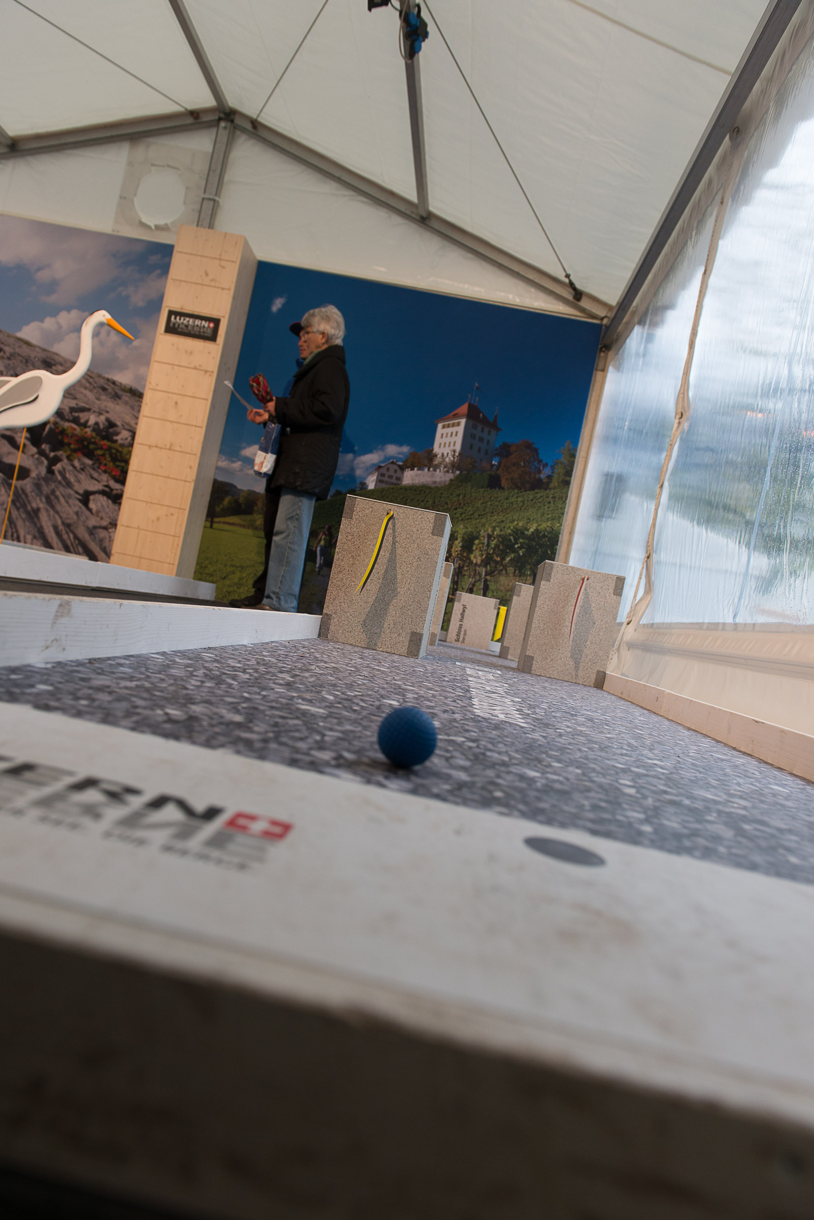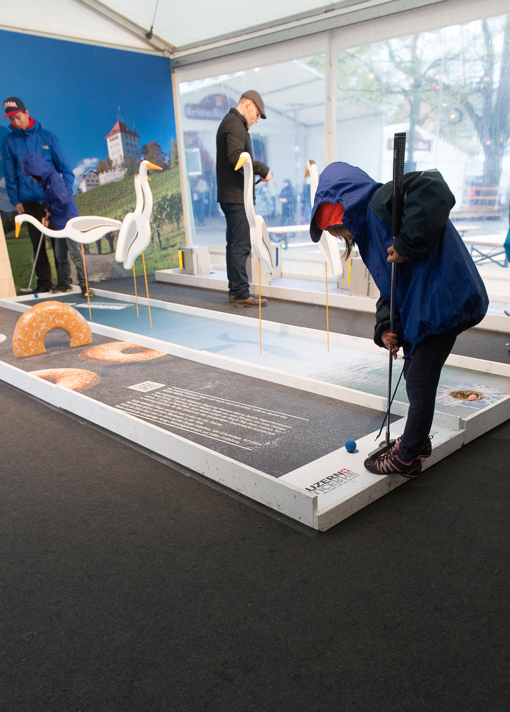 Im Indoor-Minigolf spielt man zwischen Willisauer Ringli und Schwänen oder trifft mit dem Ball direkt aufs Schloss Heidegg. Oder man sitzt auf die Rigibank und lässt sich als Einzelmaske oder Gruppe photographieren und reiht sich in die über 900 anderen Rigi Besucher Portrait ein, die schon ausgedruckt wurden.