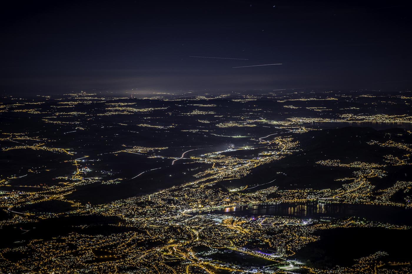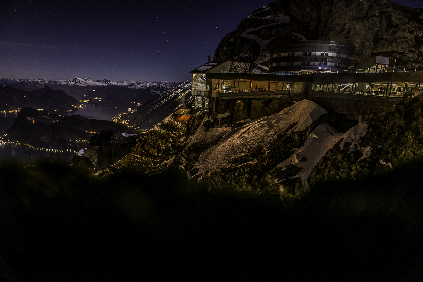 Ab 1. September 2014 ist dieses Photo Nostalgie, die Luftseilbahn auf den Pilatus wird durch eine neue „Helikopter-Seilbahn“ ersetzt. Die Gäste werden in Zukunft das Gefühl haben, wie in einem grossen Helikopter-Cockpit möglichst nah am Berg nach oben zu gleiten. Die Sternschnuppen Richtung Gmüetliberg sind die letzten Flugzeuge die vor dem Nachtflugverbot in Zürich landen werden. Knapp die letzte Talfahrt nach 22:00 Uhr nicht verpasst sonst hätte es neben dem 3.6 Gigapixels Photo Panorama