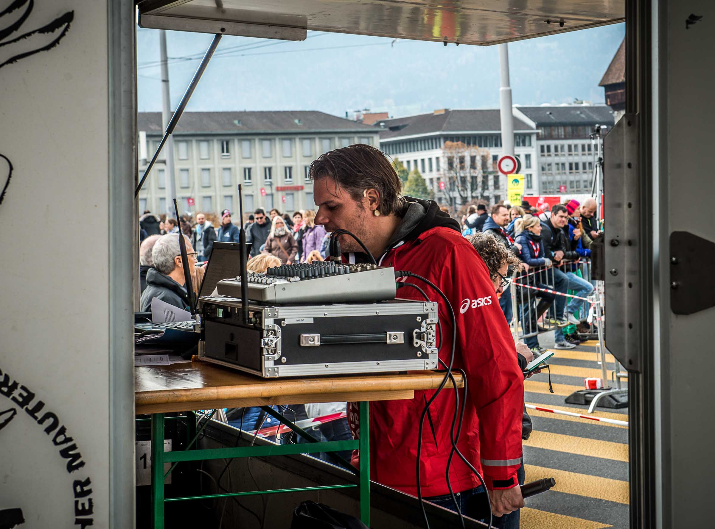 Der Eishockkey-Speaker Thomi feuert am Schwanen die fidelen Fidelitässler an.