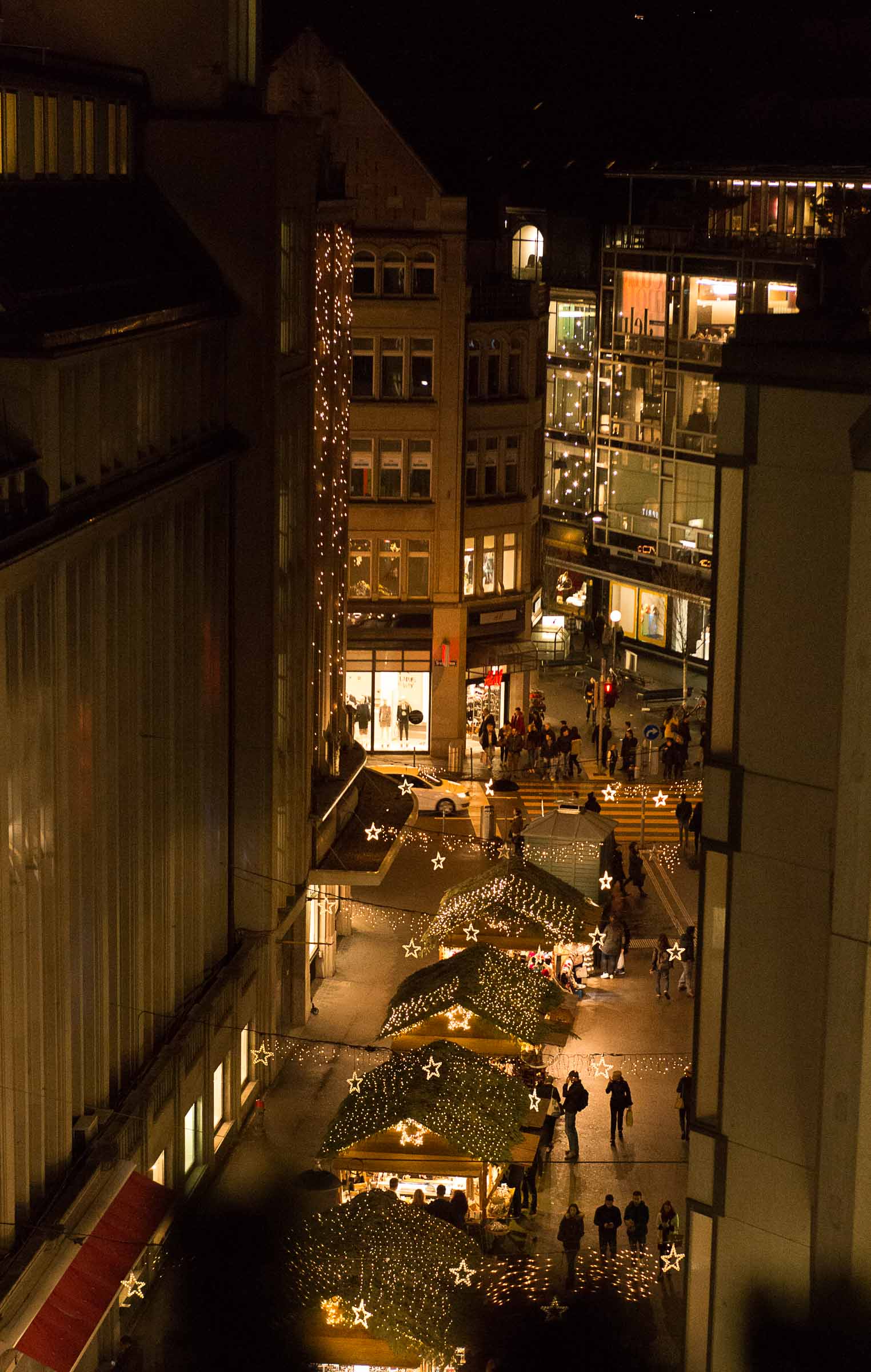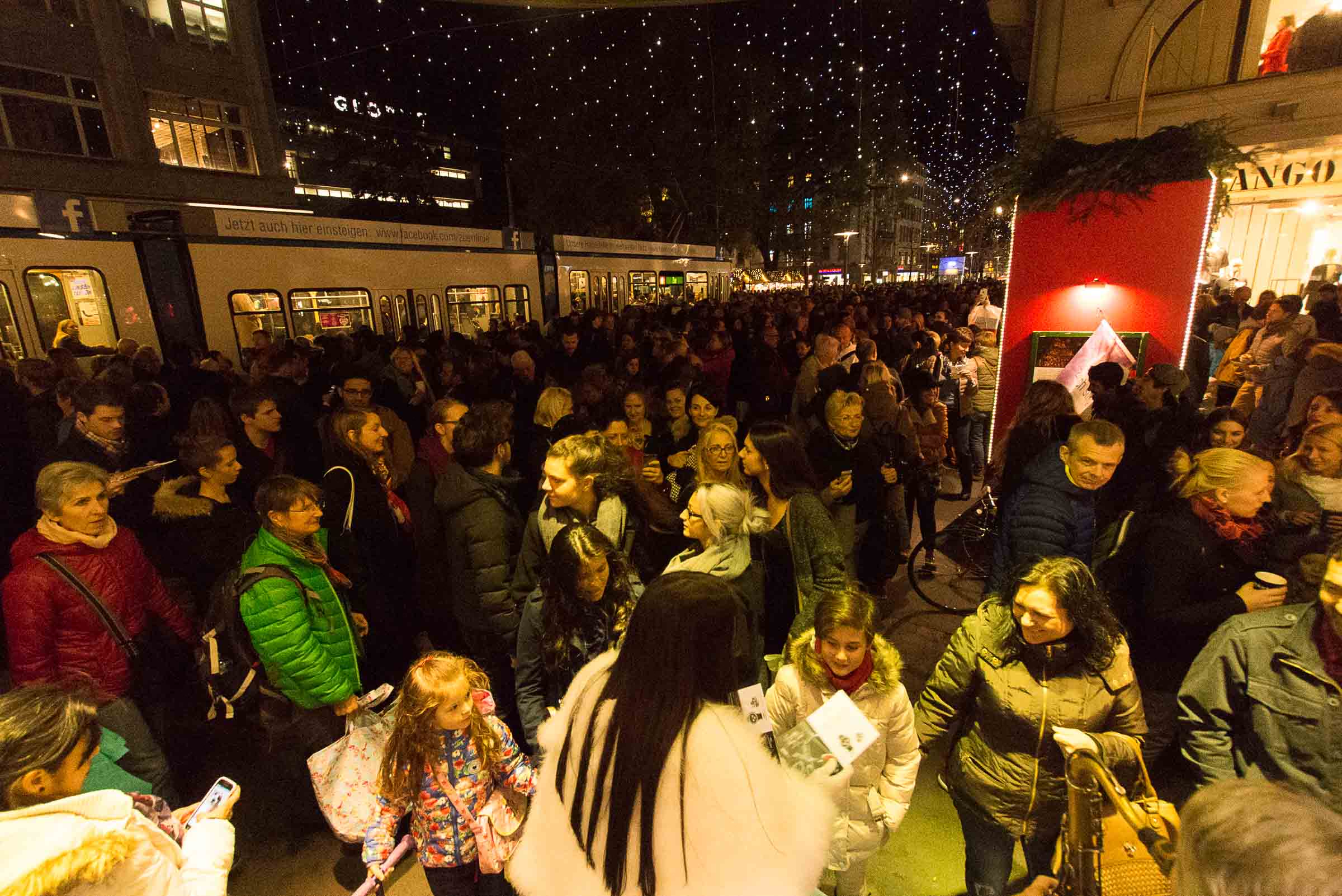 fünf Minuten vor dem Einschalten der Beleuchtung, mit Ellbogen, Schieben und Stossen verbunden. Jeder wollte dabei sein. Diverse Geschäfte hatten ihre Verkaufsaktivitäten auf's Trottoir ausgedehnt. Willkommens Events für geladene Gäste und Besucher laden zum Verweilen ein. Auf der Bühne neben einer grossen Bank, die gerade umgebaut wird, steht das Volk dicht gedrängt auch noch um 21.00 Uhr.