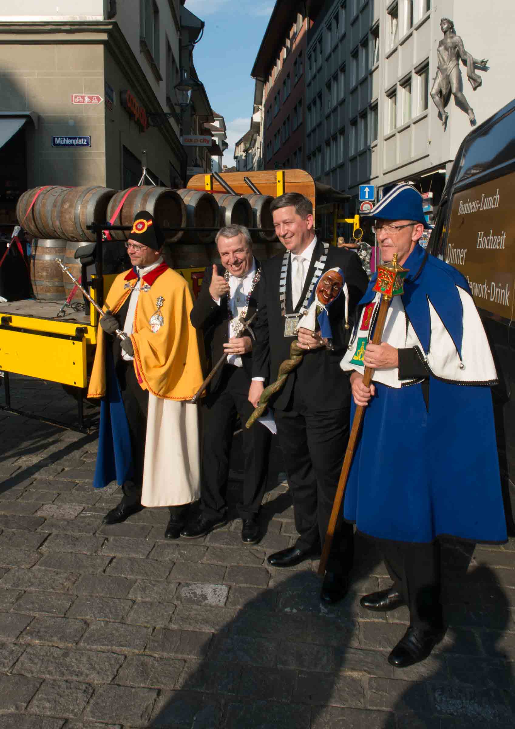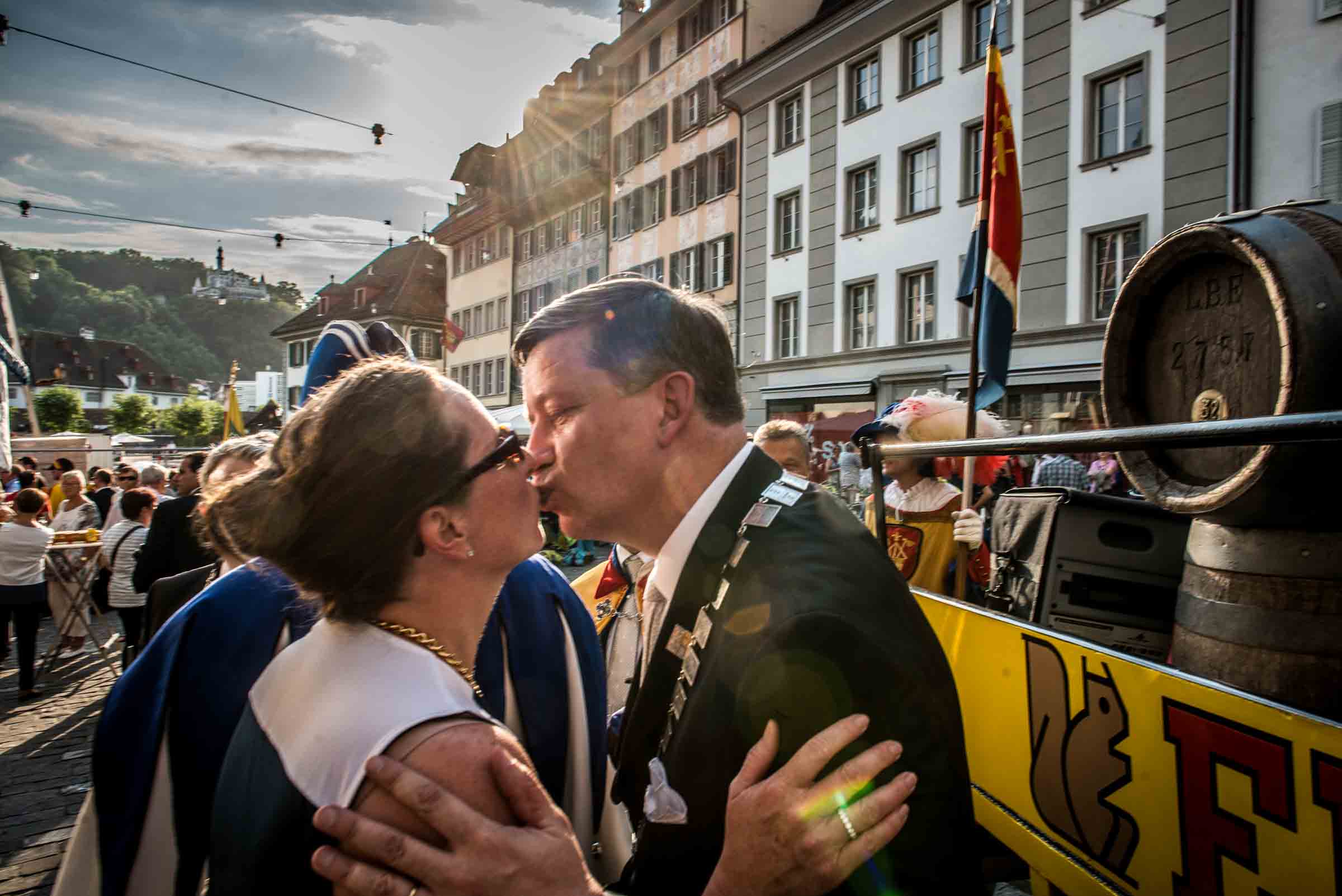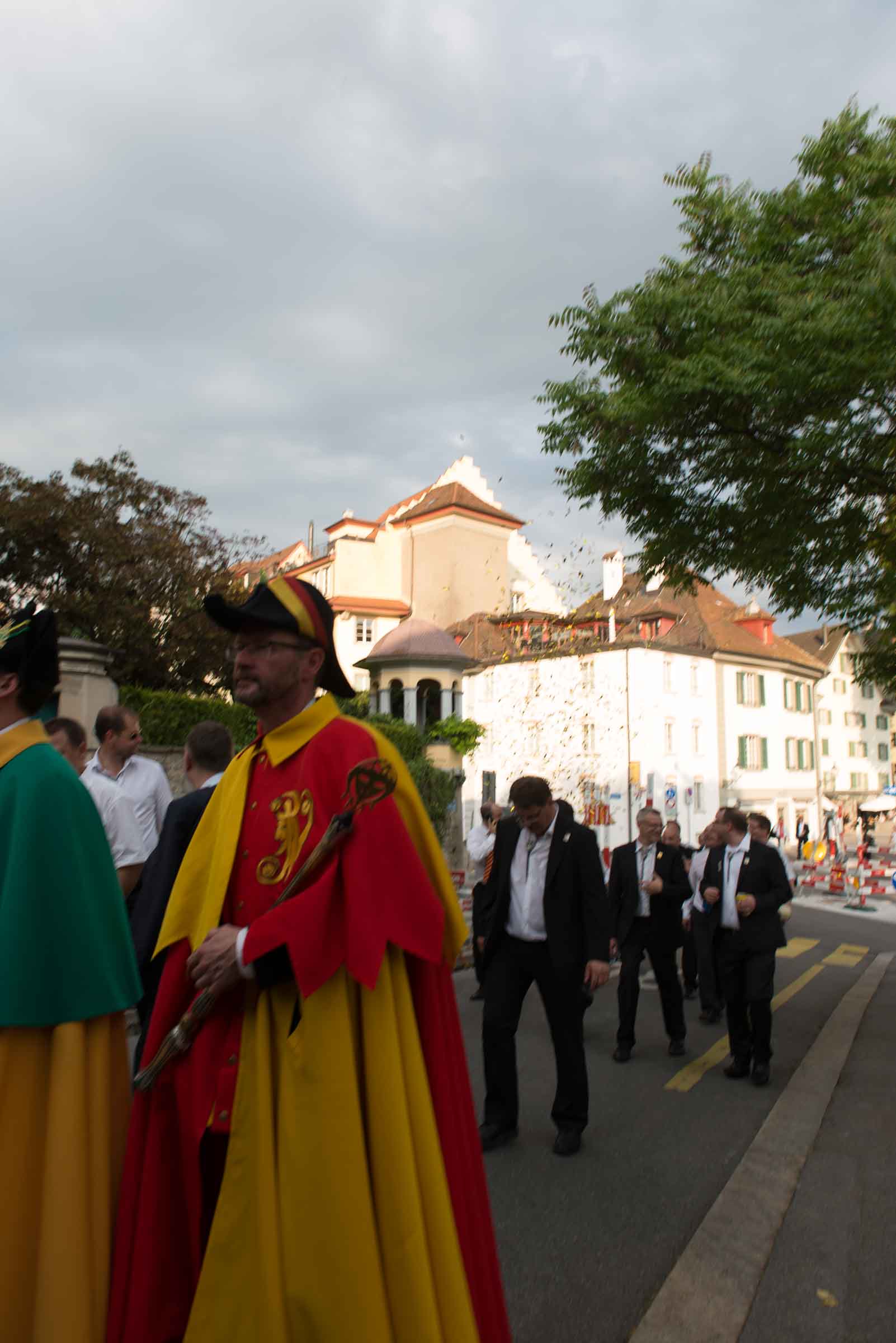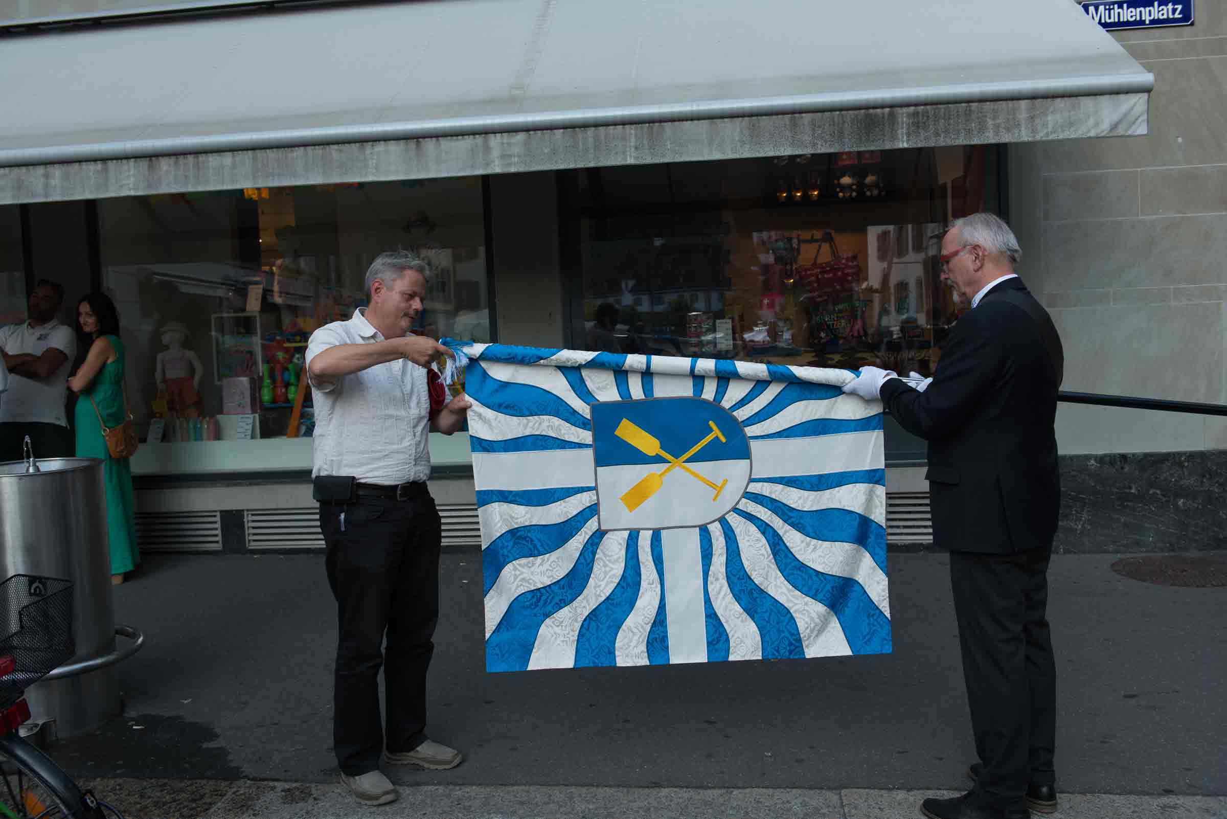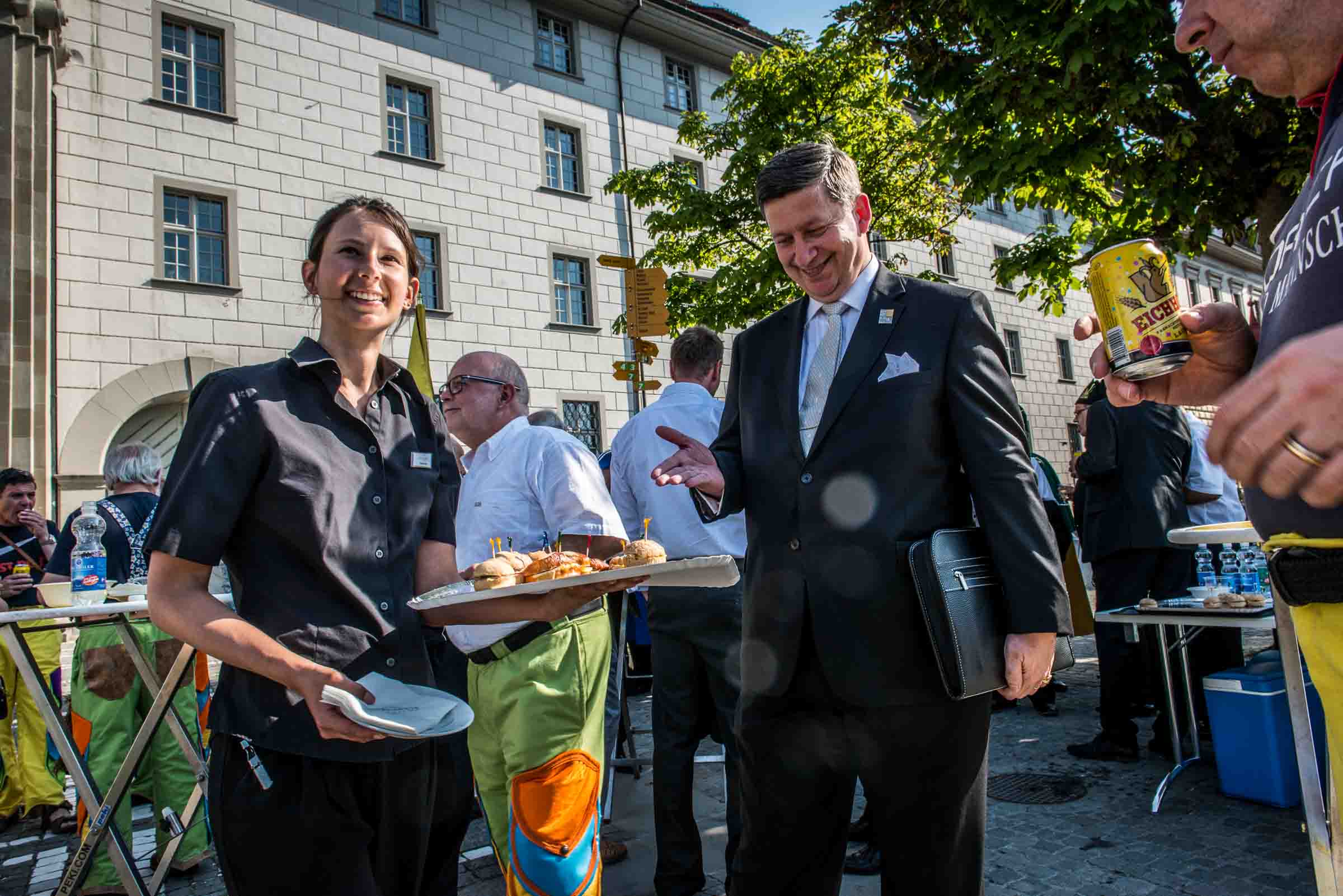 Die nächste Station ist dann wirklich bald erreicht, der Mühlenplatz. Hier endlich werde ich dem neuen Präsidenten vorgesellt. Der Weibel wird eingekleidet. Und hier findet der Apero für die vielen Zaungäste statt.