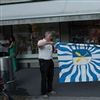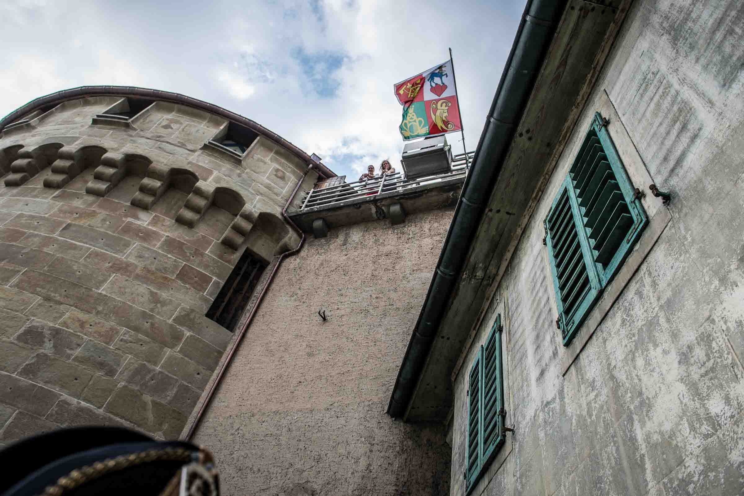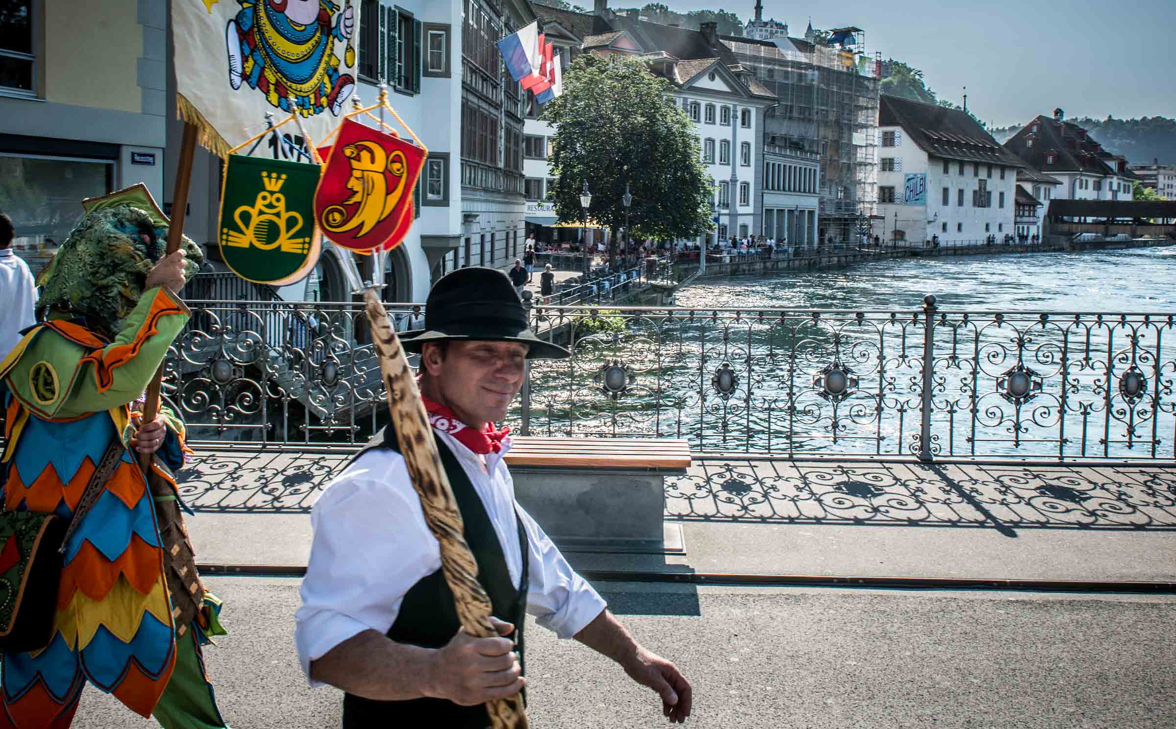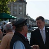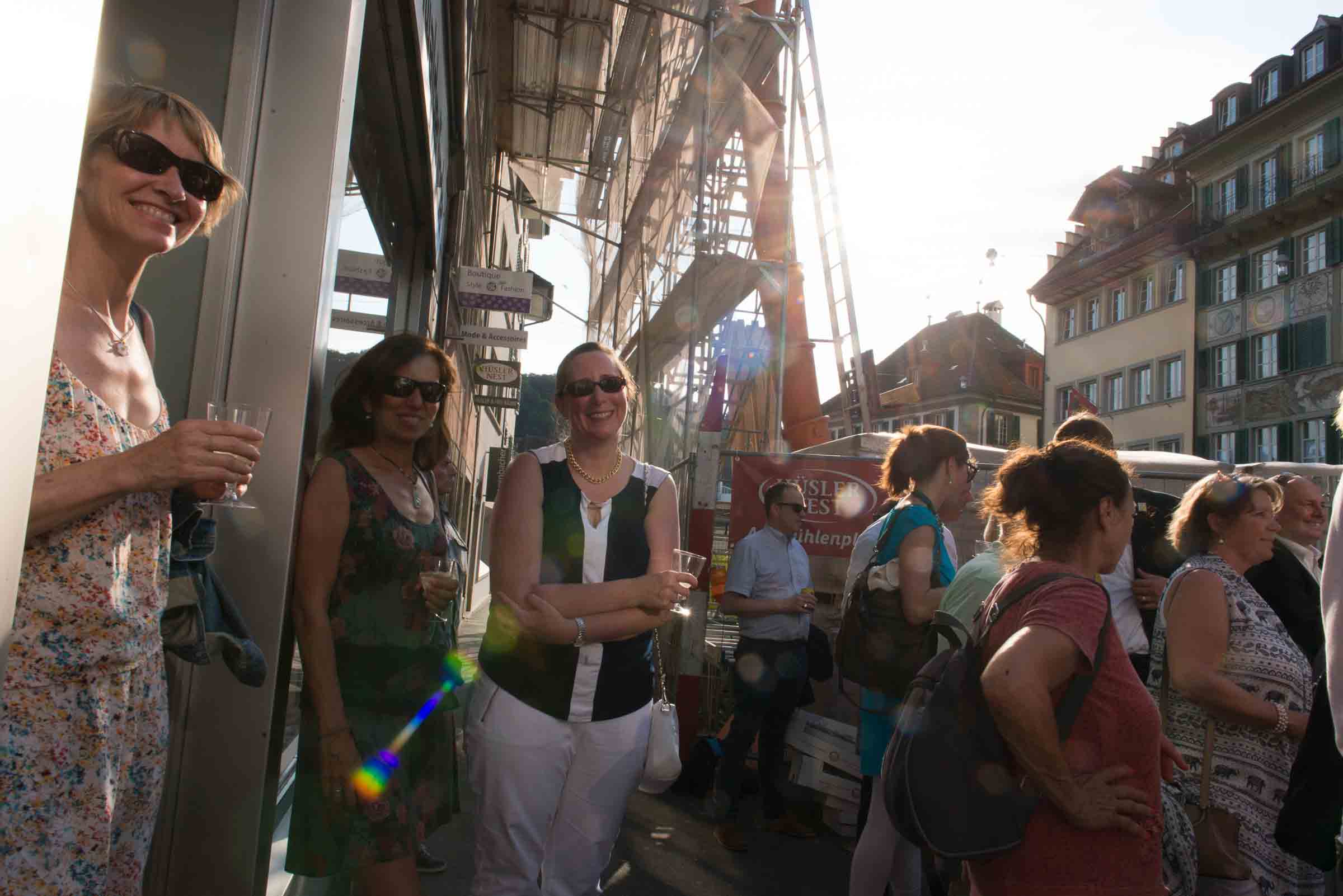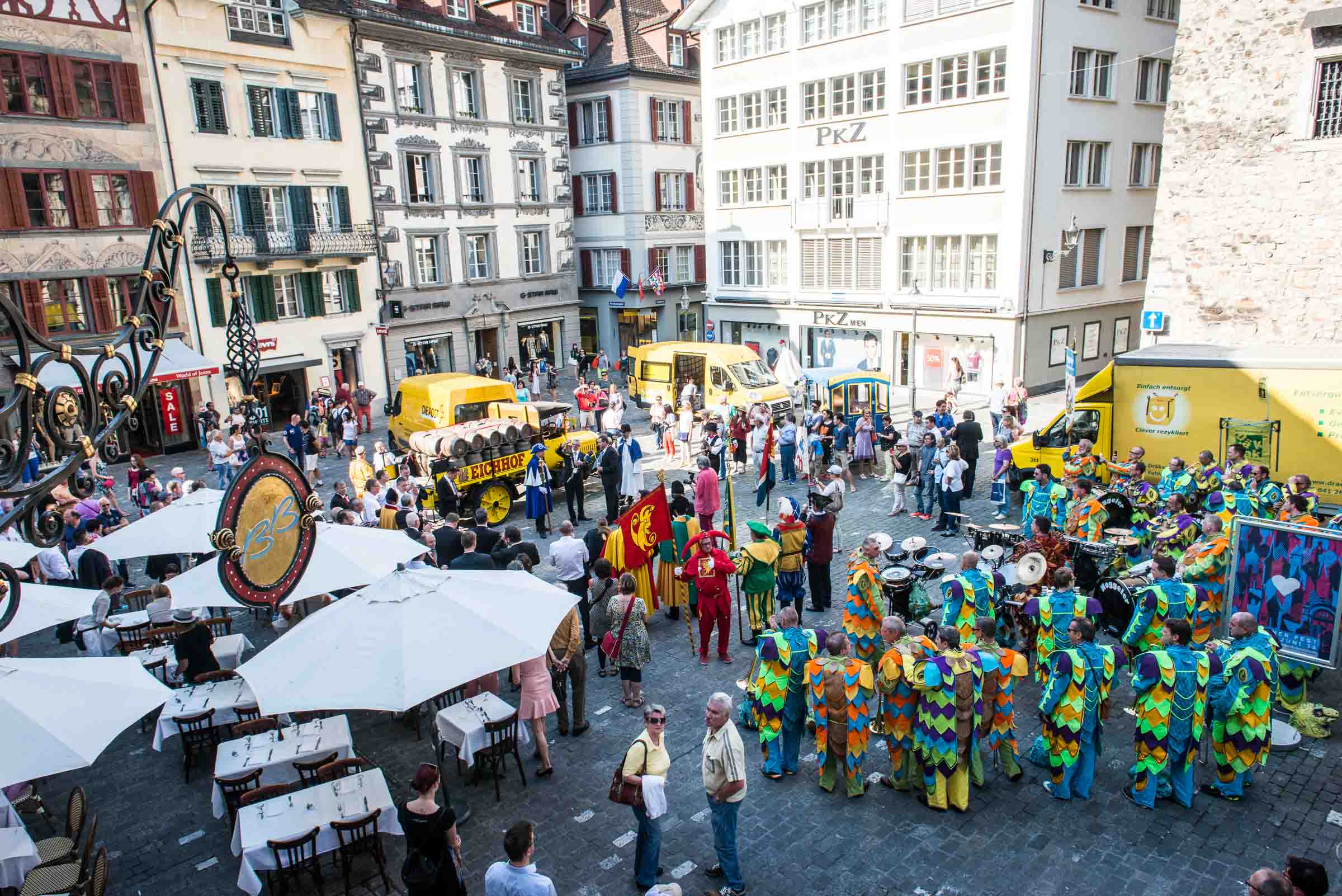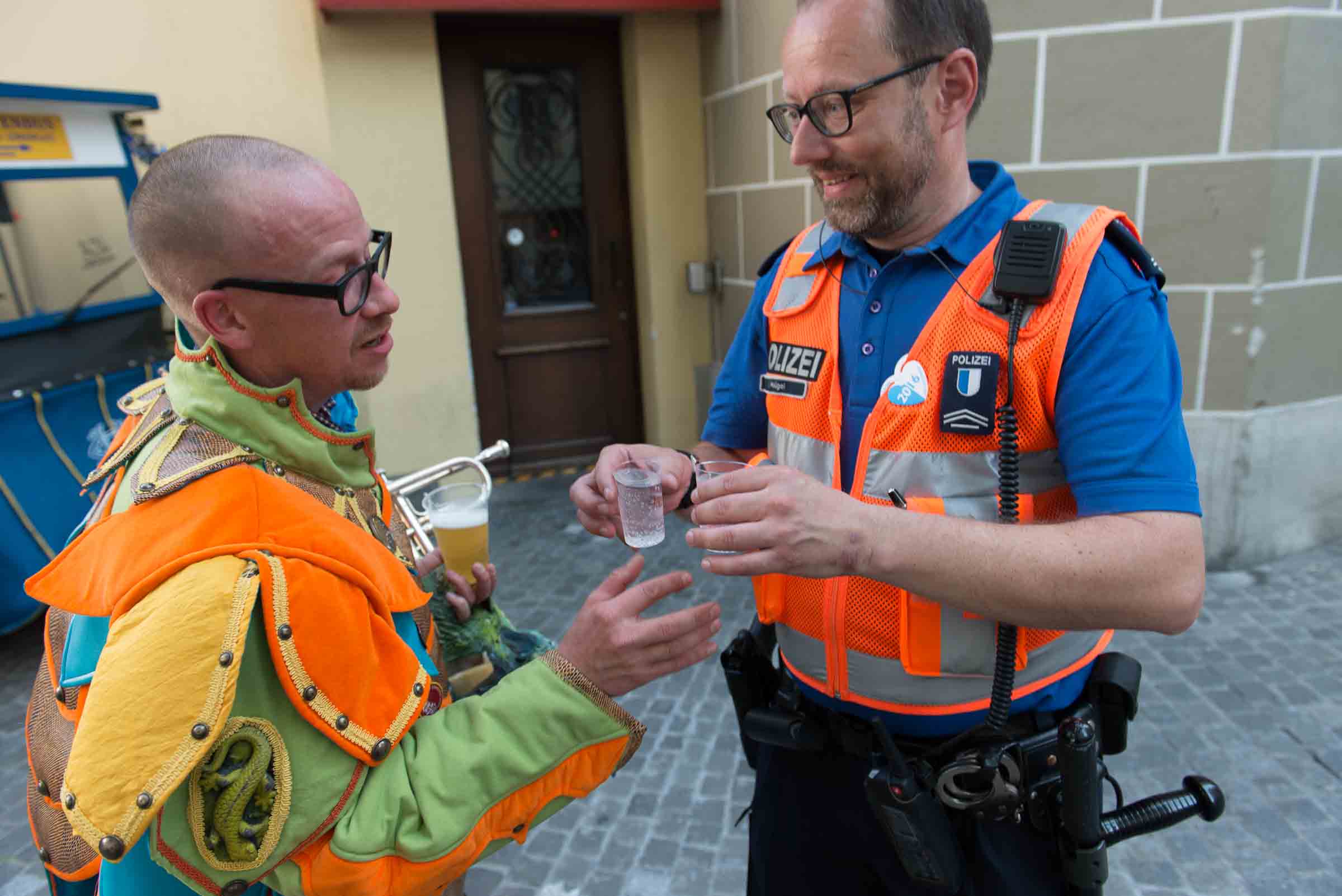 Die nächste Station ist dann wirklich bald erreicht, der Mühlenplatz. Hier endlich werde ich dem neuen Präsidenten vorgesellt. Der Weibel wird eingekleidet. Und hier findet der Apero für die vielen Zaungäste statt.