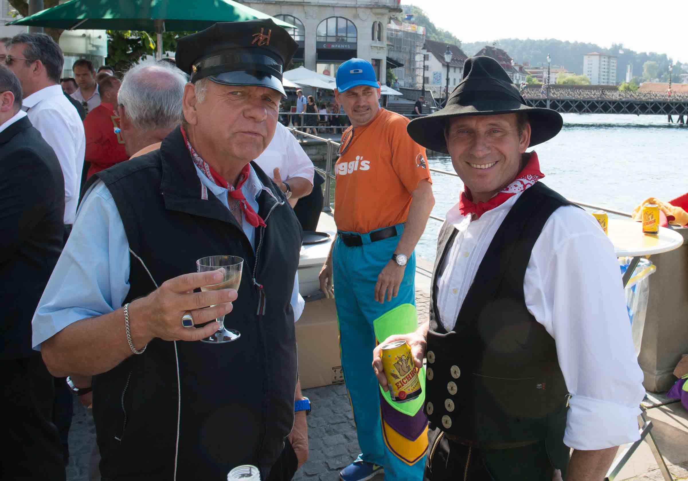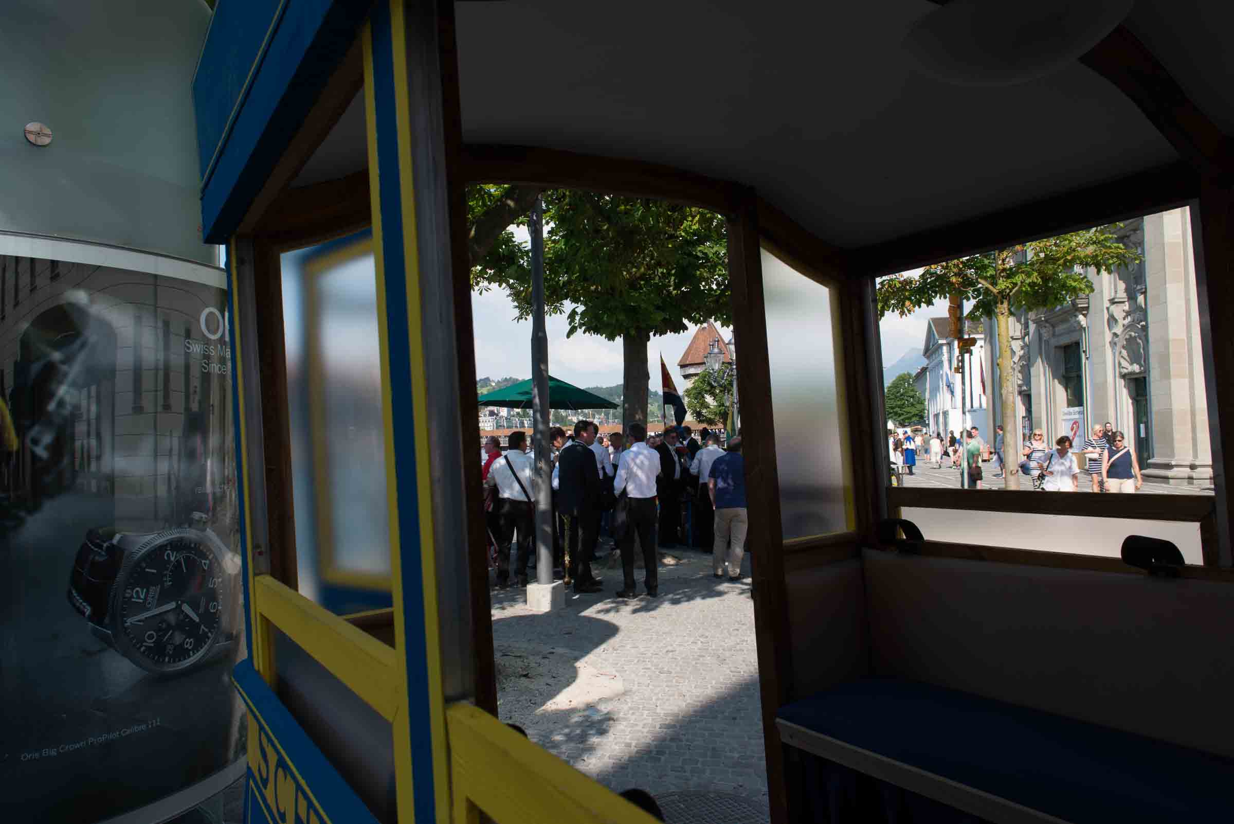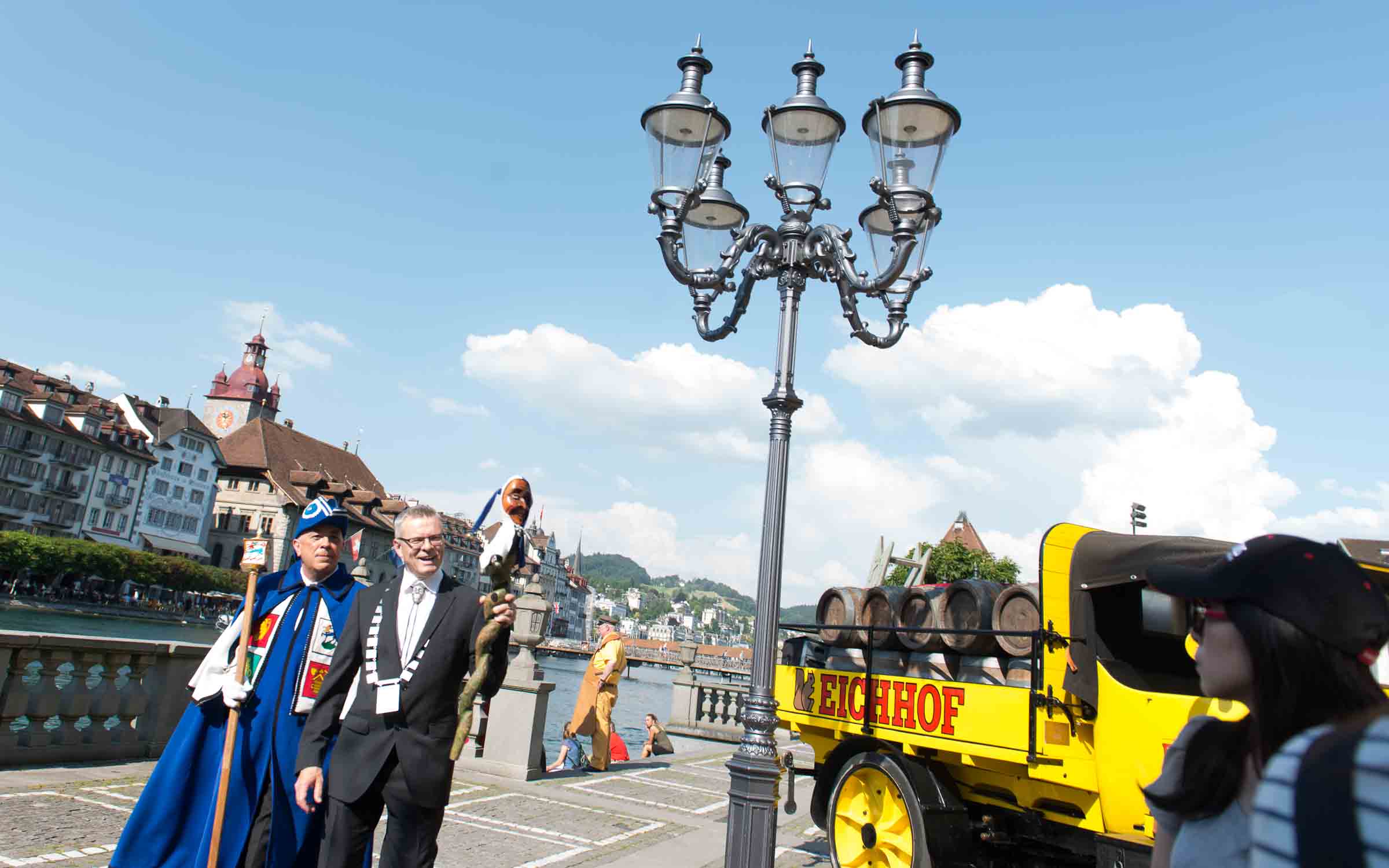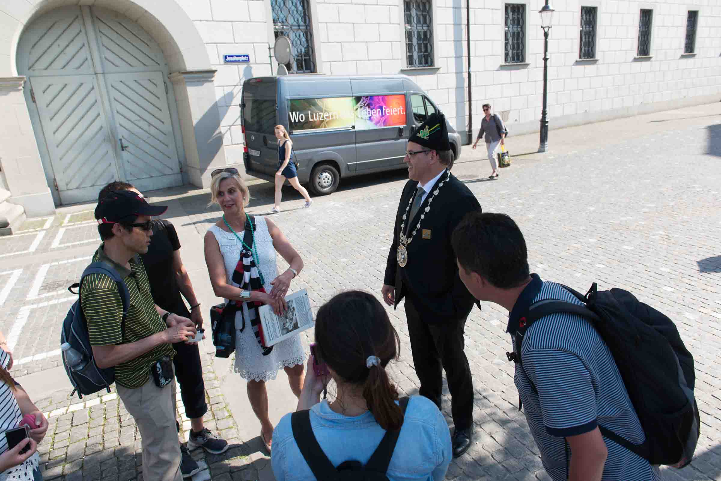 vor der Jesuitenkirche inkl. Apero. Touristen die vorbeiziehen und Einheimische die unsere Chipsli wegschmausen. Hoffentlich reichts für die über 40 aktiven Delegierten, die erwartet werden. Für Nachschub ist gesorgt, der Bierwagen Eichhof, dieses Jahr 100 Jahre jung und mit flotten 29 km/h pro Stunde noch unterwegs, hat noch einige Fässli auf der Ladebrücke für die durstigen Kehlen. Und das Photosujet, alle wollen abgelichtet werden, auch die beiden Weibel in den blauen Gewändern.