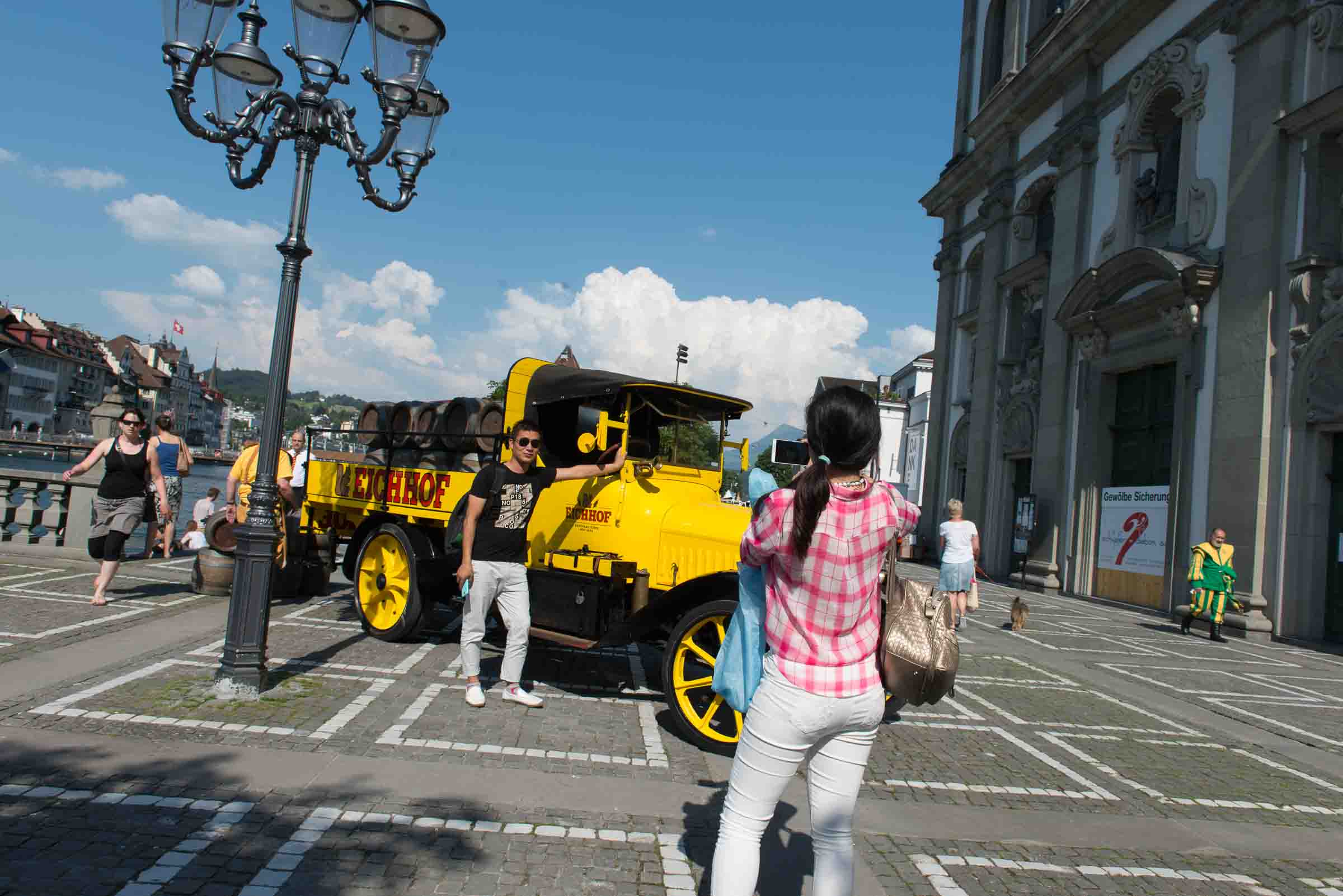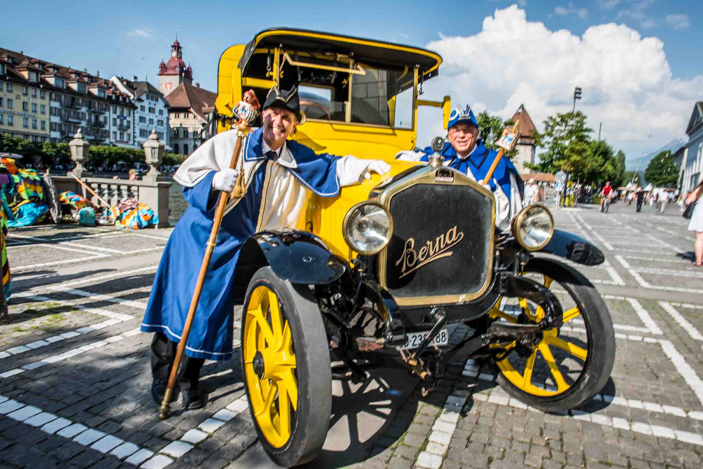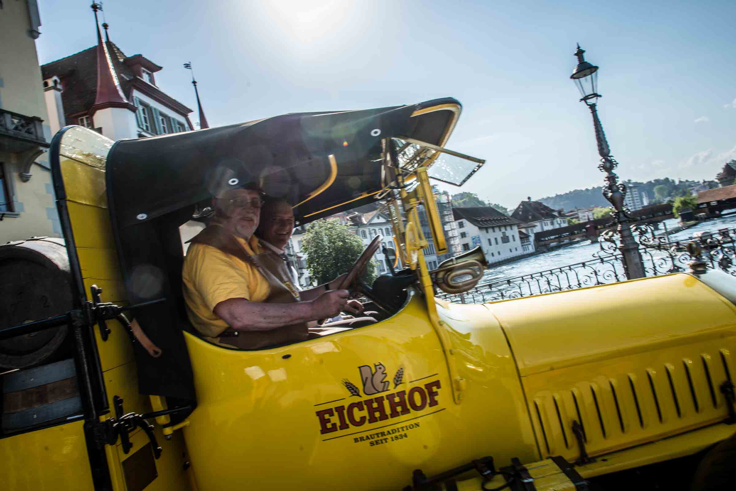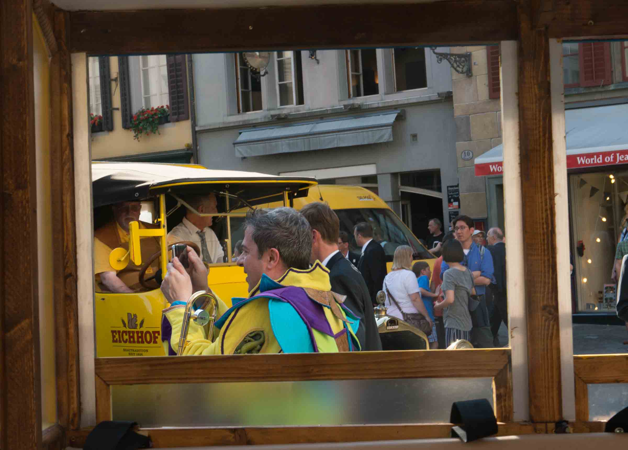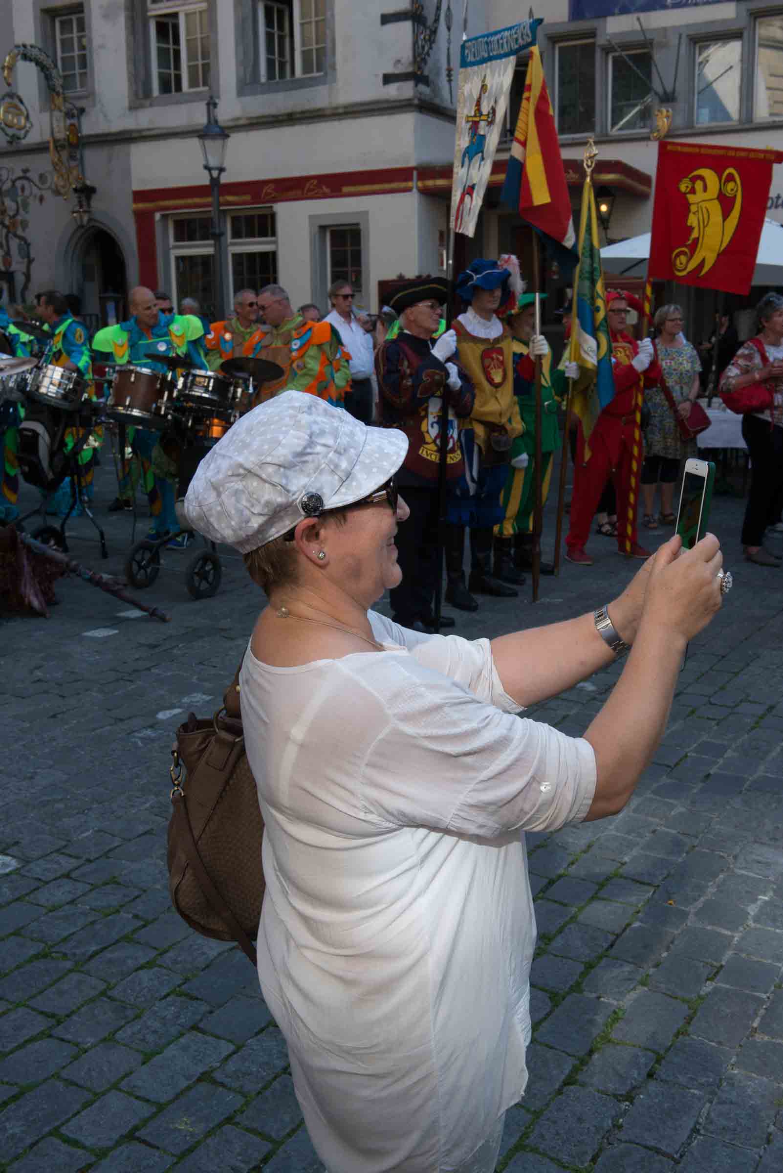 vor der Jesuitenkirche inkl. Apero. Touristen die vorbeiziehen und Einheimische die unsere Chipsli wegschmausen. Hoffentlich reichts für die über 40 aktiven Delegierten, die erwartet werden. Für Nachschub ist gesorgt, der Bierwagen Eichhof, dieses Jahr 100 Jahre jung und mit flotten 29 km/h pro Stunde noch unterwegs, hat noch einige Fässli auf der Ladebrücke für die durstigen Kehlen. Und das Photosujet, alle wollen abgelichtet werden, auch die beiden Weibel in den blauen Gewändern.