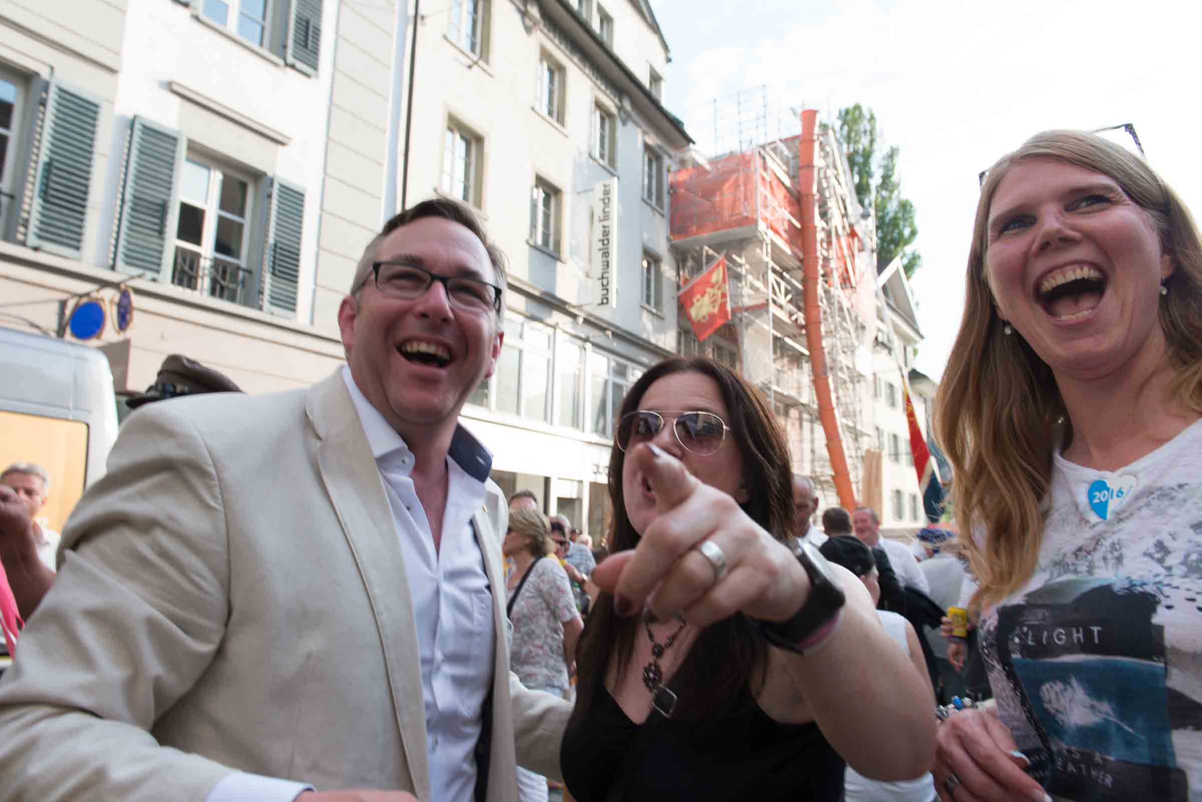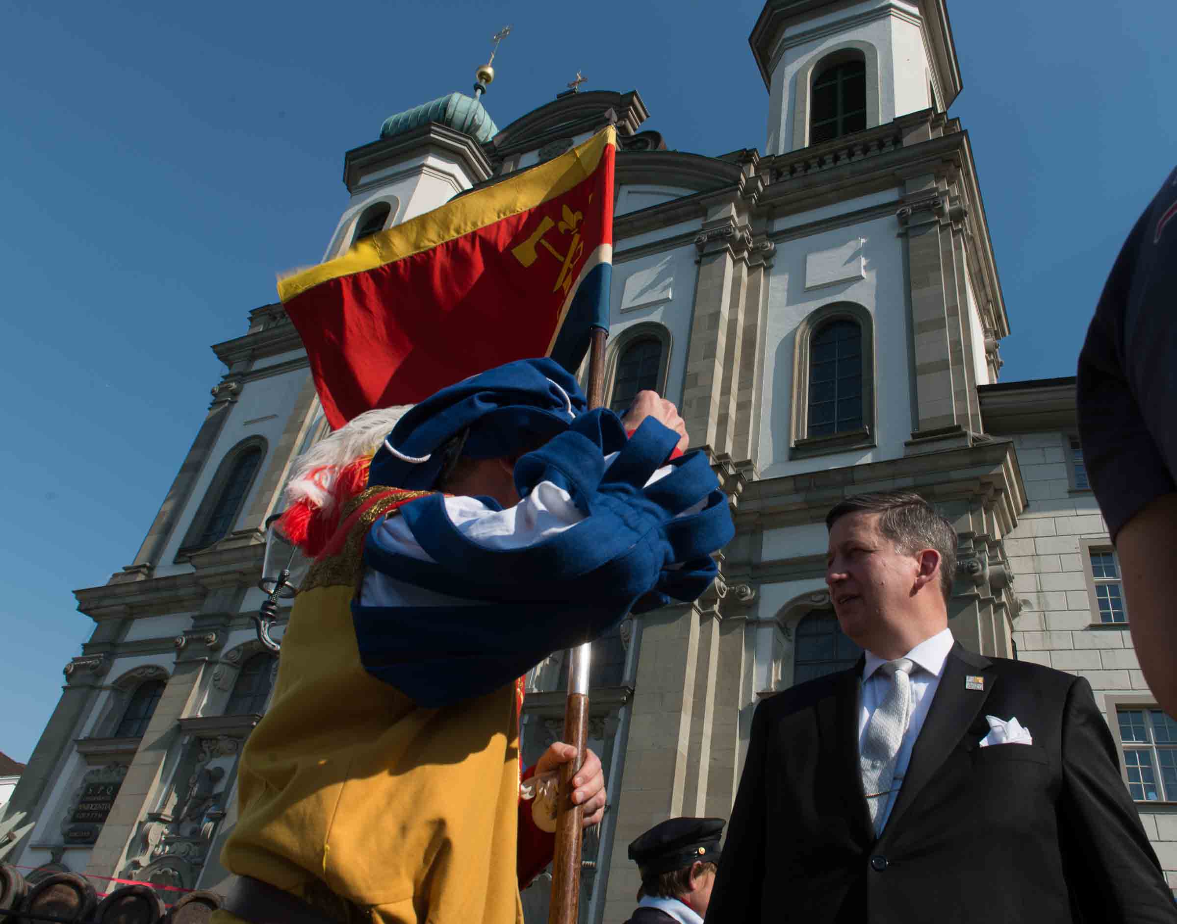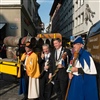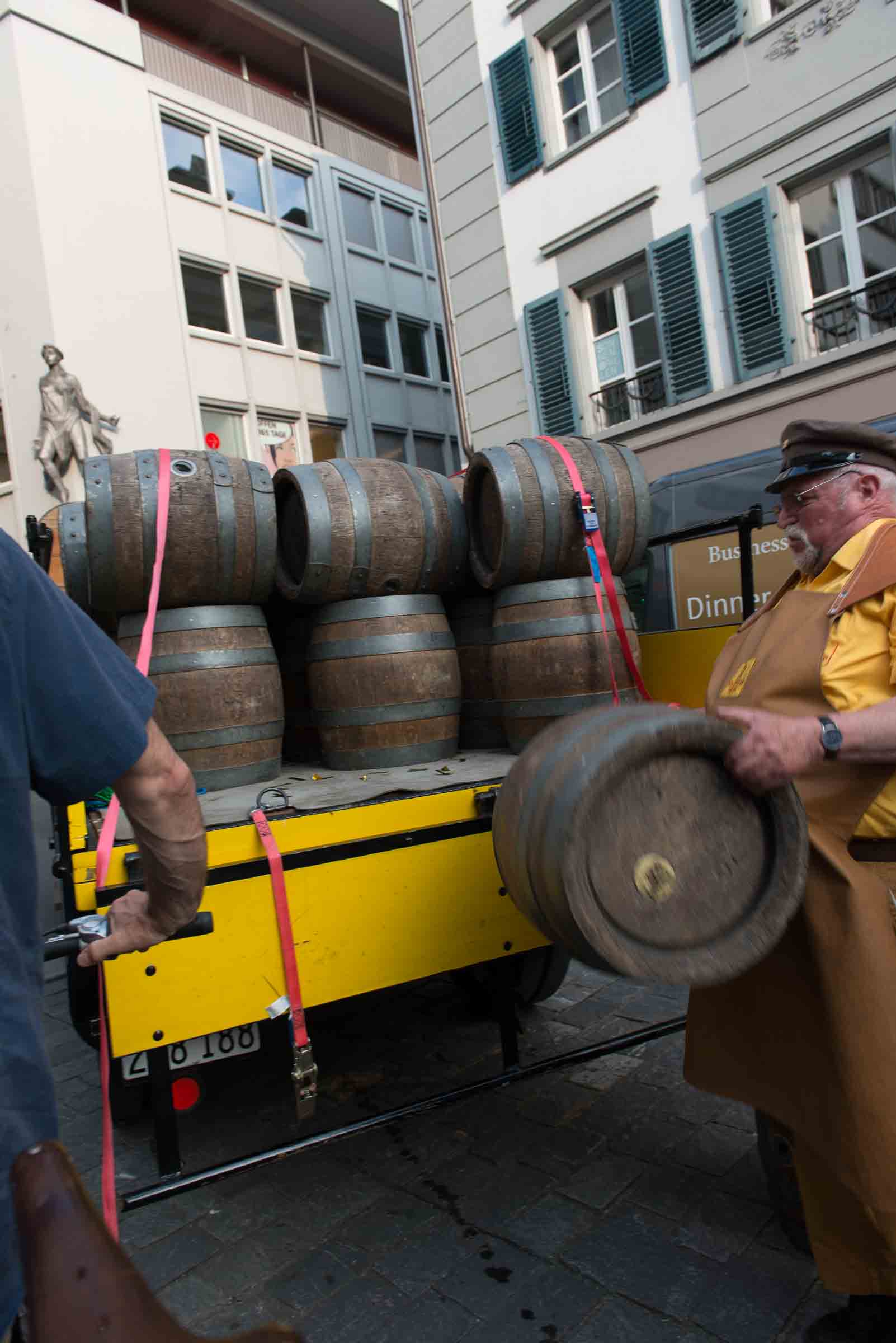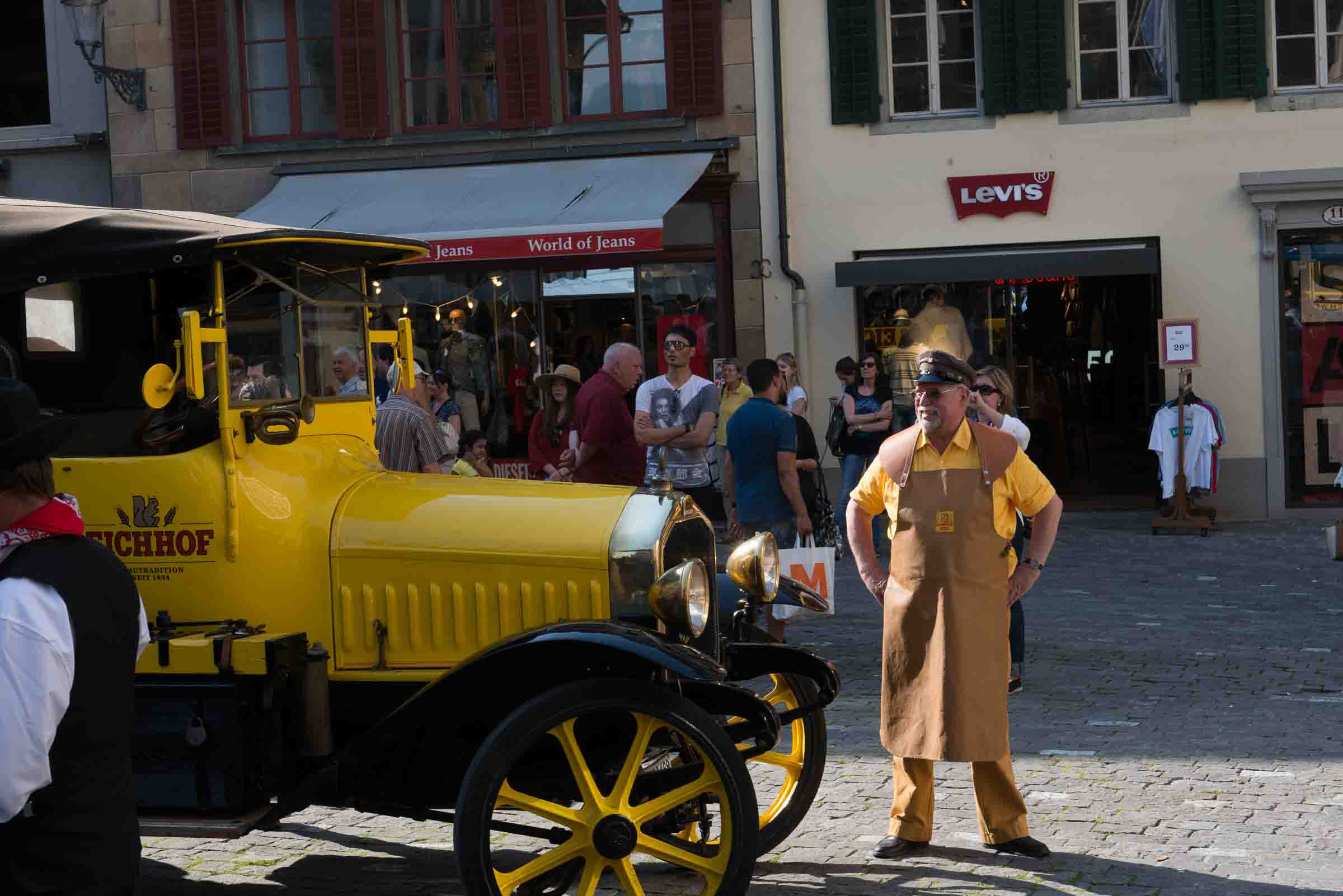 vor der Jesuitenkirche inkl. Apero. Touristen die vorbeiziehen und Einheimische die unsere Chipsli wegschmausen. Hoffentlich reichts für die über 40 aktiven Delegierten, die erwartet werden. Für Nachschub ist gesorgt, der Bierwagen Eichhof, dieses Jahr 100 Jahre jung und mit flotten 29 km/h pro Stunde noch unterwegs, hat noch einige Fässli auf der Ladebrücke für die durstigen Kehlen. Und das Photosujet, alle wollen abgelichtet werden, auch die beiden Weibel in den blauen Gewändern.