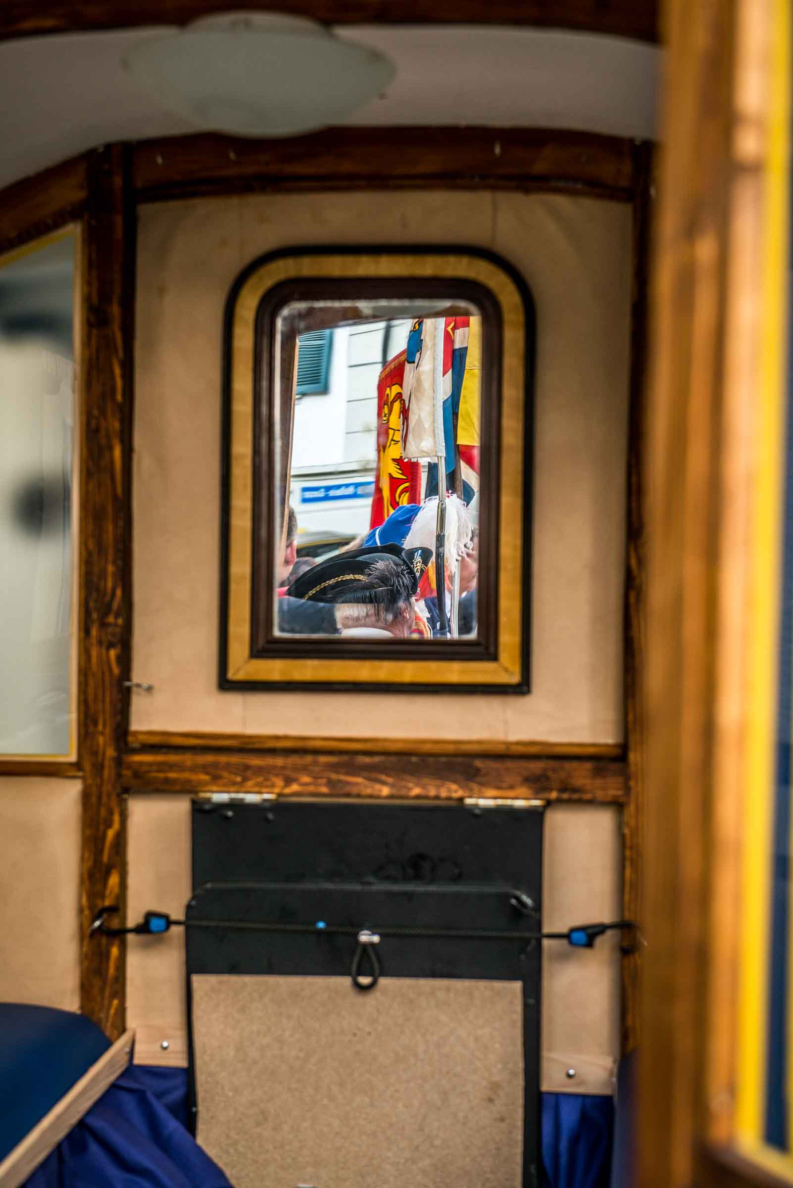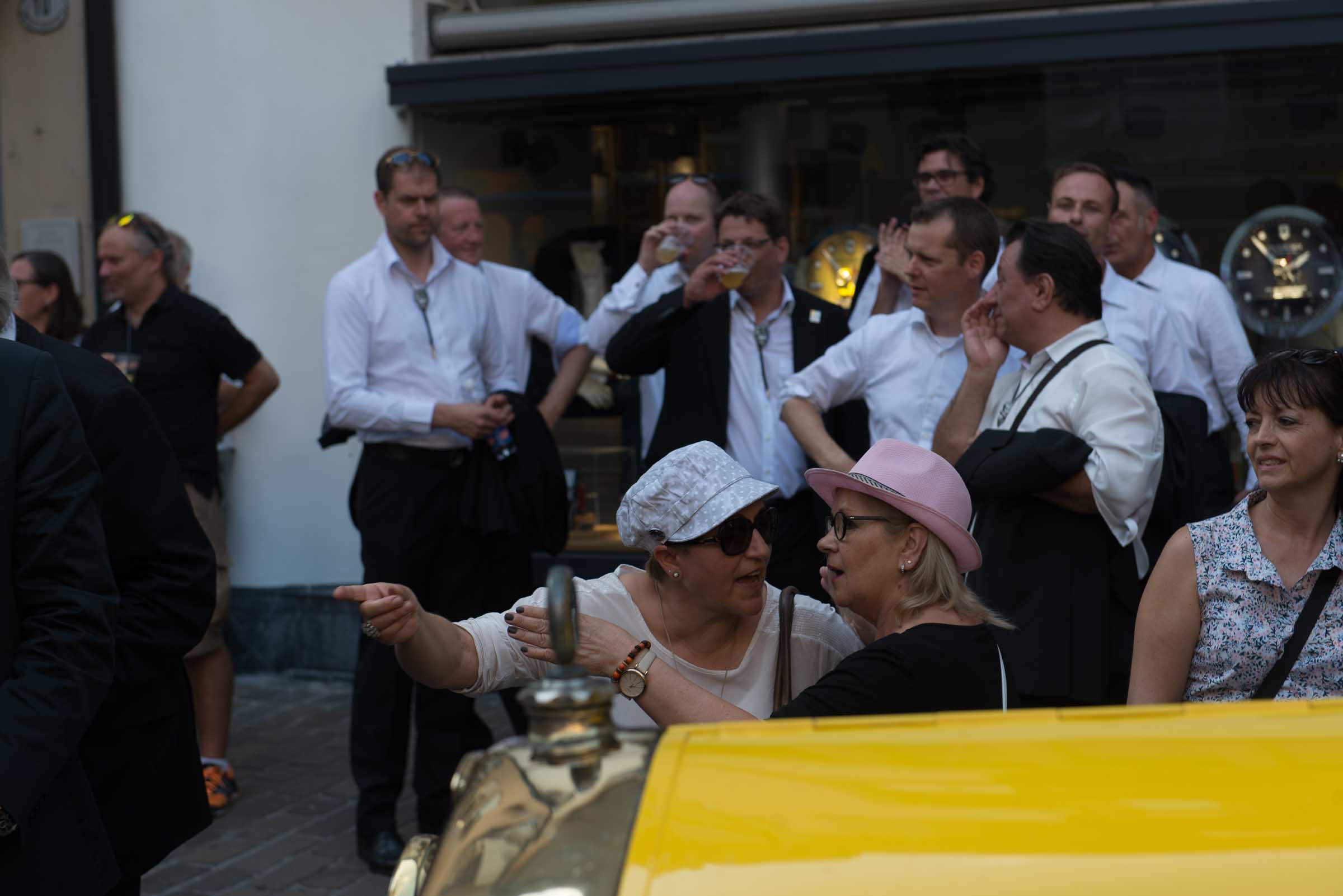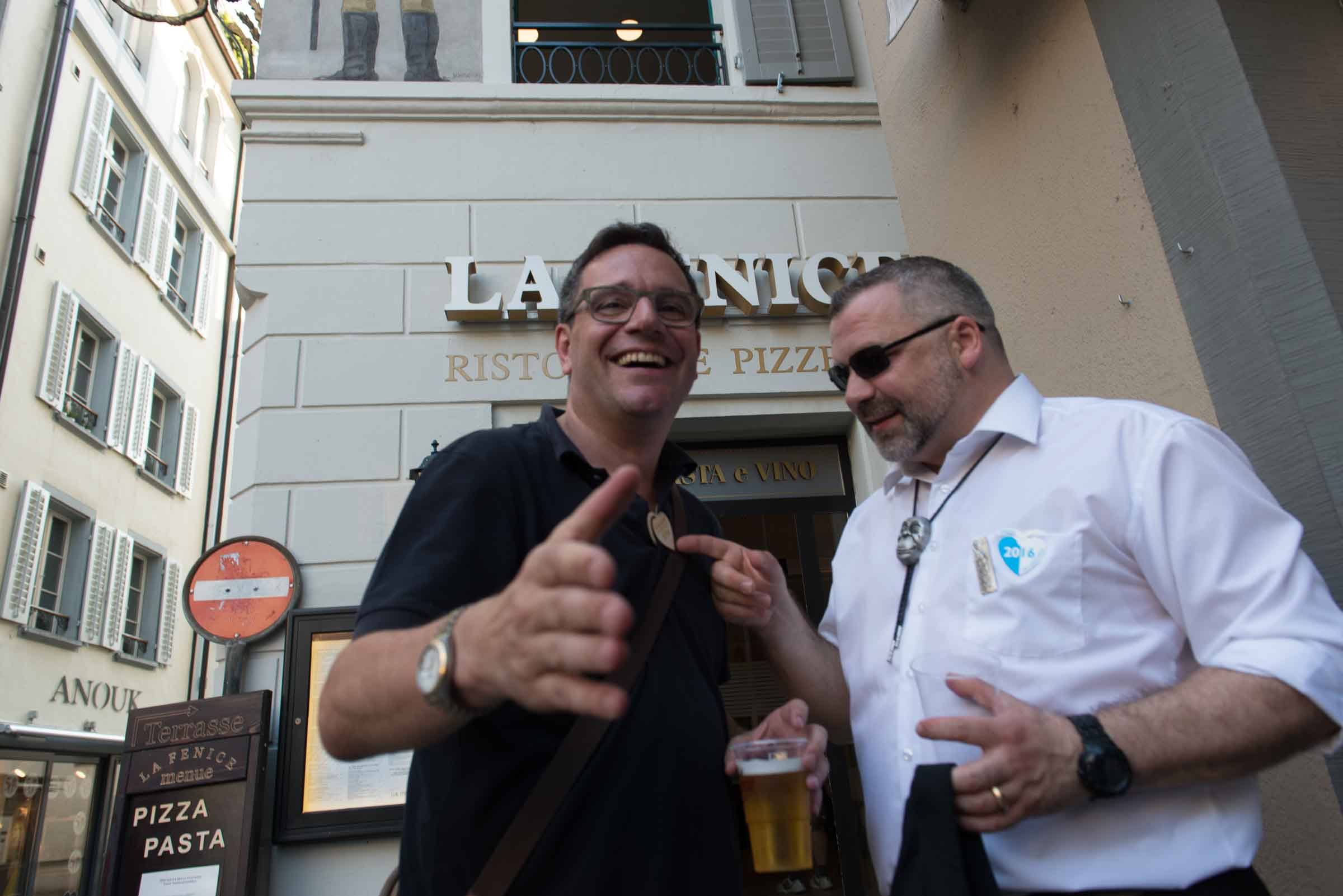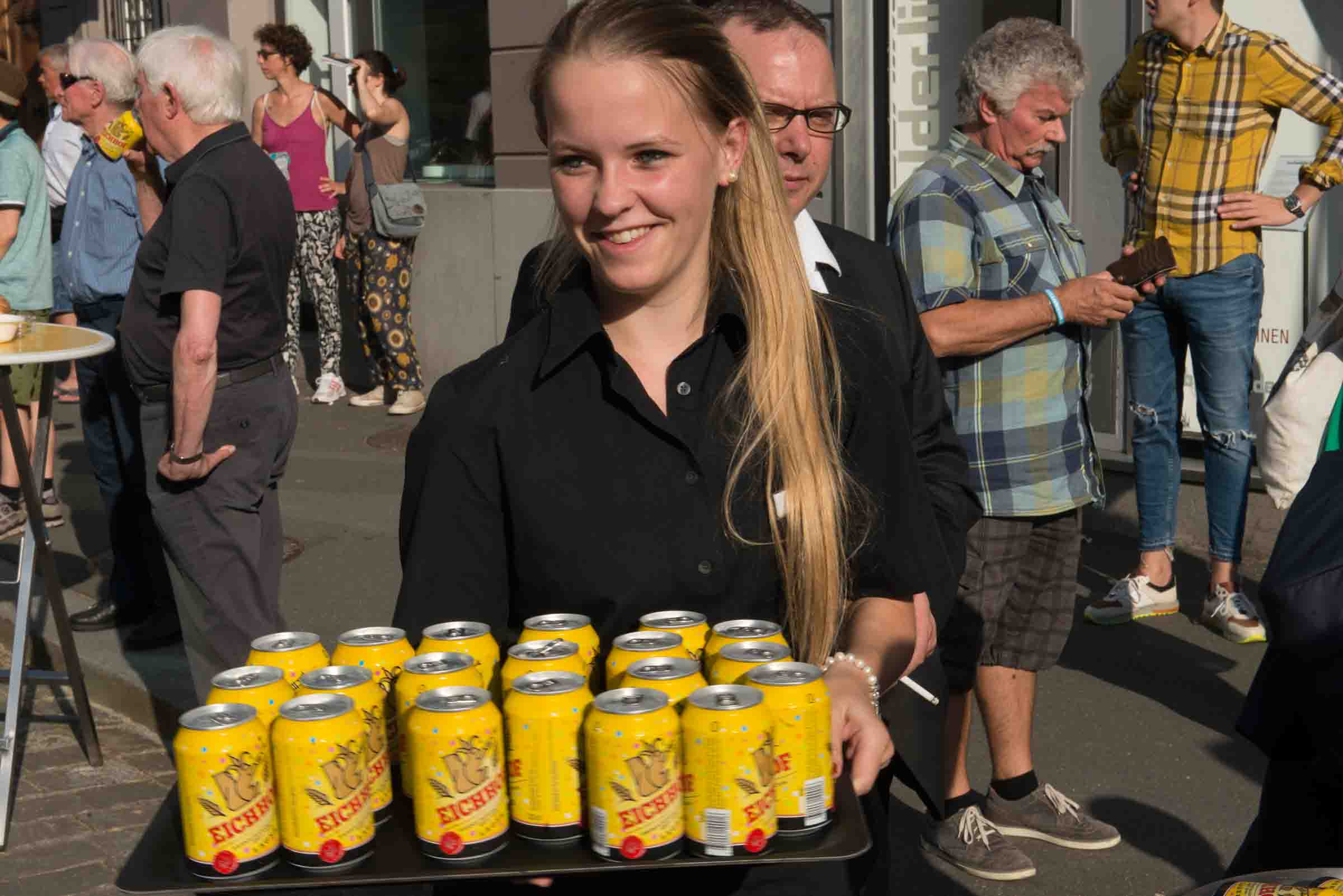 vor der Jesuitenkirche inkl. Apero. Touristen die vorbeiziehen und Einheimische die unsere Chipsli wegschmausen. Hoffentlich reichts für die über 40 aktiven Delegierten, die erwartet werden. Für Nachschub ist gesorgt, der Bierwagen Eichhof, dieses Jahr 100 Jahre jung und mit flotten 29 km/h pro Stunde noch unterwegs, hat noch einige Fässli auf der Ladebrücke für die durstigen Kehlen. Und das Photosujet, alle wollen abgelichtet werden, auch die beiden Weibel in den blauen Gewändern.