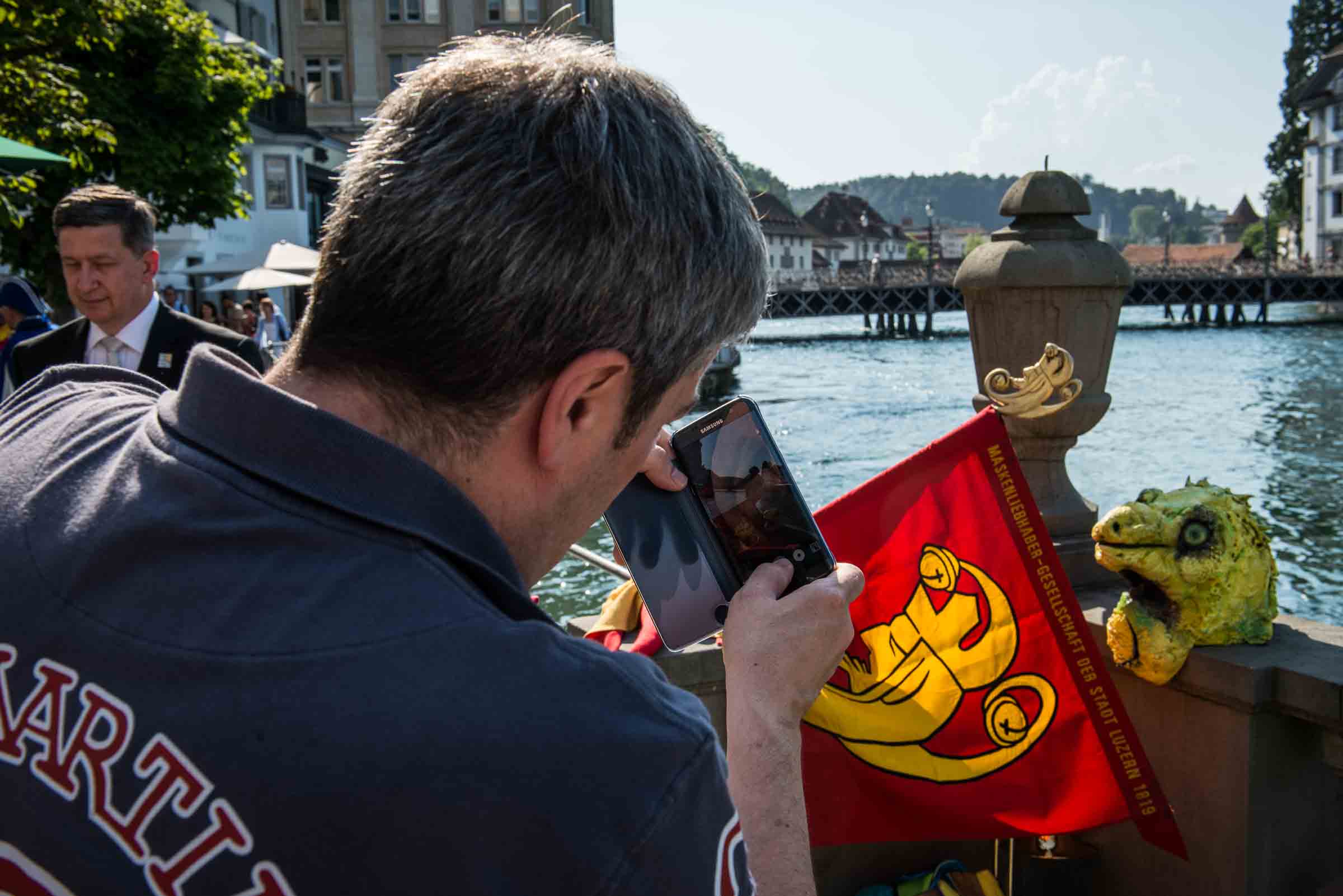 "Ou, da hed eine s'Handy vergässe", nein, das war kein Handy sondern eine Kamera die 360 Grad Videos aufnimmt. Einfach ins Video klicken mit der Maus oder dem Finger und drehen. Auf dem Video sind dann nicht nur die vorbeiziehenden Noggeler, nein, der Blick schweift Richtung Jesuitenkirche und Kapellbrücke.