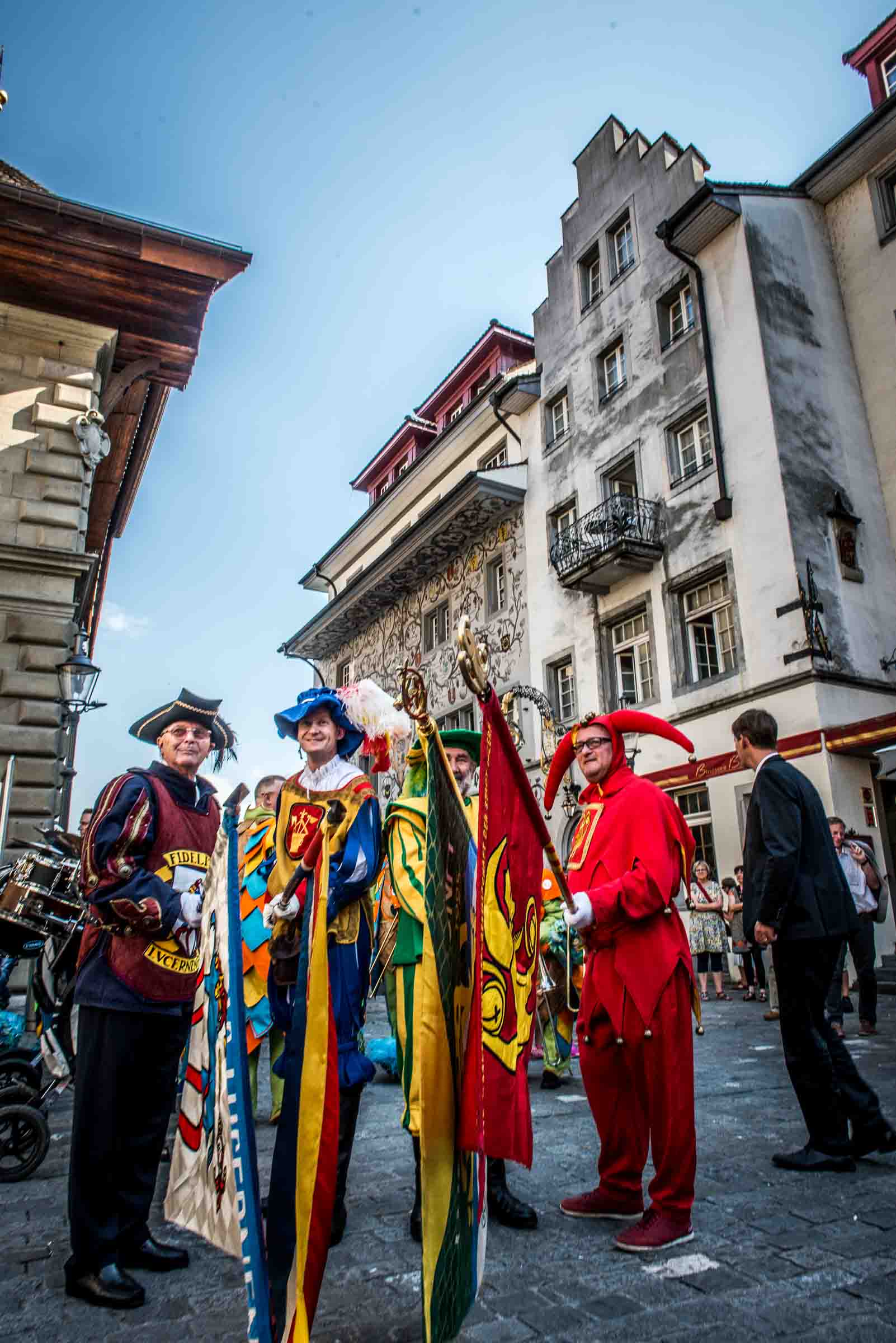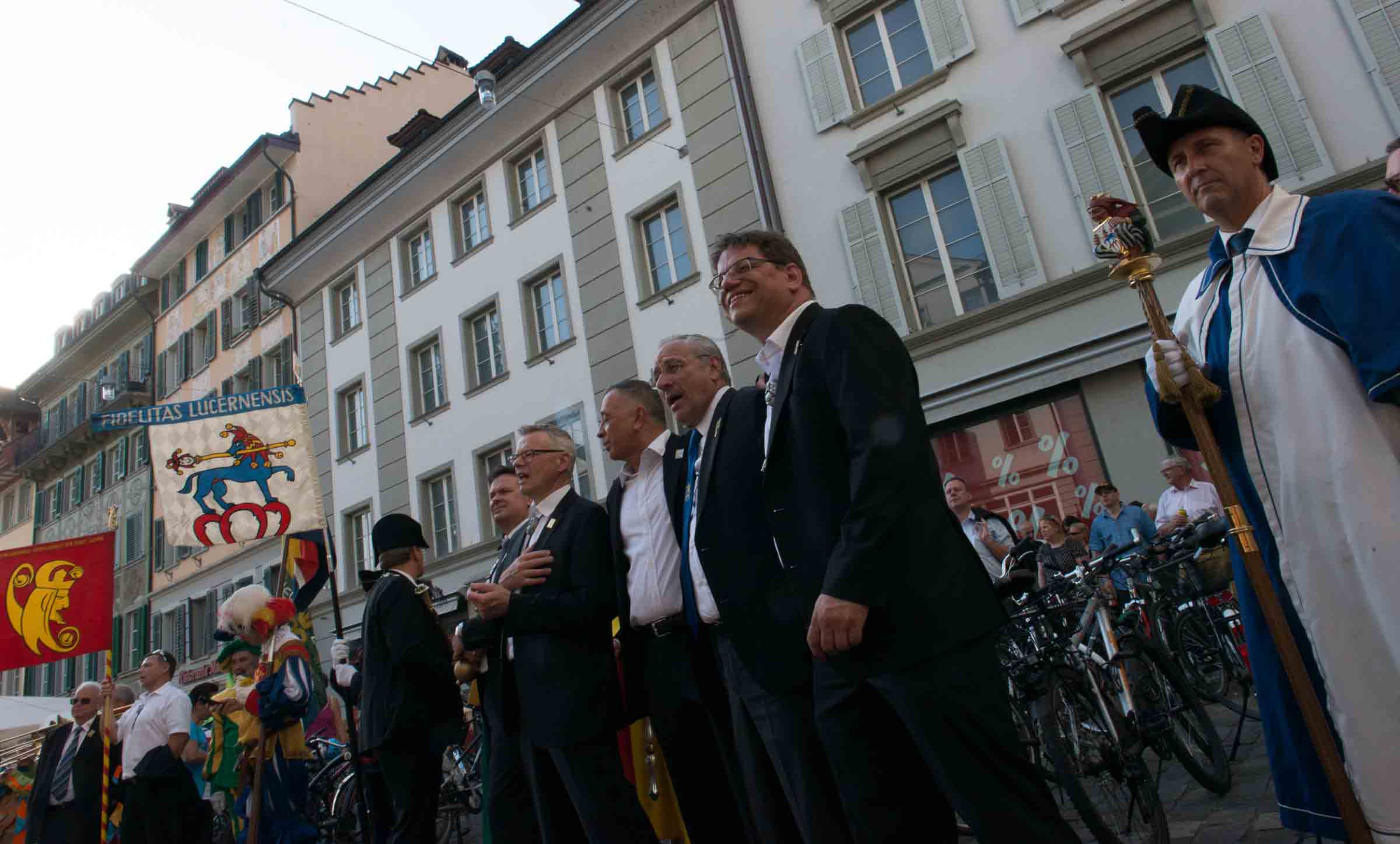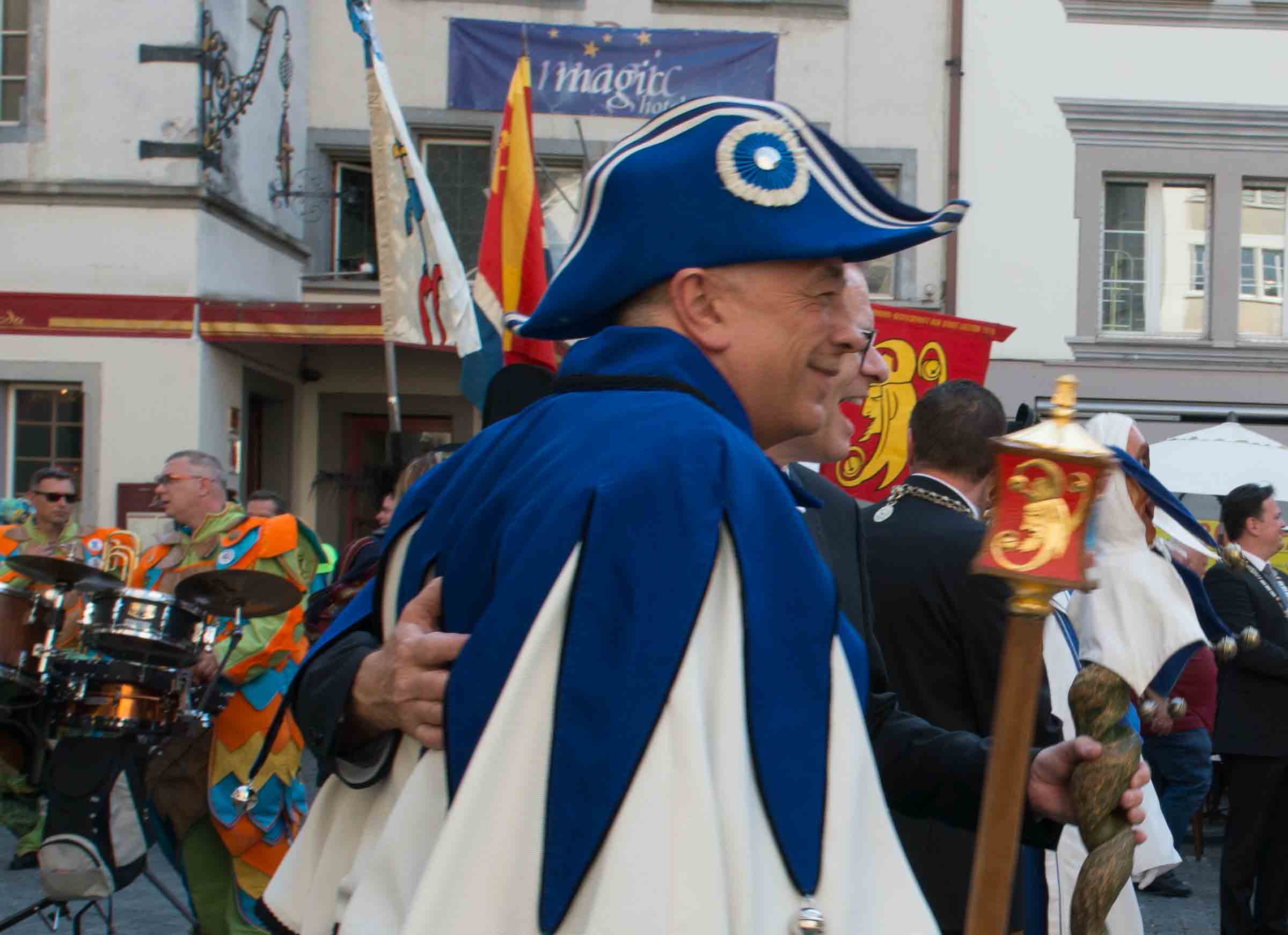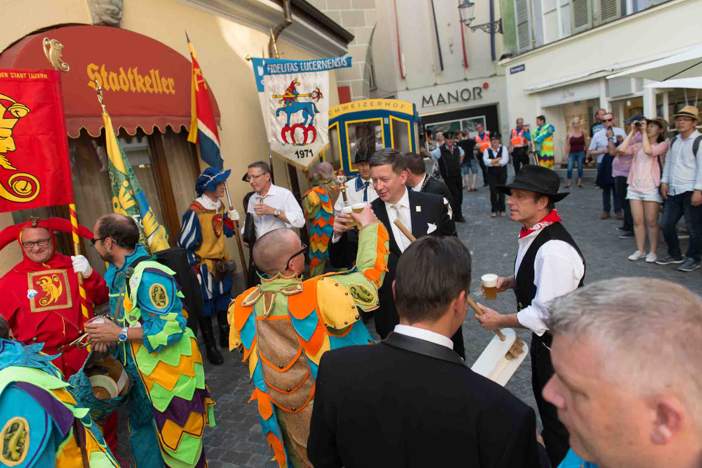 Ich darf nun meinen Schirmherrn verlassen. Der Weibel, Bruno Wespi,  wird  sein Gewand wieder abziehen dürfen. Ich gelange in die Hände des Präsidenten der Fidelitas Lucernensis. Durch die Kapellgasse, mit Halt beim Stadtkessel,