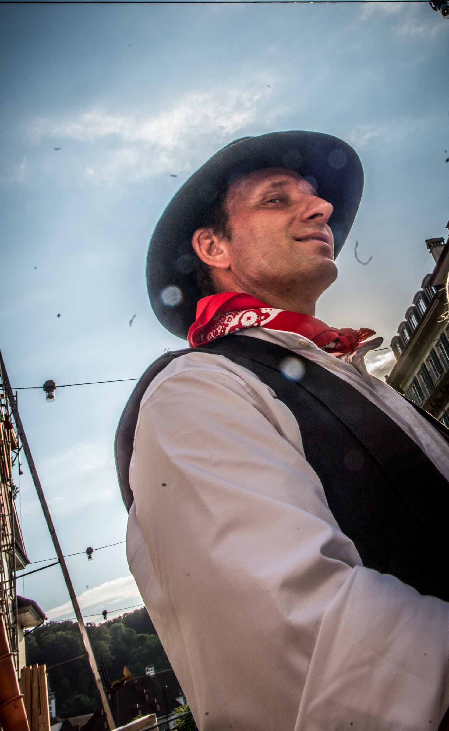 die Altstadt Luzern ziehen (im Touristenbus) und werden dann weitergereicht. Die Guggenmusik Noggeler spielt auf, die Hitze unter den Grinden ist wohl noch einige Grade höher als die angezeigten 32 Grad im Schatten. Ich tragen im Sommer und im Winter nur ein meine blauweisse Kappe. Das reicht!