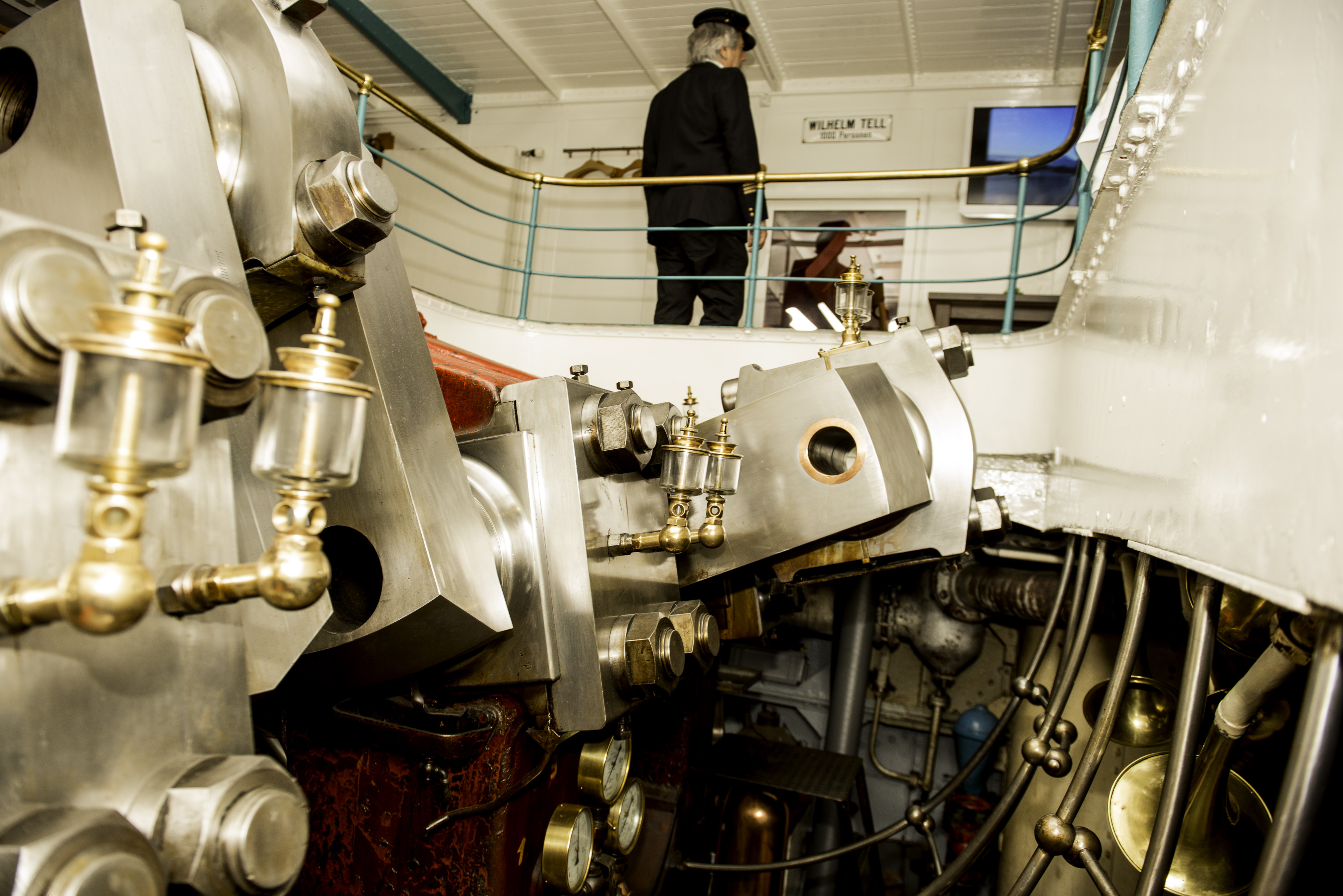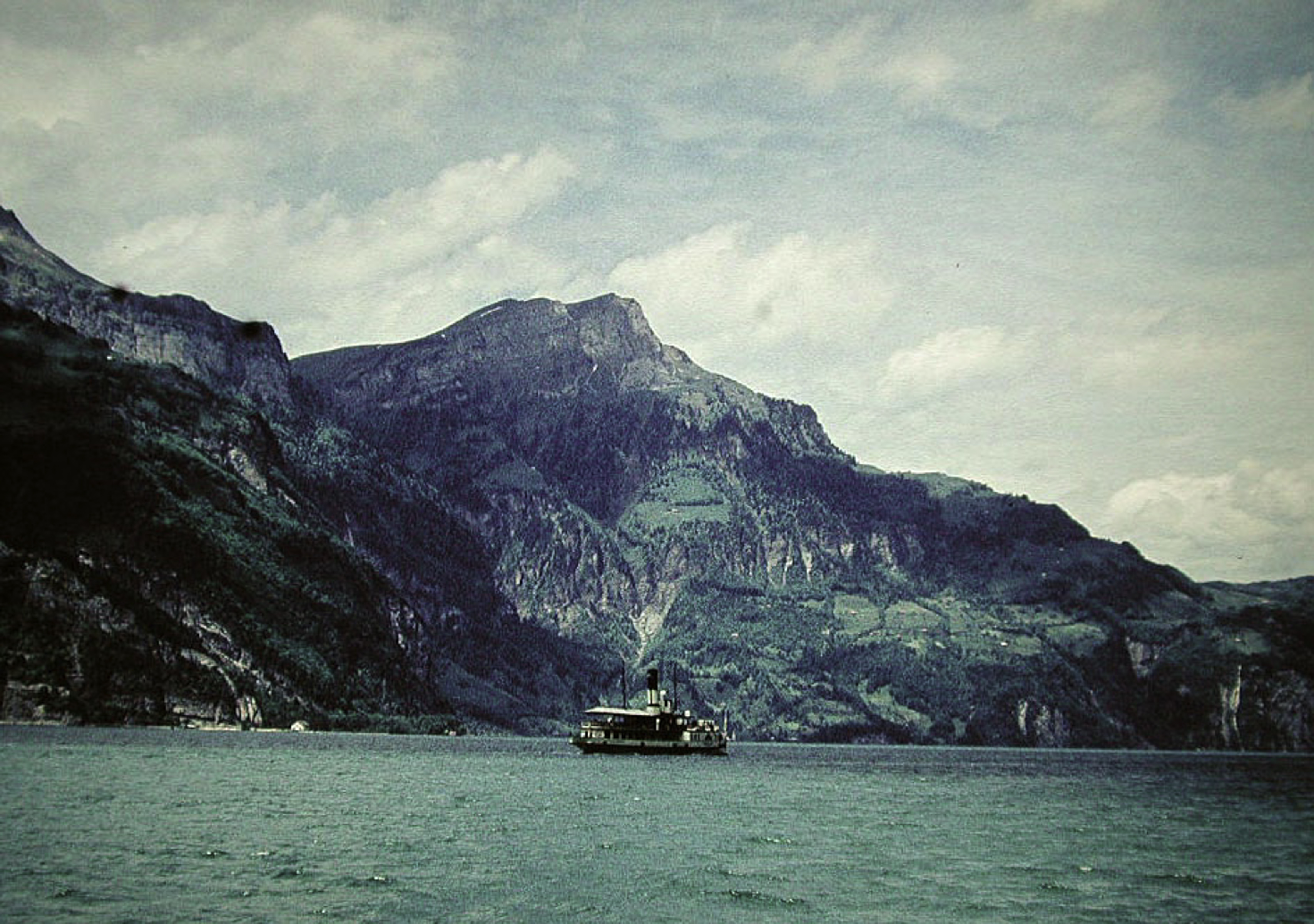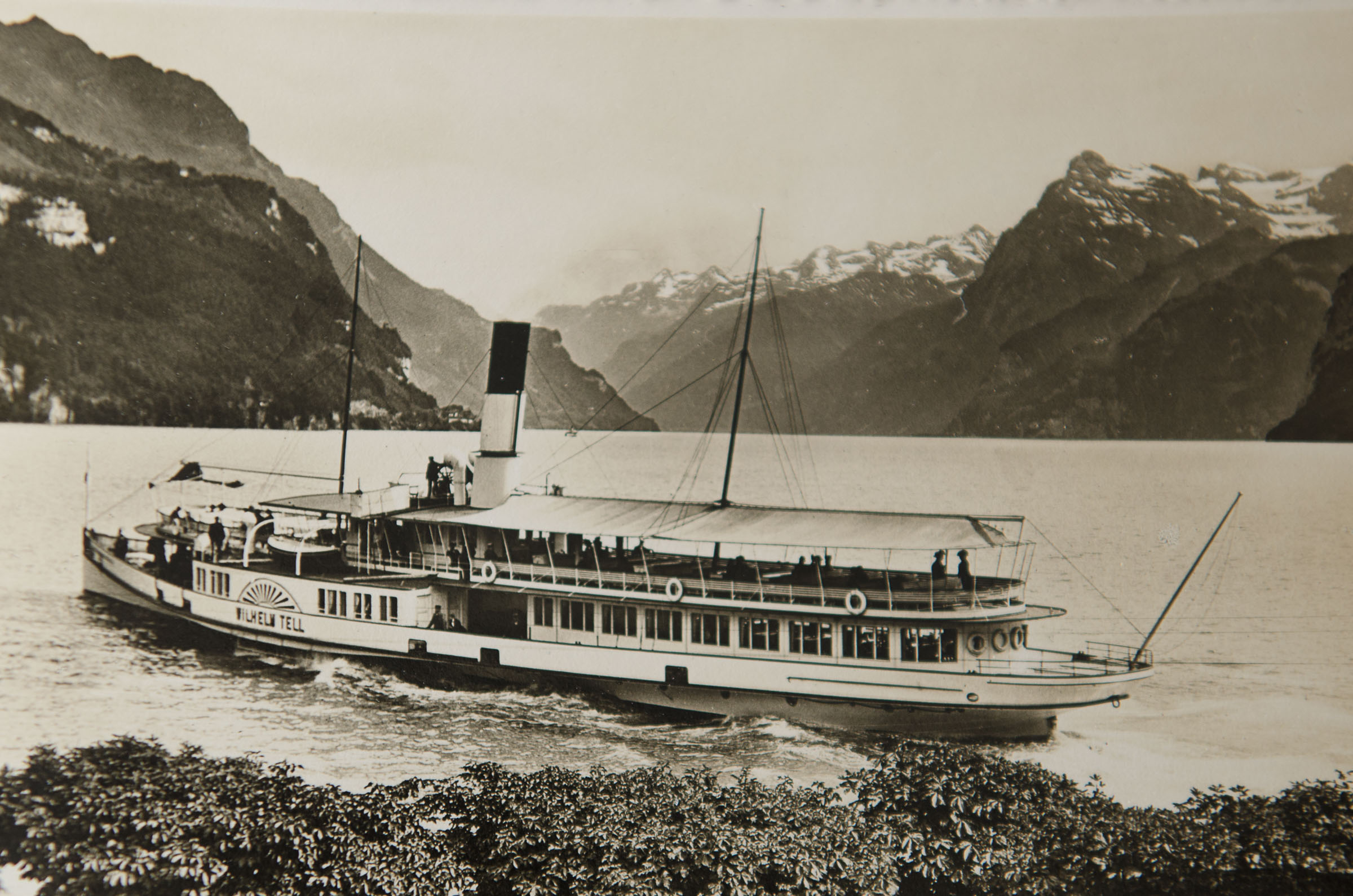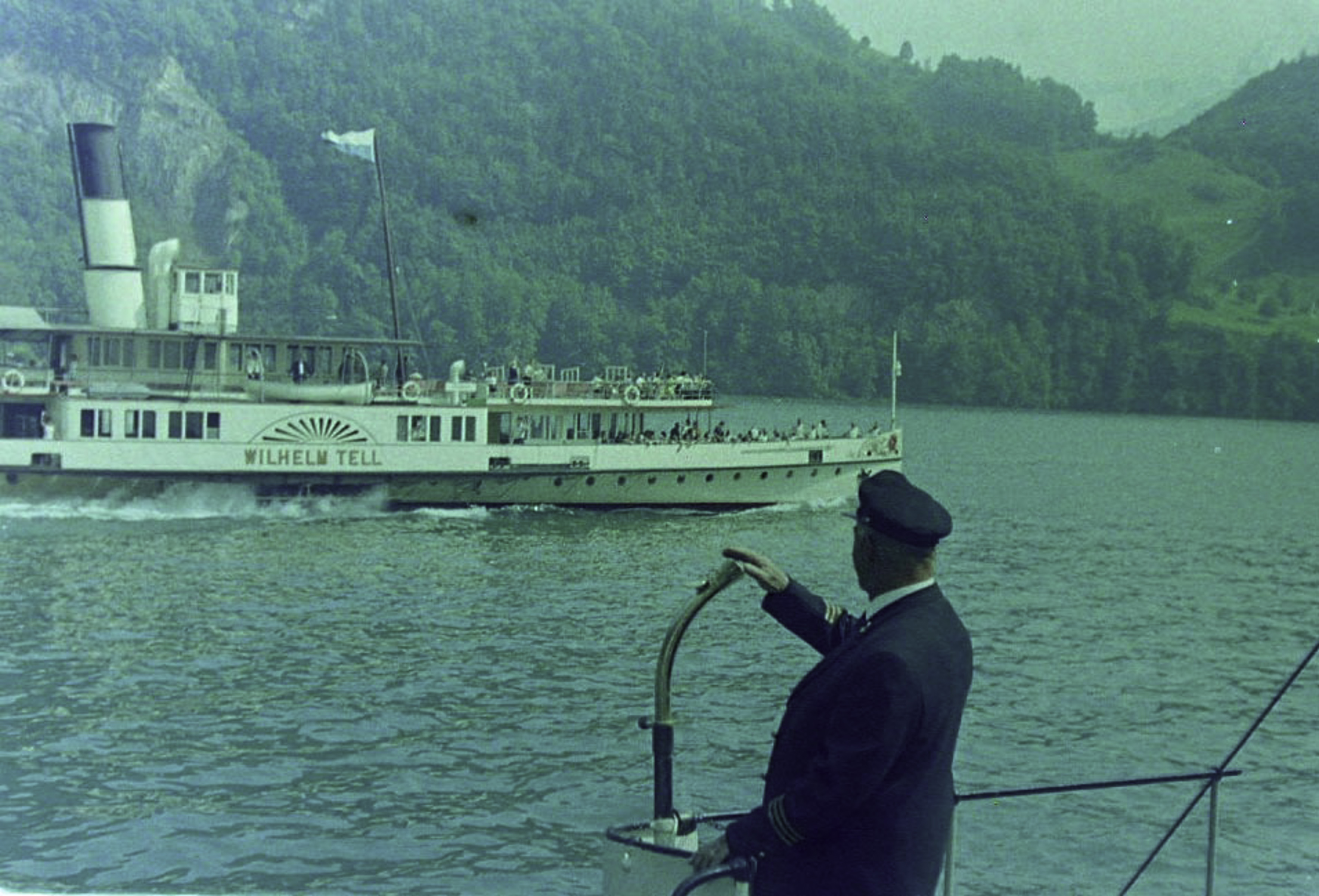 Das ehrwürdige Dampfschiff Wilhelm Tell hat eine Kapazität von 1000 Personen. Georg Huber ist am 1.1.1947  zum Kapitän befördert worden. Schon sein Vater war in Flüelen Brückenwart an der Schiffsstation der damaligen DGV – Dampfschiffgesellschaft des Vierwaldstättersee.
