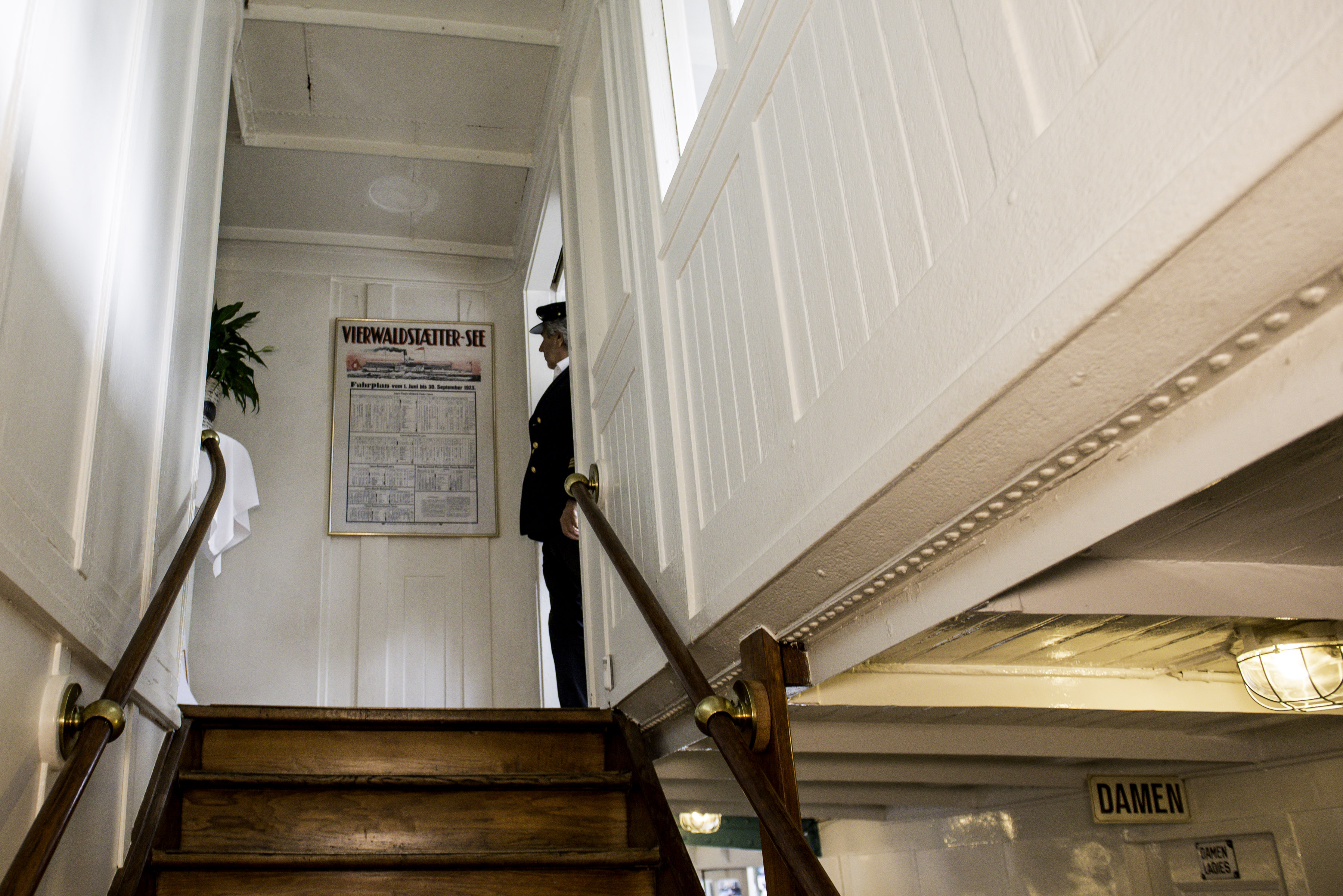 Auf dem Kontrollgang durchs Schiff fragen englischsprechende Passagiere, wie der Berg auf der Backbordseite heisst. Es ist der Bürgenstock.
