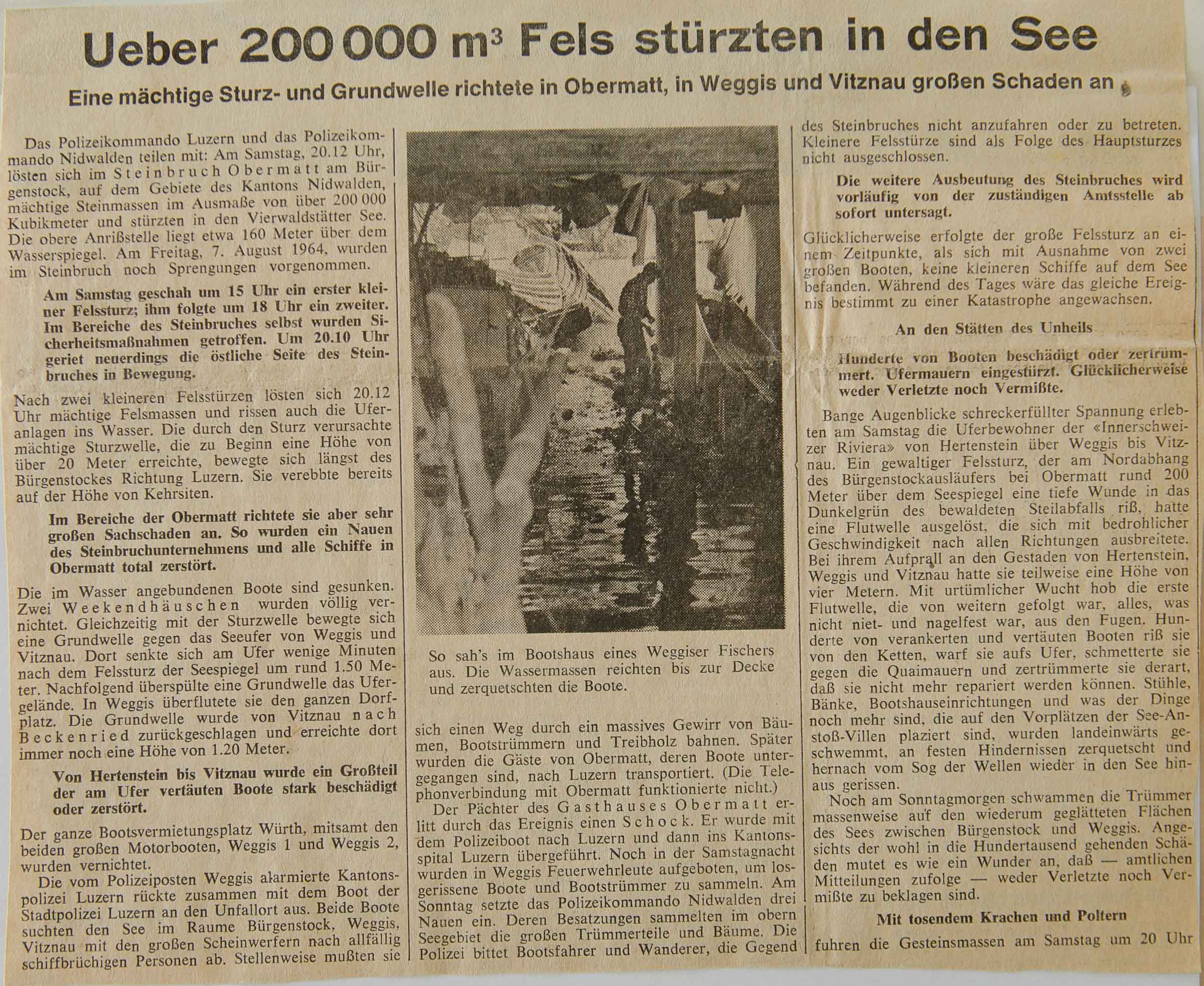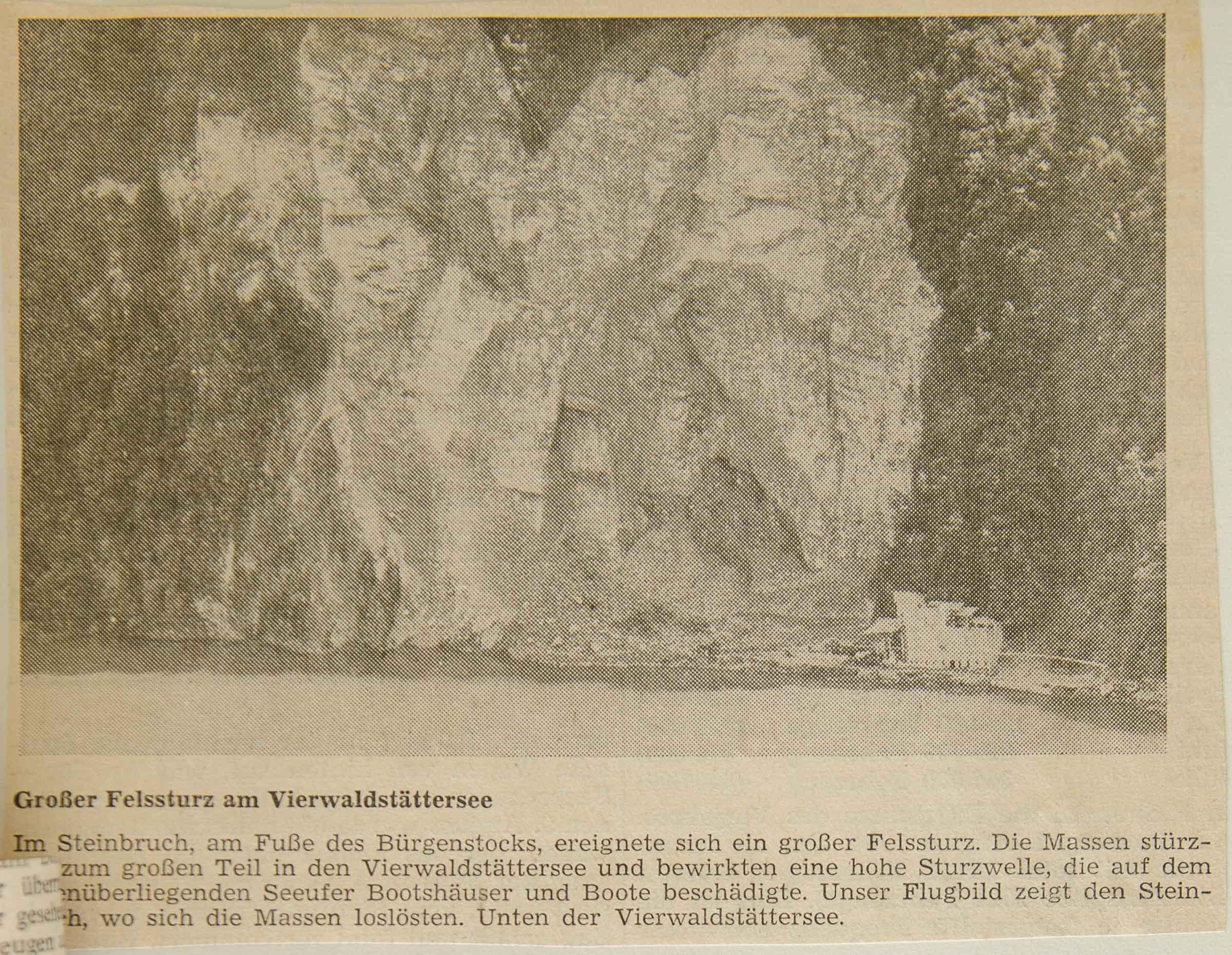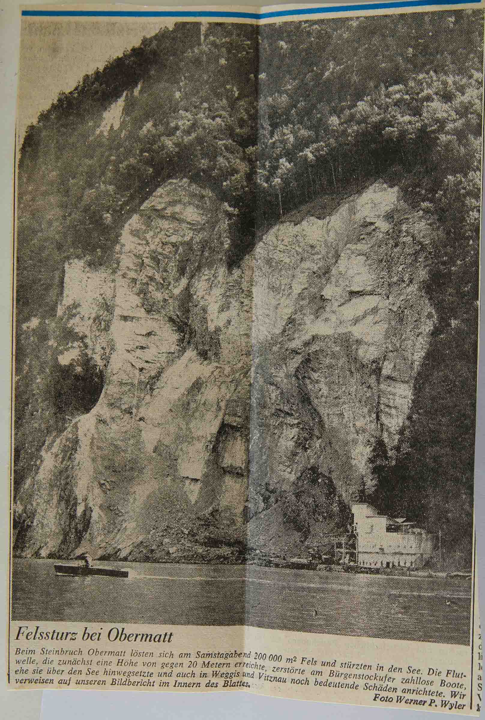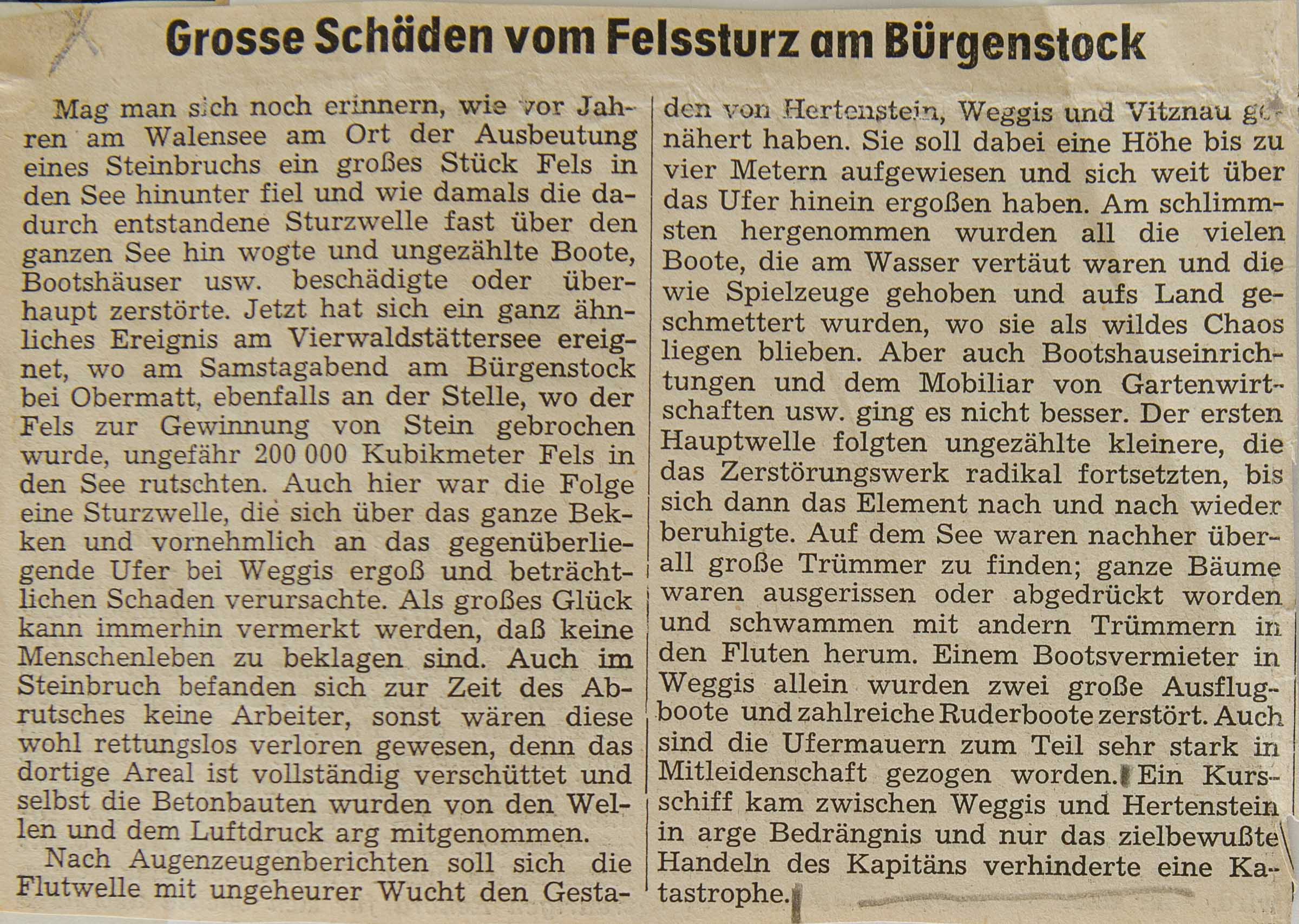 Um 20:12 lösten sich im Steinbruch am Bürgenstock mächtige Steinmassen, im Ausmass von 200'000 Kubikmeter, und stürzten in den Vierwaldstättersee. Die Anrissstelle lag ca. 160 m über dem Seespiegel. Eine riesige Sturz- und Grundwelle richtet an den Ufern grossen Schaden an. Die Höhe der Sturzwelle war zu Beginn 20 Meter. Auf der Seite des Bürgenstock wurden der Nauen, angebundene Boote und Wochenendhäuschen komplett zerstört.
