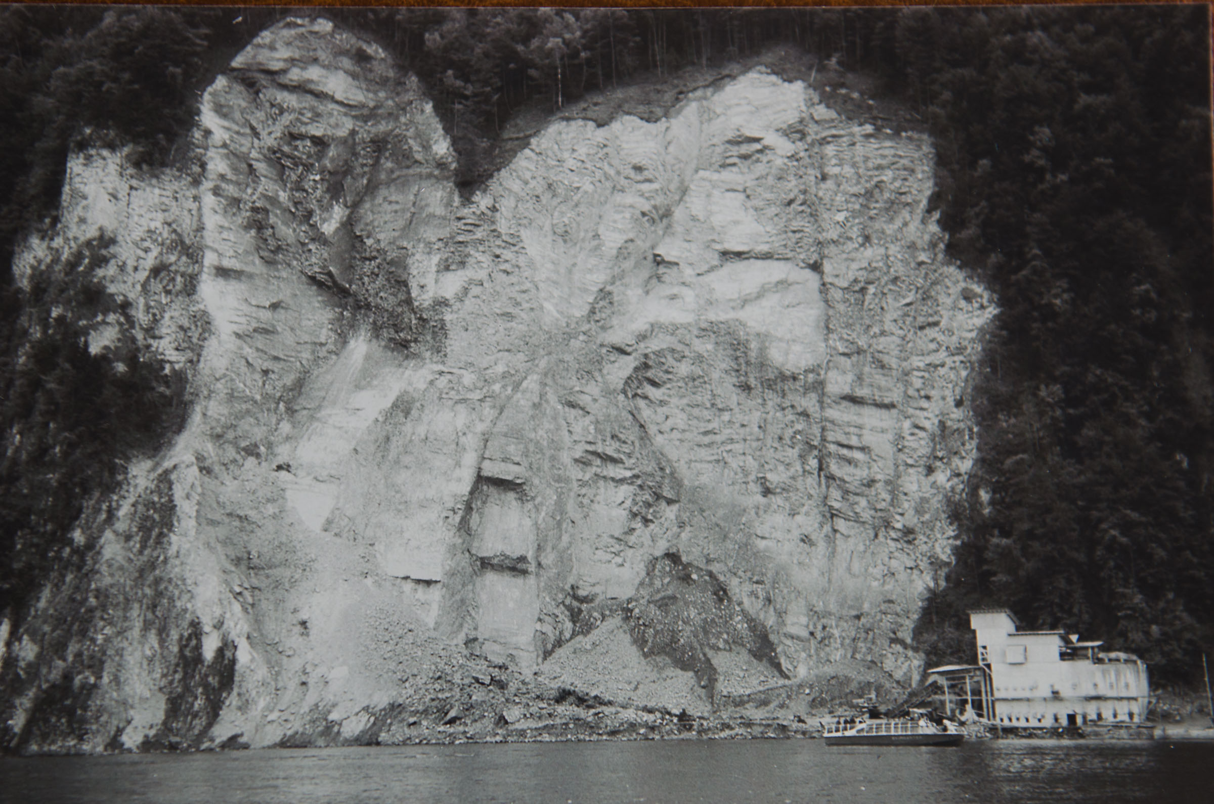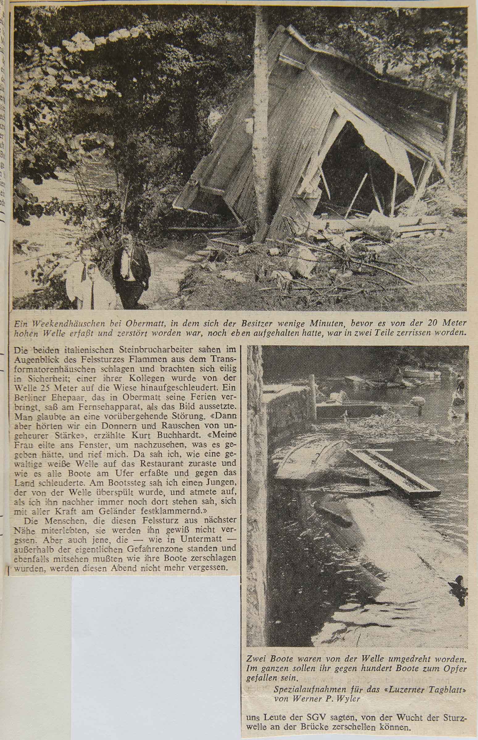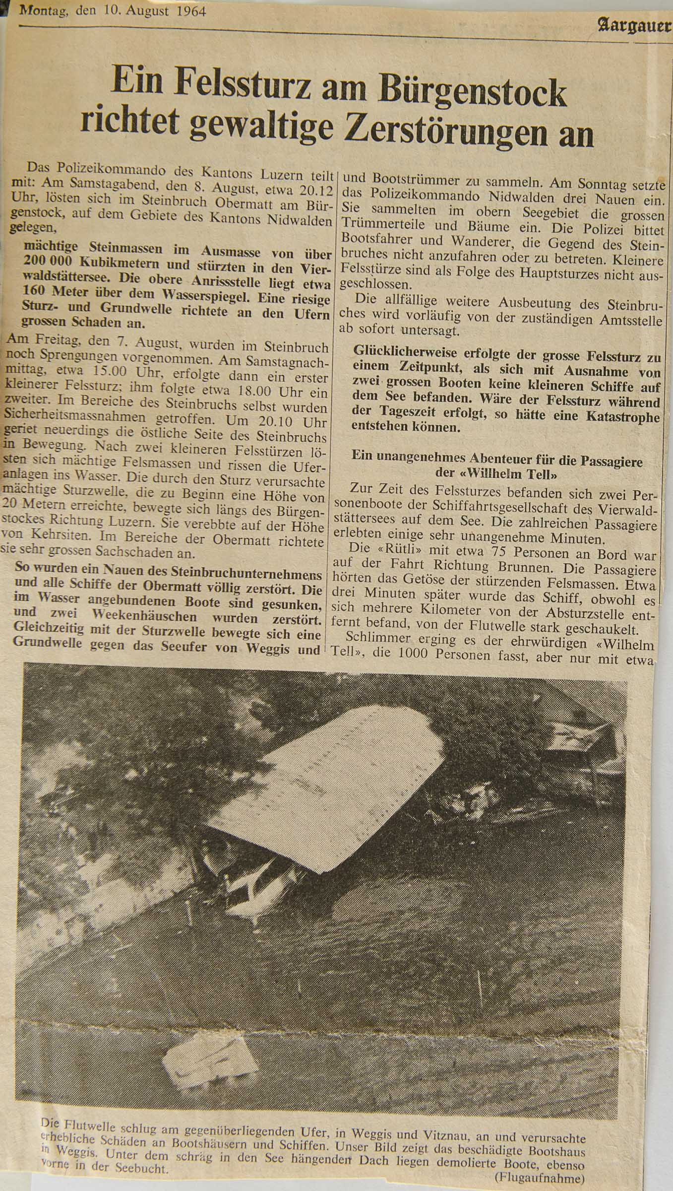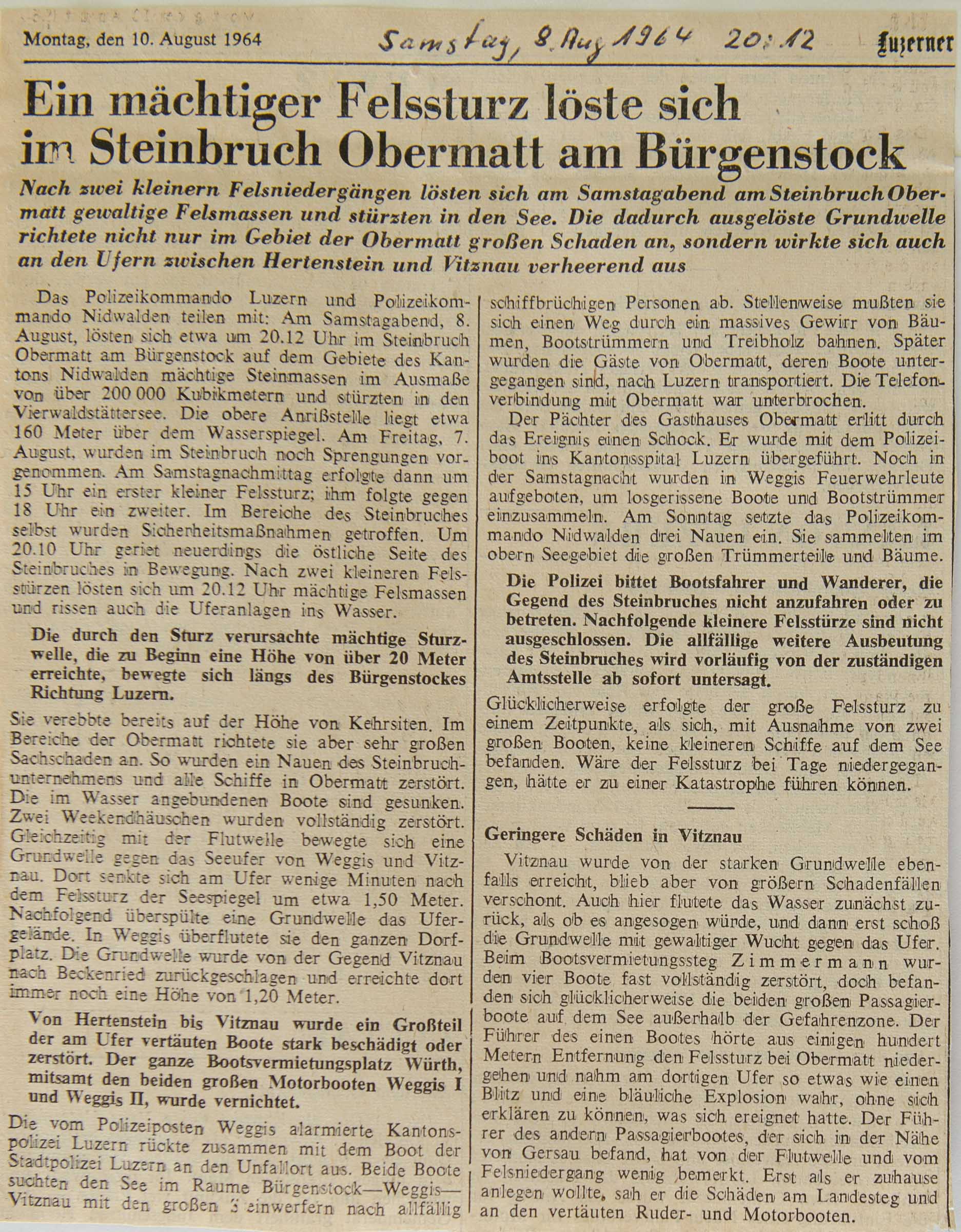 Um 20:12 lösten sich im Steinbruch am Bürgenstock mächtige Steinmassen, im Ausmass von 200'000 Kubikmeter, und stürzten in den Vierwaldstättersee. Die Anrissstelle lag ca. 160 m über dem Seespiegel. Eine riesige Sturz- und Grundwelle richtet an den Ufern grossen Schaden an. Die Höhe der Sturzwelle war zu Beginn 20 Meter. Auf der Seite des Bürgenstock wurden der Nauen, angebundene Boote und Wochenendhäuschen komplett zerstört.