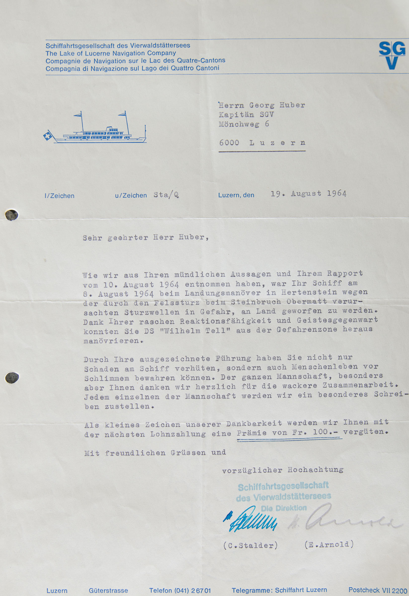 Dank der Ruhe und Erfahrung des Schiffskapitäns und der Tüchtigkeit der Besatzung, konnte eine äusserte kritische Situation ohne Schaden gemeistert werden. Die Sturzwelle kam nämlich gerade im heikelsten Augenblick: Als der Dampfer stillstand und daher das Steuerruder keine Wirkung mehr ausüben konnte. Die rasche und richtige Reaktion des Mannes auf der Kommandobrücke, der zuerst glaubte, ein Erdbeben sei losgebrochen, hat die SGV von der möglicherweisen folgenschweren Havarie bewahrt.