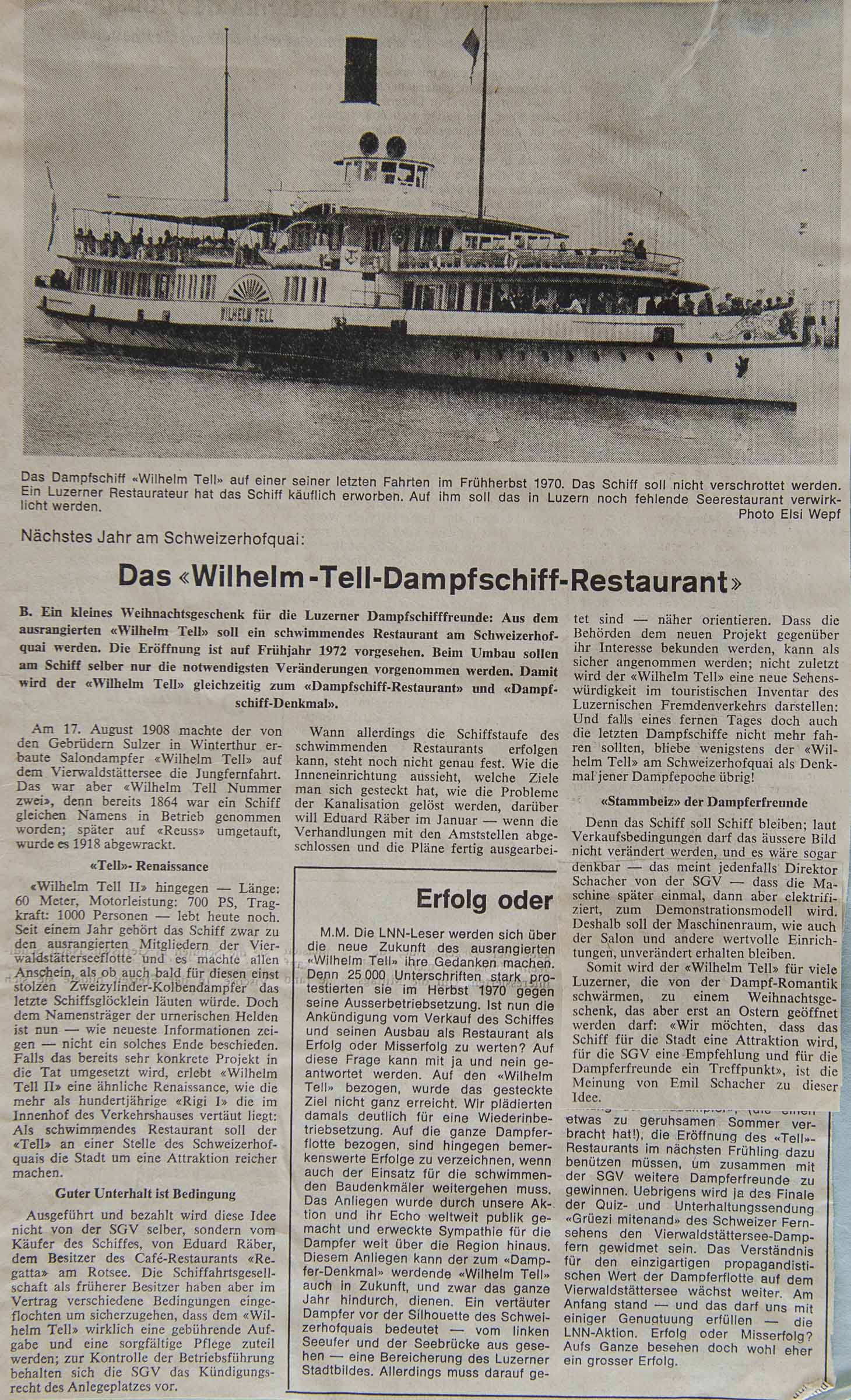 Dampfschiff Wilhelm Tell wurde an Edi Räber aus Luzern verkauft. Dieser baute das Schiff zu einem Restaurantschiff um, und seit diesen Tagen ist der Salondampfer am Landungssteg 9 fest vertäut.
