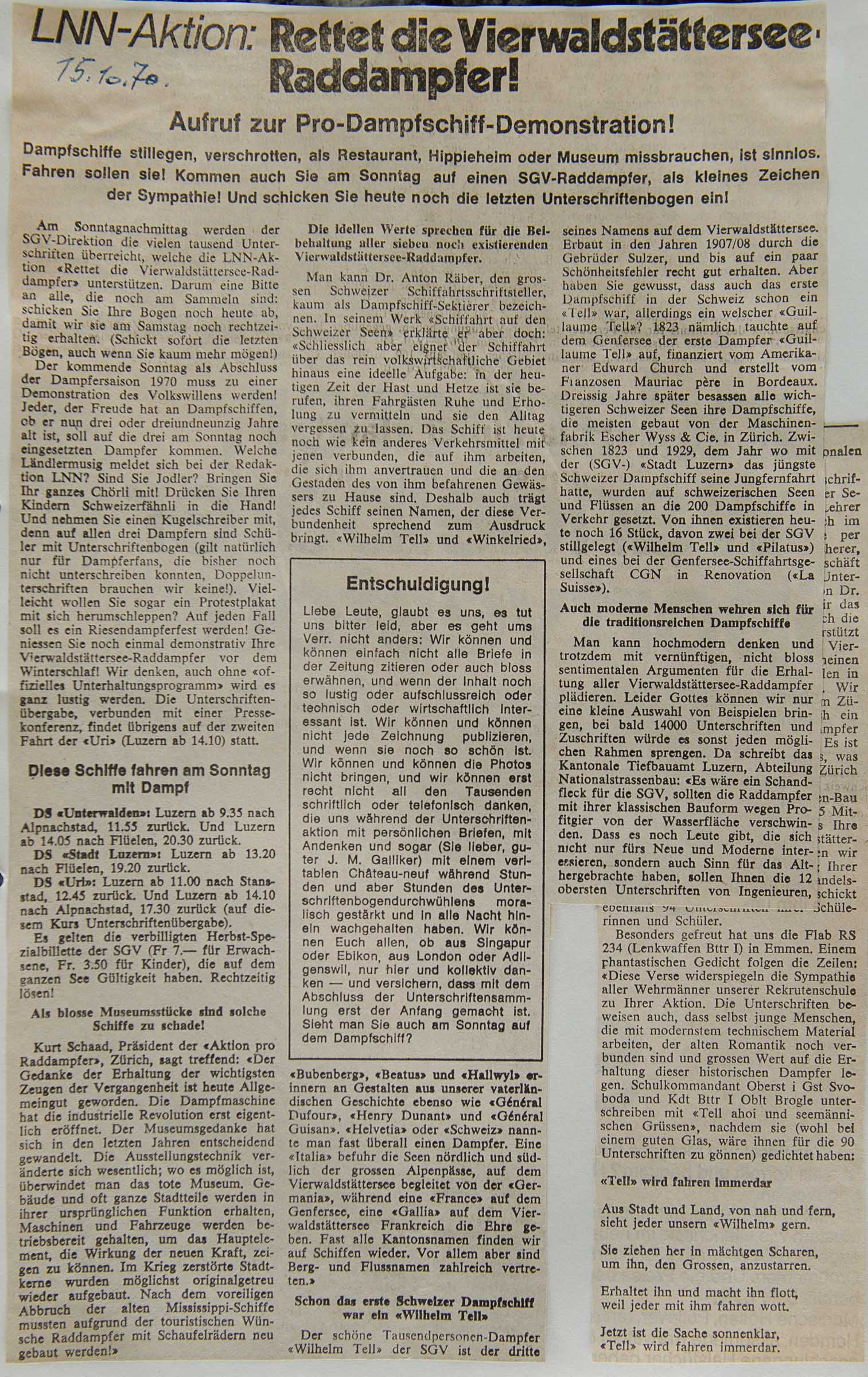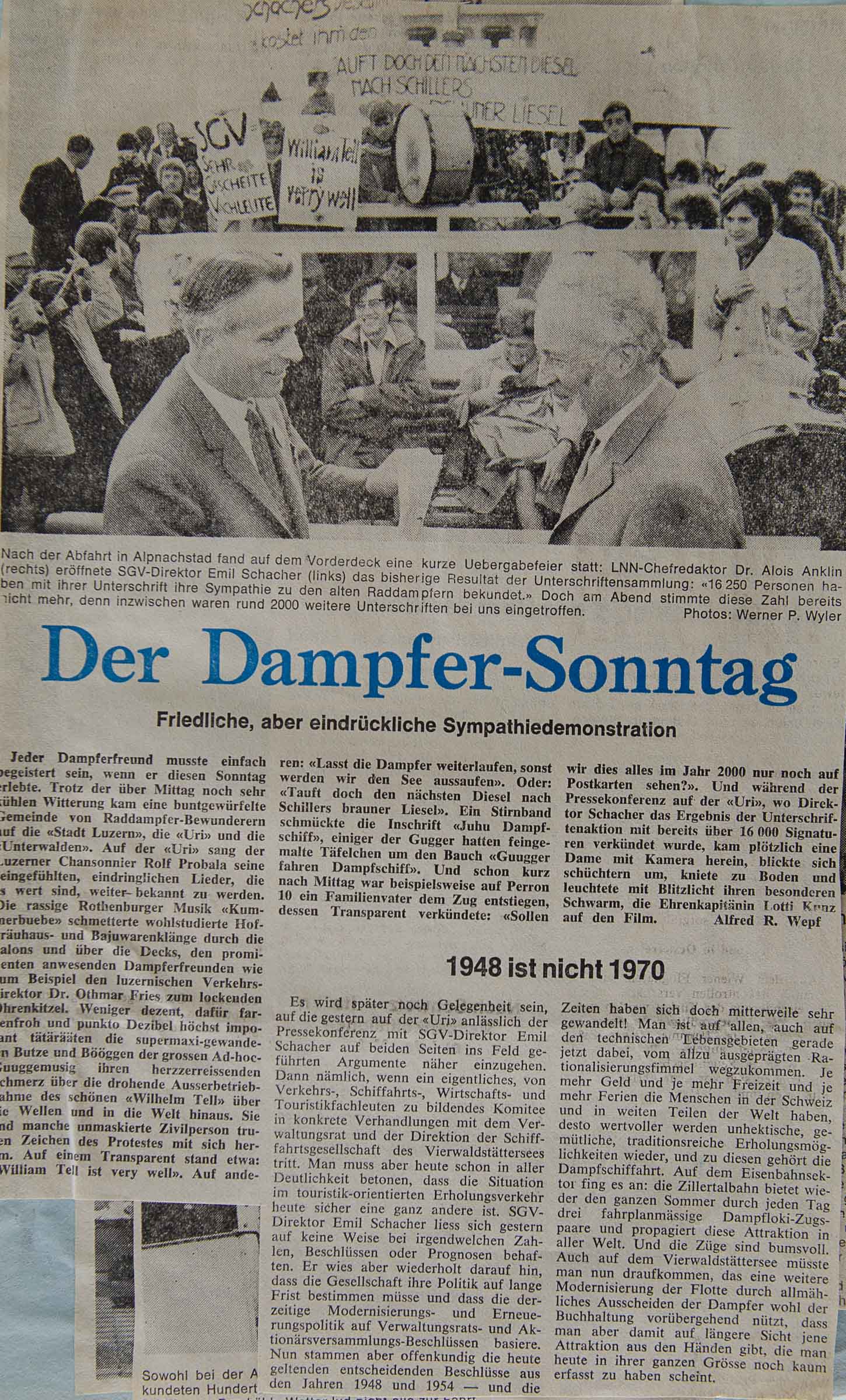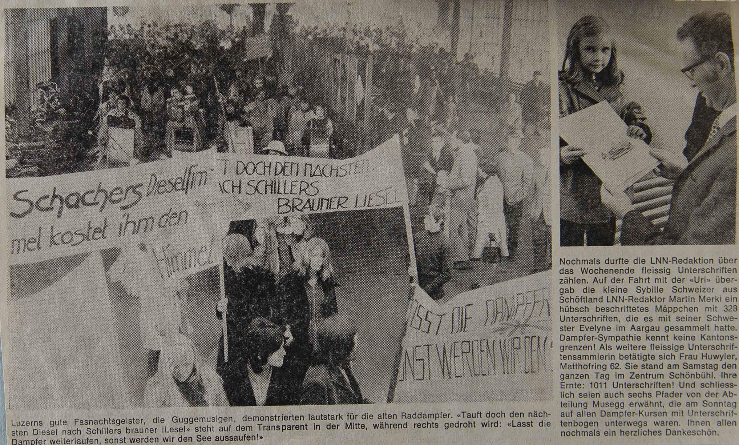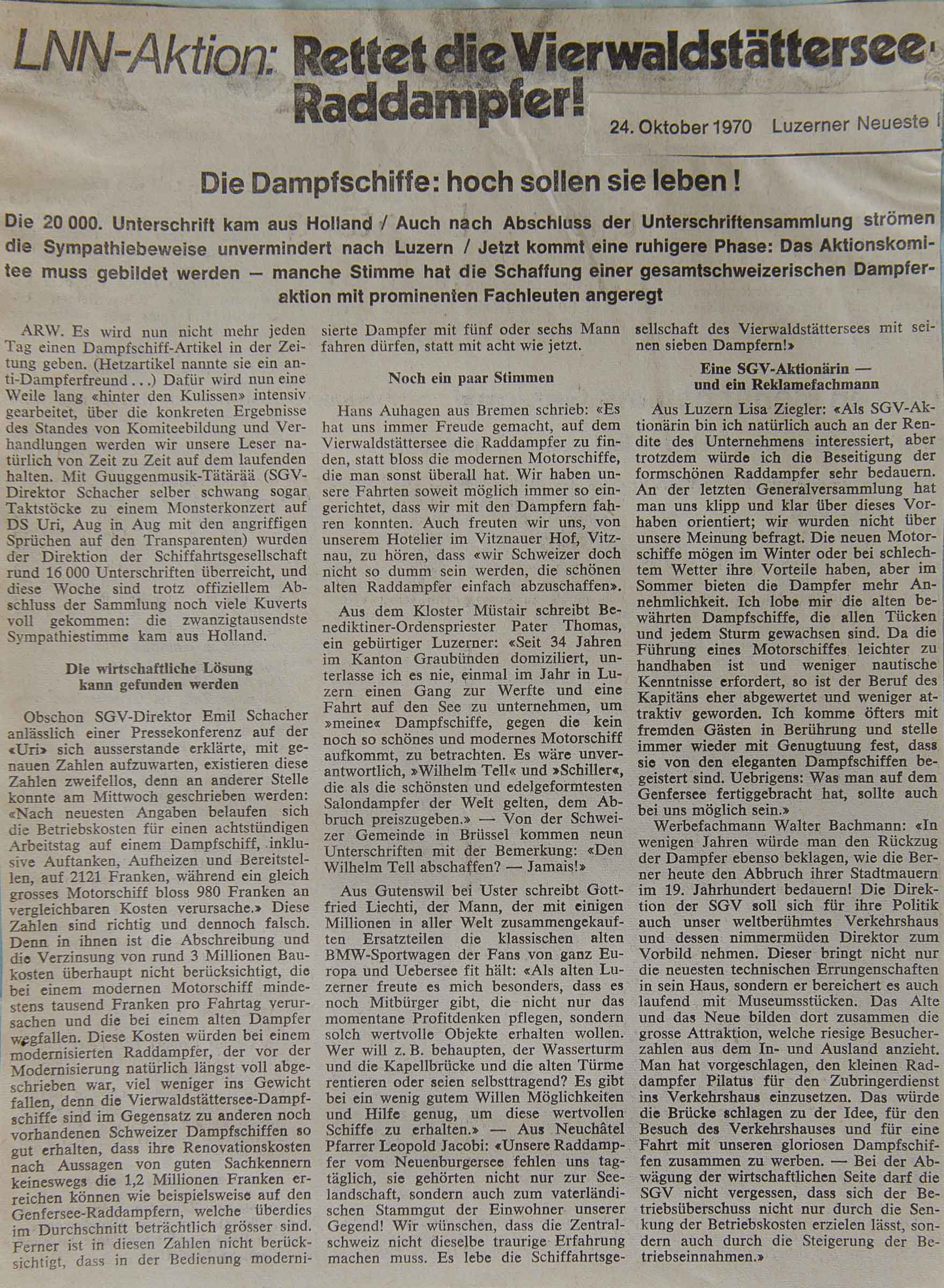 Somit stand die Schifffahrtsgesellschaft im Sturm. Die Bevölkerung wollte die Dampfschiffe weiterhin fahren sehen. Die damaligen Luzerner Neuesten Nachrichten, mit dem Redaktor Noldi Amstutz, lancierte flugs eine Unterschriftensammlung für den Erhalt der Dampfschiffe. Die anderen Luzerner Tageszeitungen stiegen ebenfalls ein. Innert kürzester Zeit wurden Tausende von Unterschriften gesammelt.