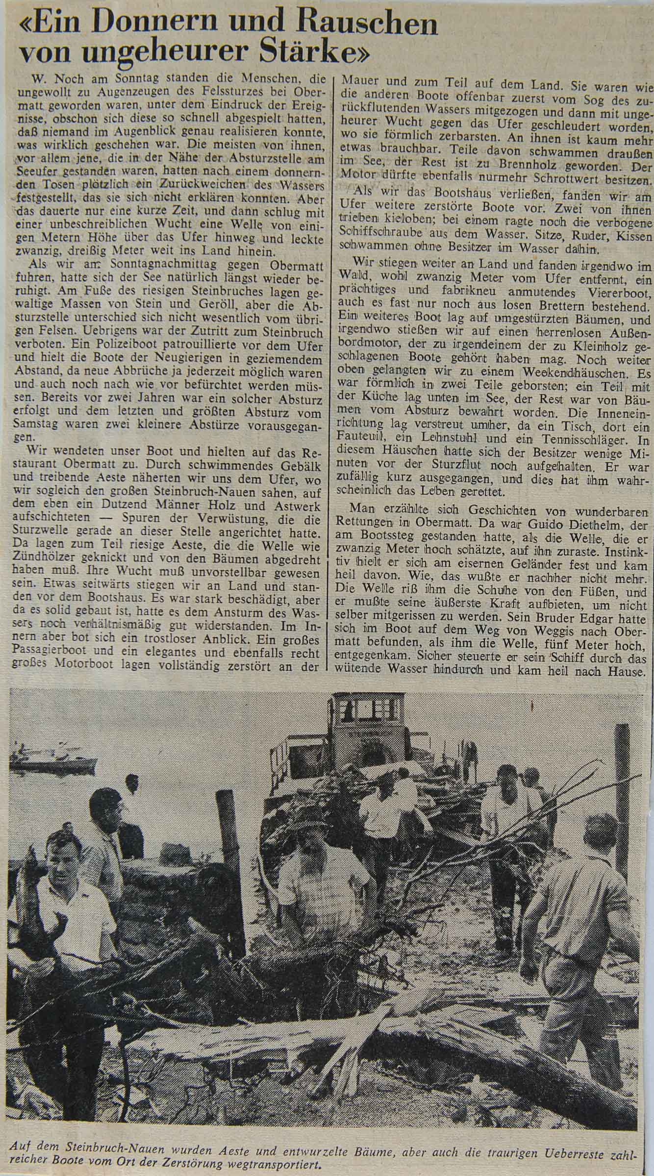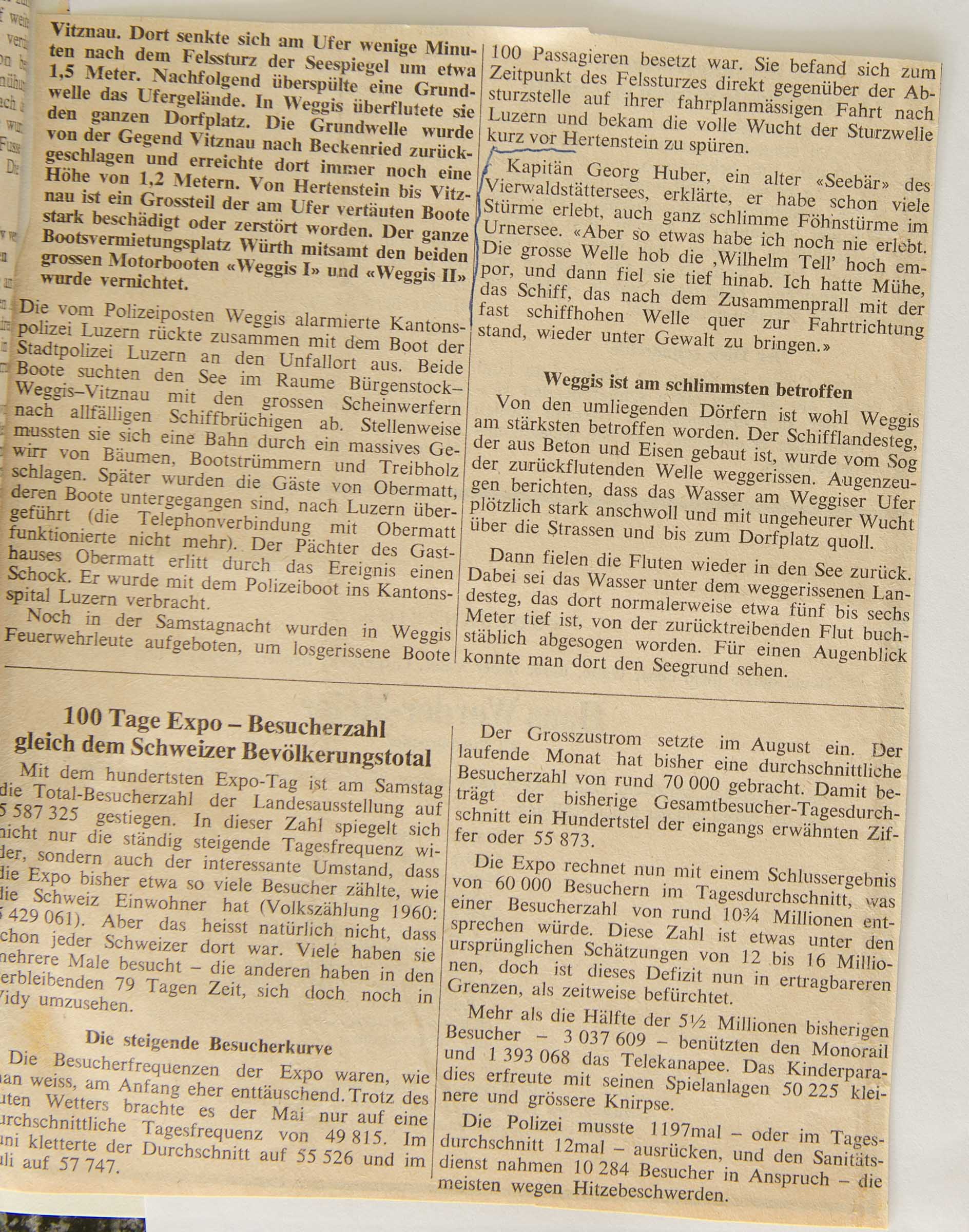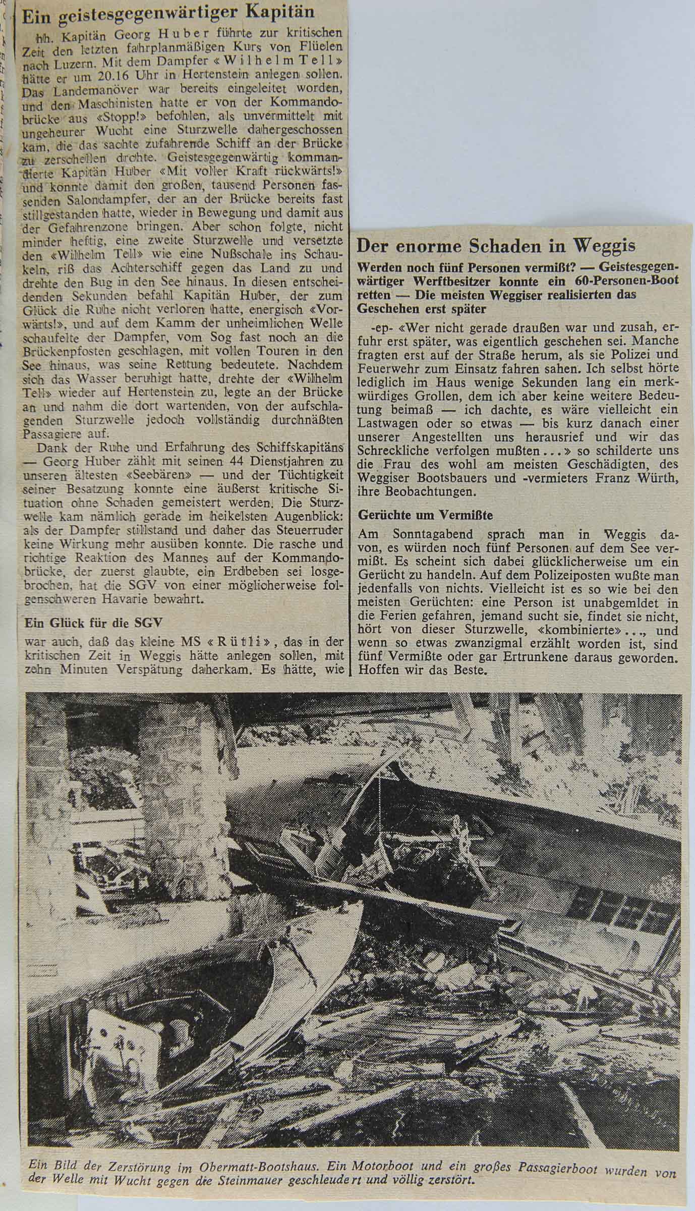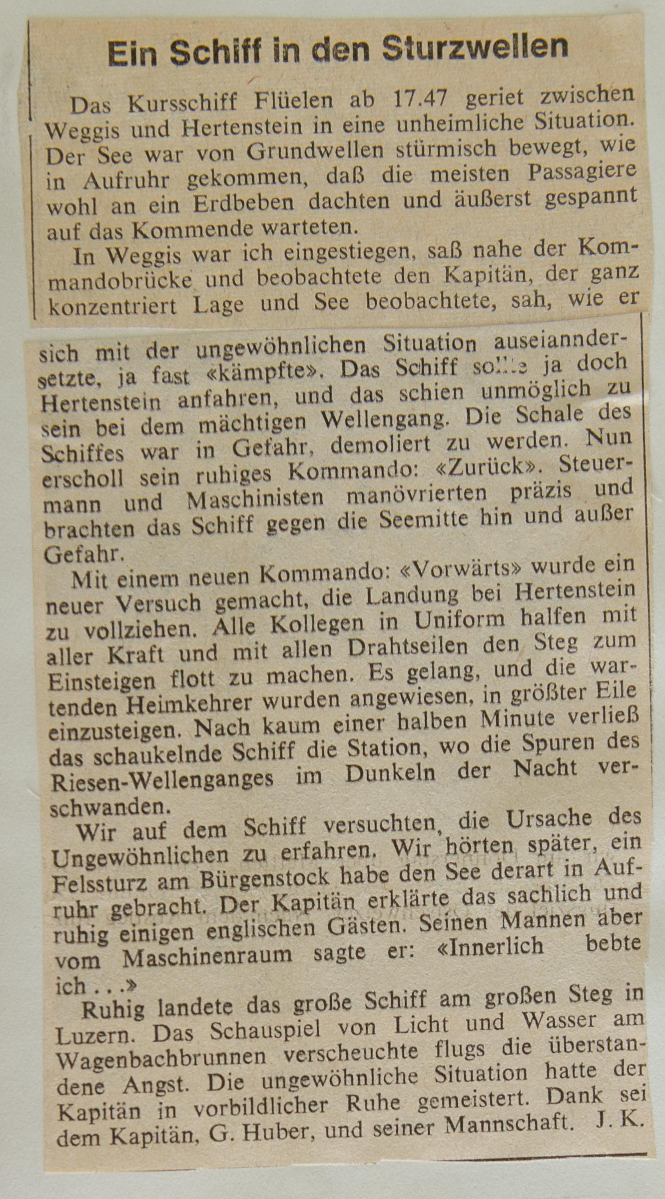 «Aber so etwas habe ich noch nie erlebt. Die grosse Welle hob Wilhelm Tell hoch empor, und dann fiel sie tief herab. Ich hatte Mühe, das Schiff, dass nach dem Zusammenprall mit der fast schiffshohen Welle quer zur Fahrrichtung stand, wieder unter Gewalt zu bringen.»