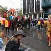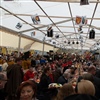 Die Menschen Menge unter dern farbigen Schirmen lacht laut und verlässt Platz, ohne das obligate Bratwurstgrillen.