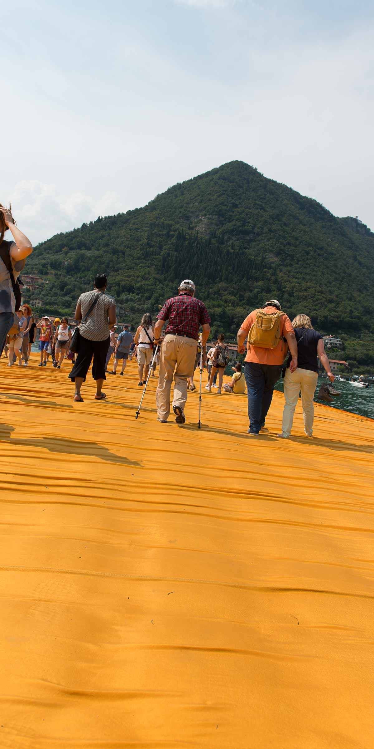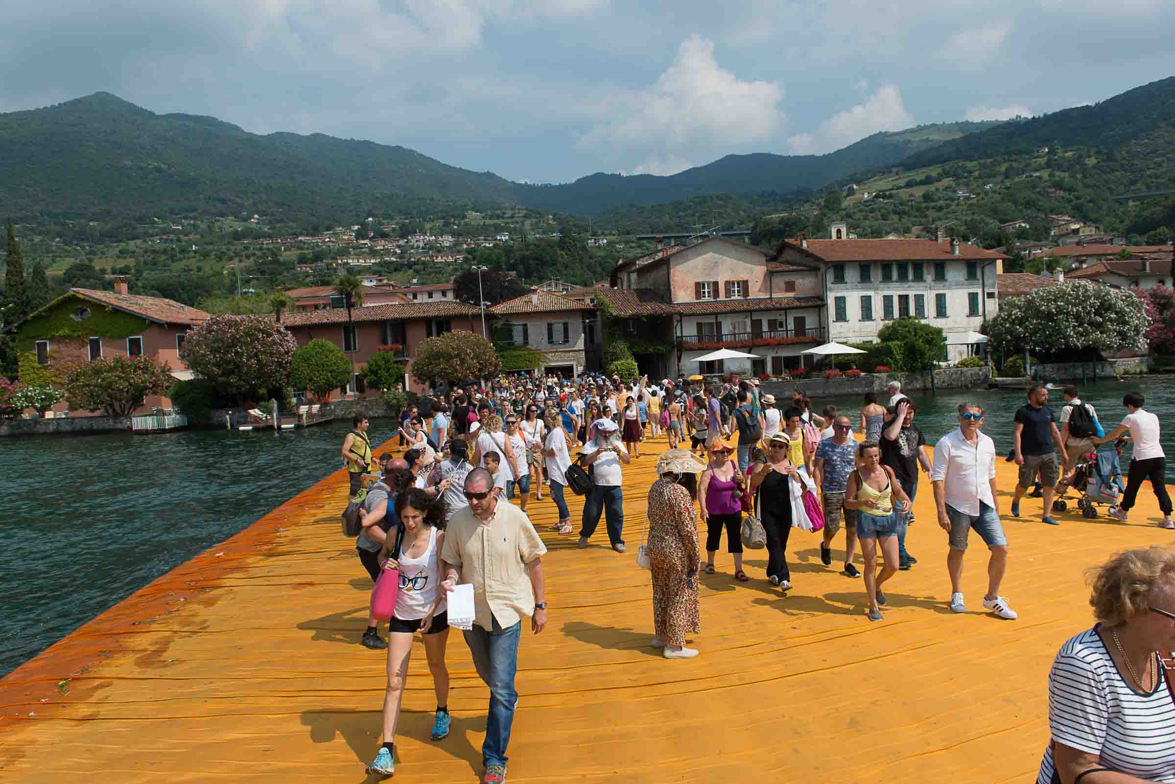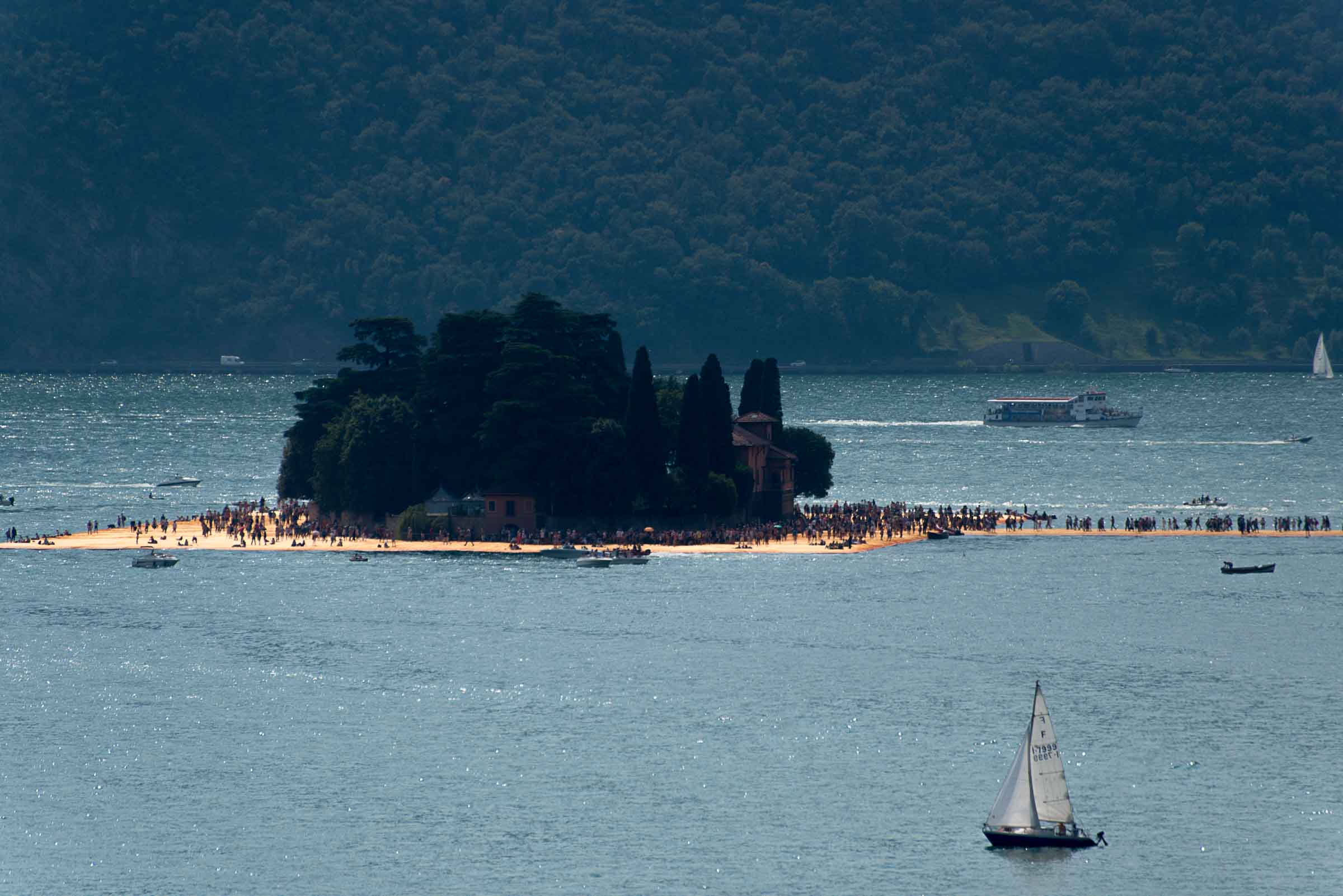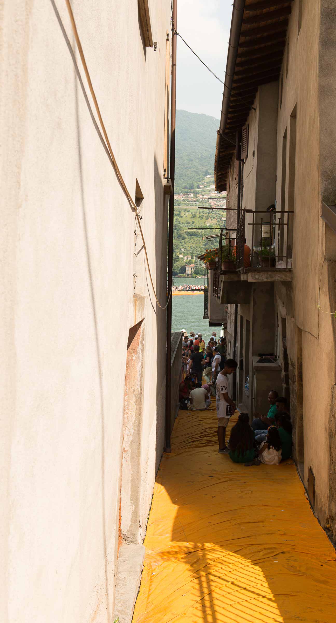 Auf der Insel sind die Wege durch die Gassen teilweise mit den Stoff ausgelegt. Auf Treppenstufen sitzen Touristen; auch hier herrschen gegen 30 Grad. Von der Kirche mit Blick auf den See, werden die Dimensionen der Installationen sichtbar. Ein Pier verbindet die Insel mit dem Festland und auf der westlichen Seite liegt die kleine Insel Isola di S. Paolo, die einem italienischen Grossindustriellen gehört. Zwei Piers führen vom Land zur Insel.