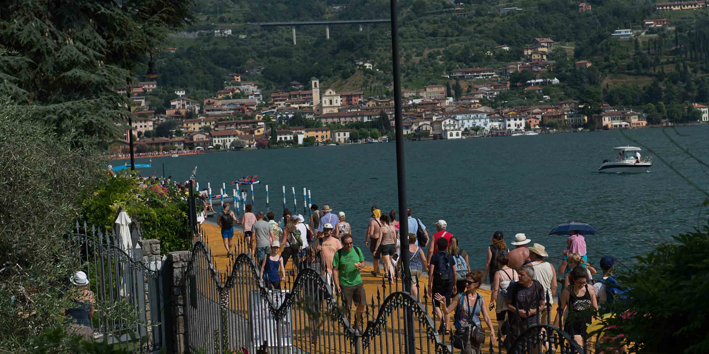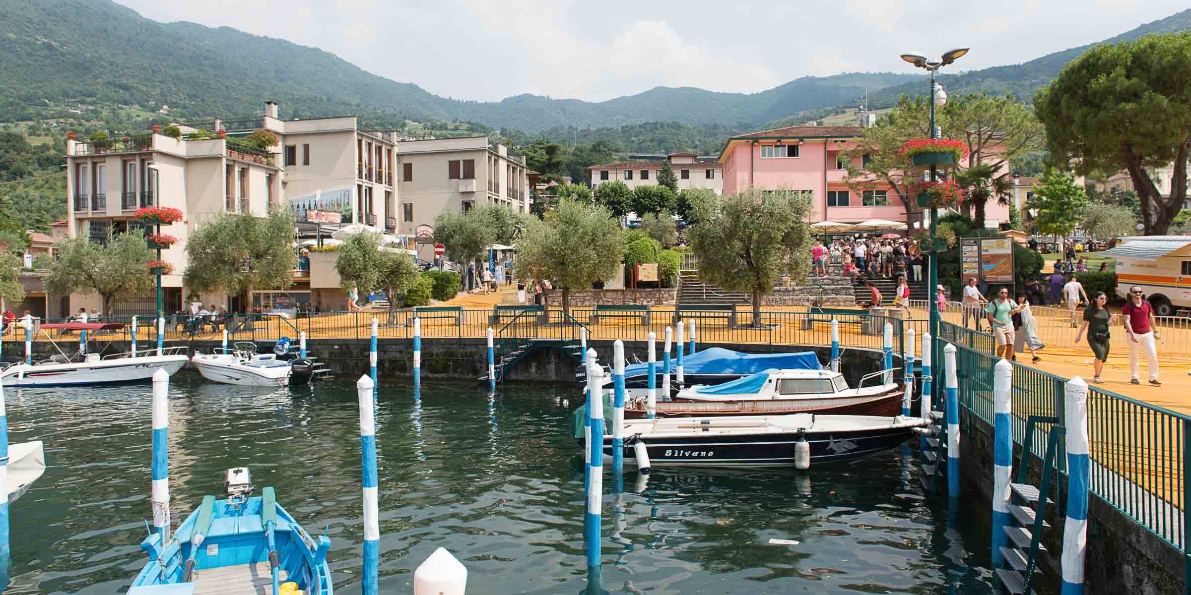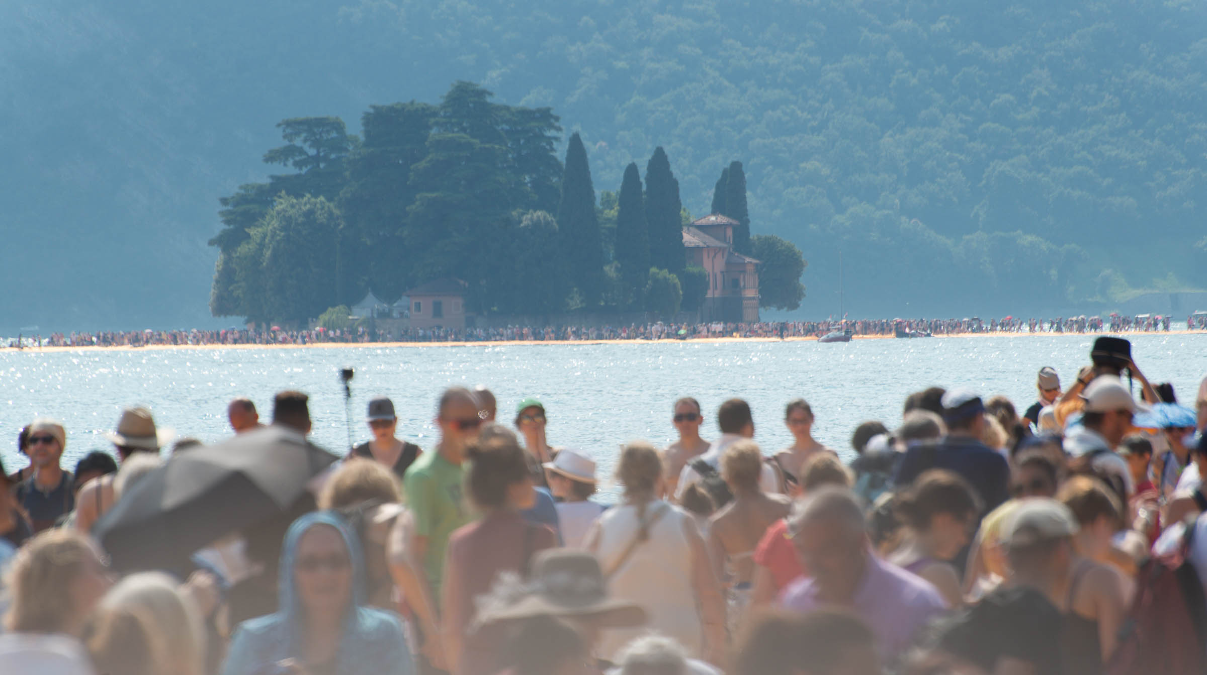Auf der Insel sind die Wege durch die Gassen teilweise mit den Stoff ausgelegt. Auf Treppenstufen sitzen Touristen; auch hier herrschen gegen 30 Grad. Von der Kirche mit Blick auf den See, werden die Dimensionen der Installationen sichtbar. Ein Pier verbindet die Insel mit dem Festland und auf der westlichen Seite liegt die kleine Insel Isola di S. Paolo, die einem italienischen Grossindustriellen gehört. Zwei Piers führen vom Land zur Insel.