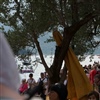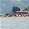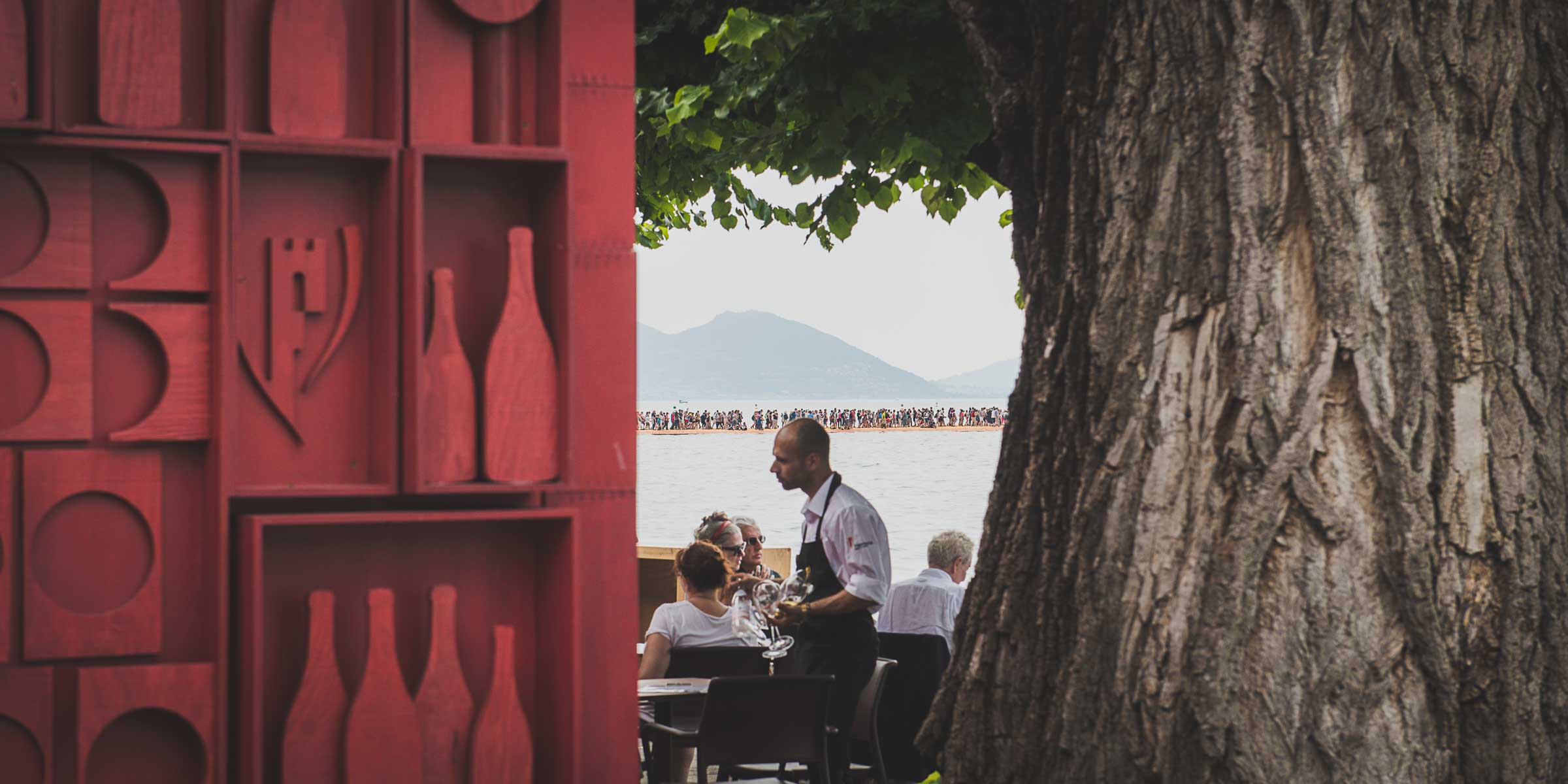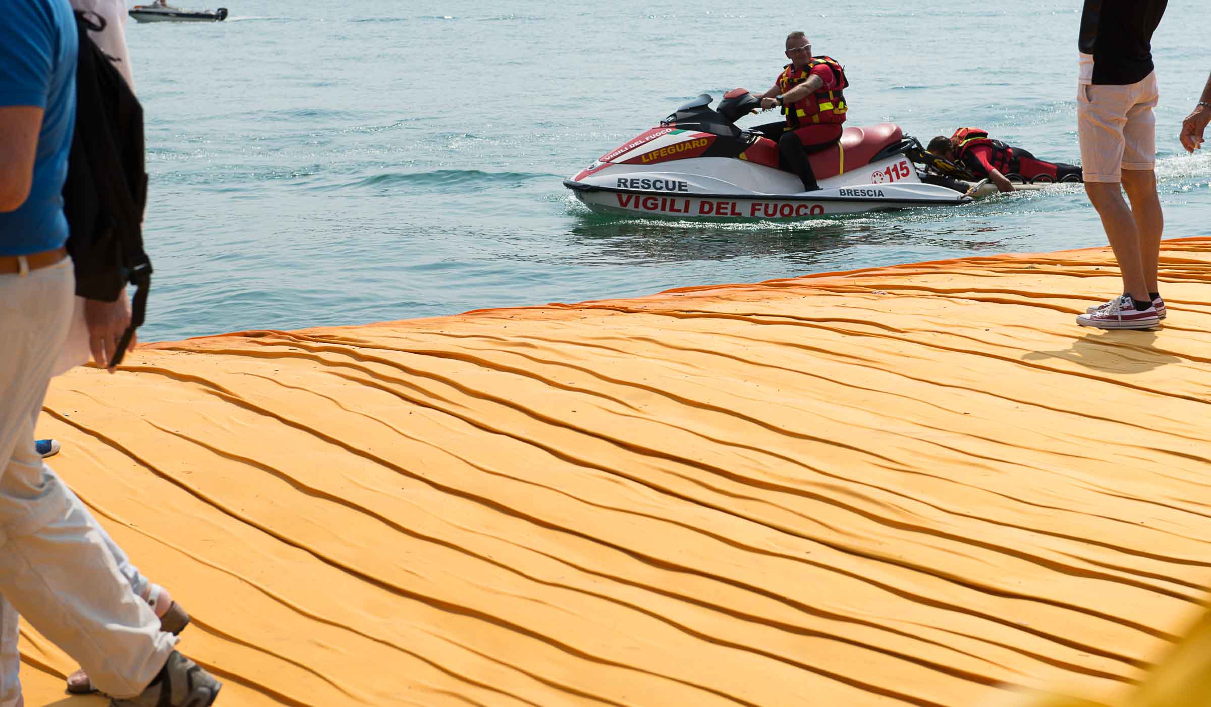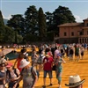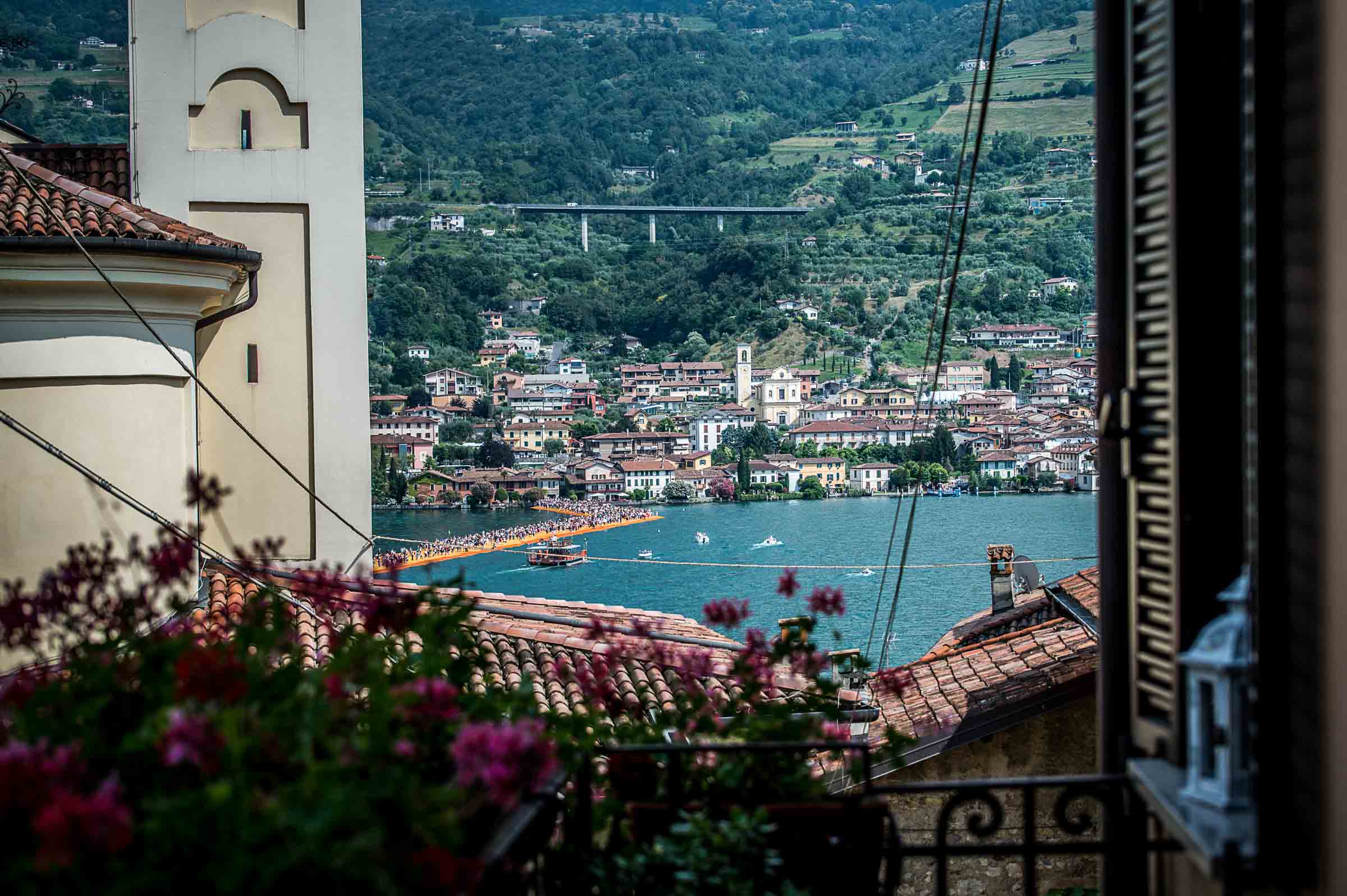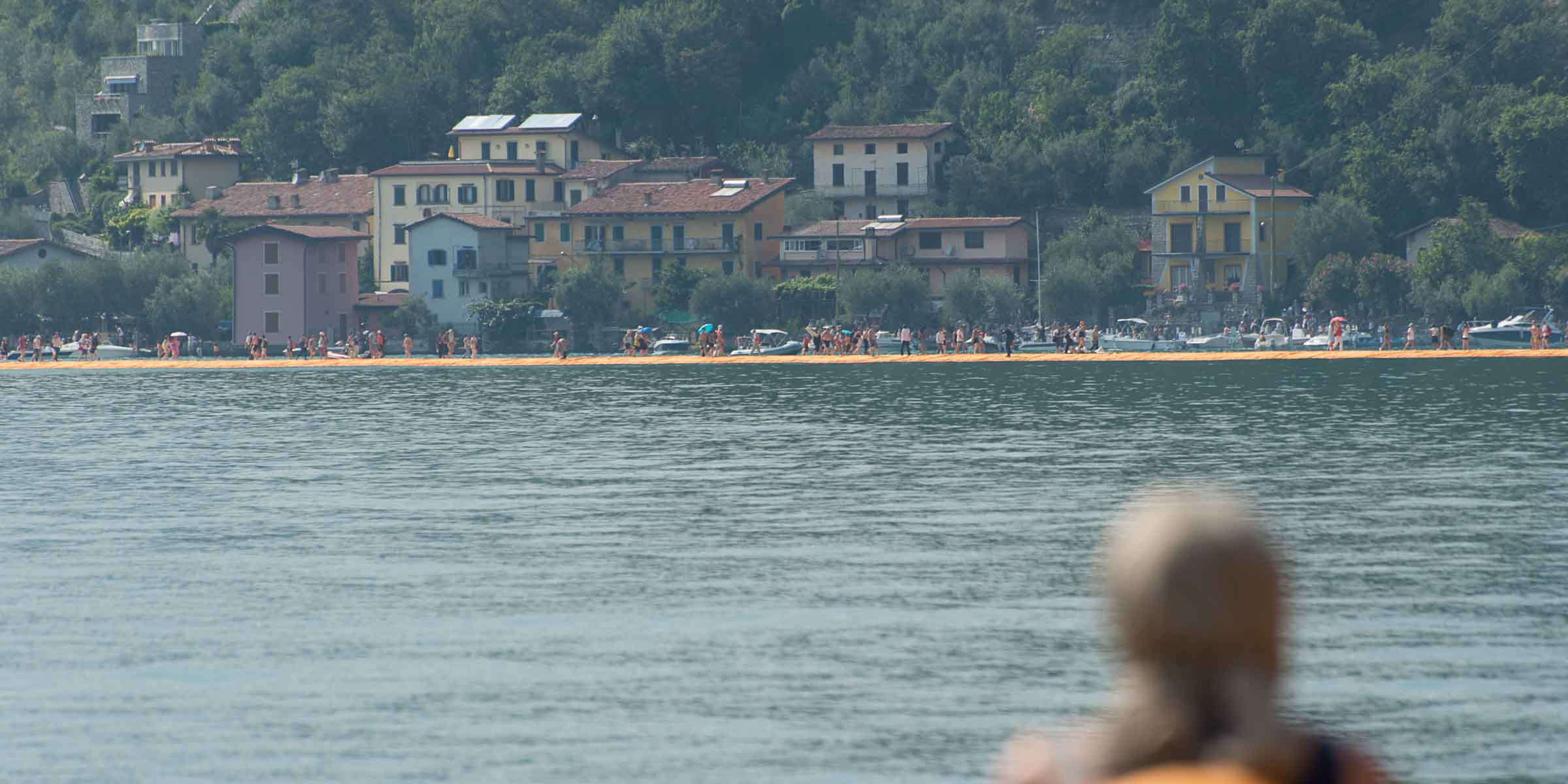 Auf der Insel sind die Wege durch die Gassen teilweise mit den Stoff ausgelegt. Auf Treppenstufen sitzen Touristen; auch hier herrschen gegen 30 Grad. Von der Kirche mit Blick auf den See, werden die Dimensionen der Installationen sichtbar. Ein Pier verbindet die Insel mit dem Festland und auf der westlichen Seite liegt die kleine Insel Isola di S. Paolo, die einem italienischen Grossindustriellen gehört. Zwei Piers führen vom Land zur Insel.