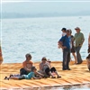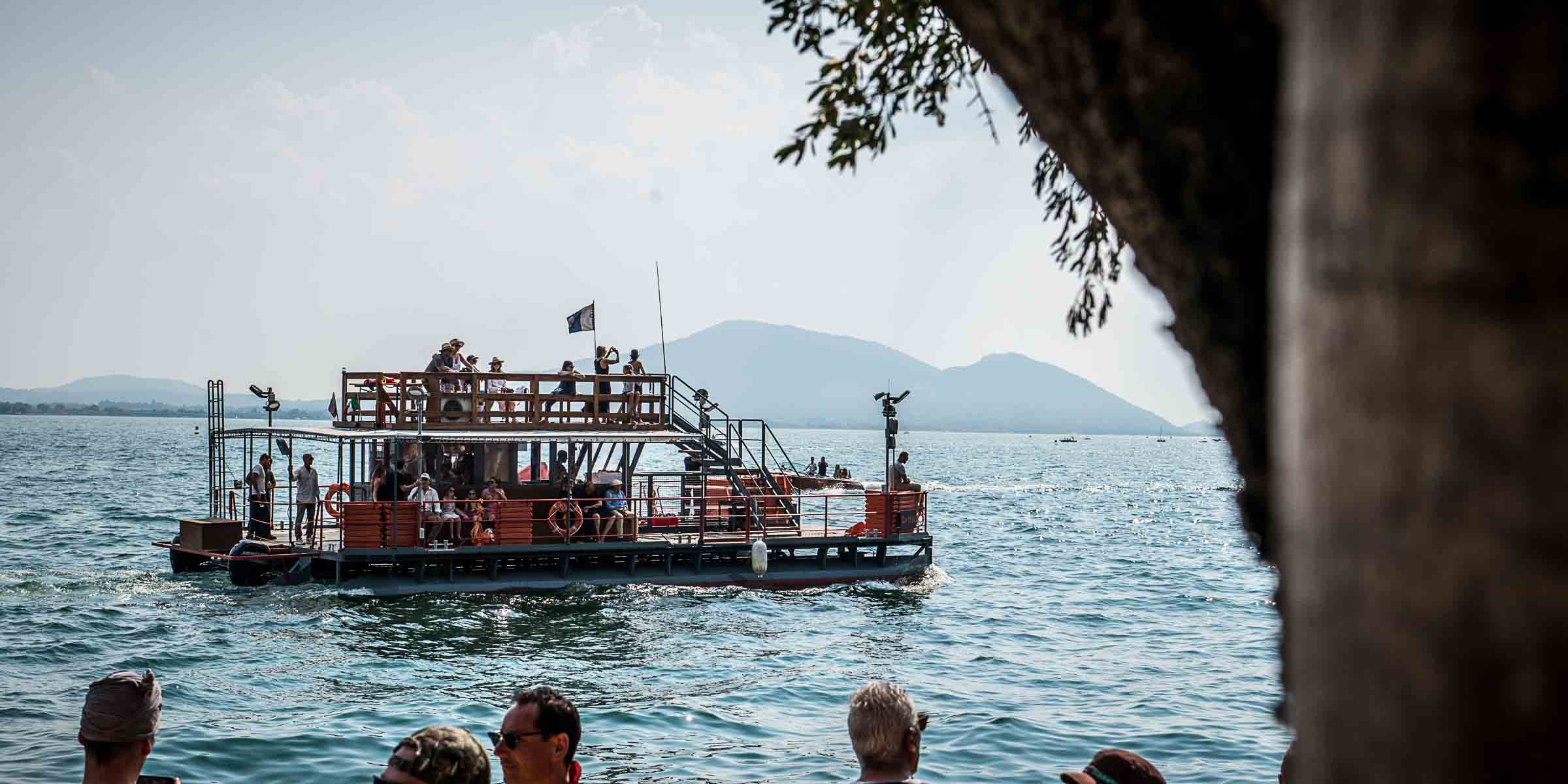 Der Zugang zur Insel ist an diesen Tagen viel erlebnisreicher zu Fuss, schreitend über die rund 220'000 Plastikboxen, die unter dem Tuch miteinander verbunden sind. Mittels tonnenschwerer Anker im See, sind sie fixiert und bleiben auch bei Wind und Gewitter, über dem See schaukelnd an ihrem zugewiesenen Platz.