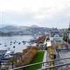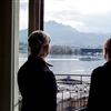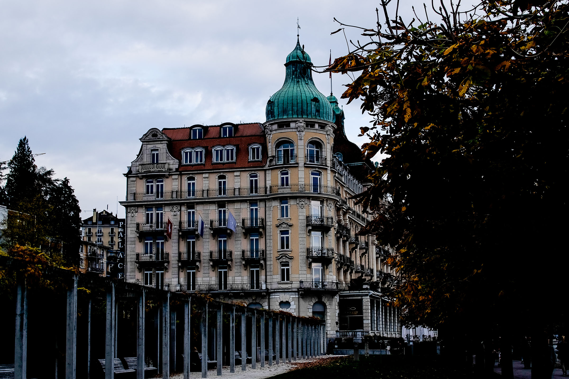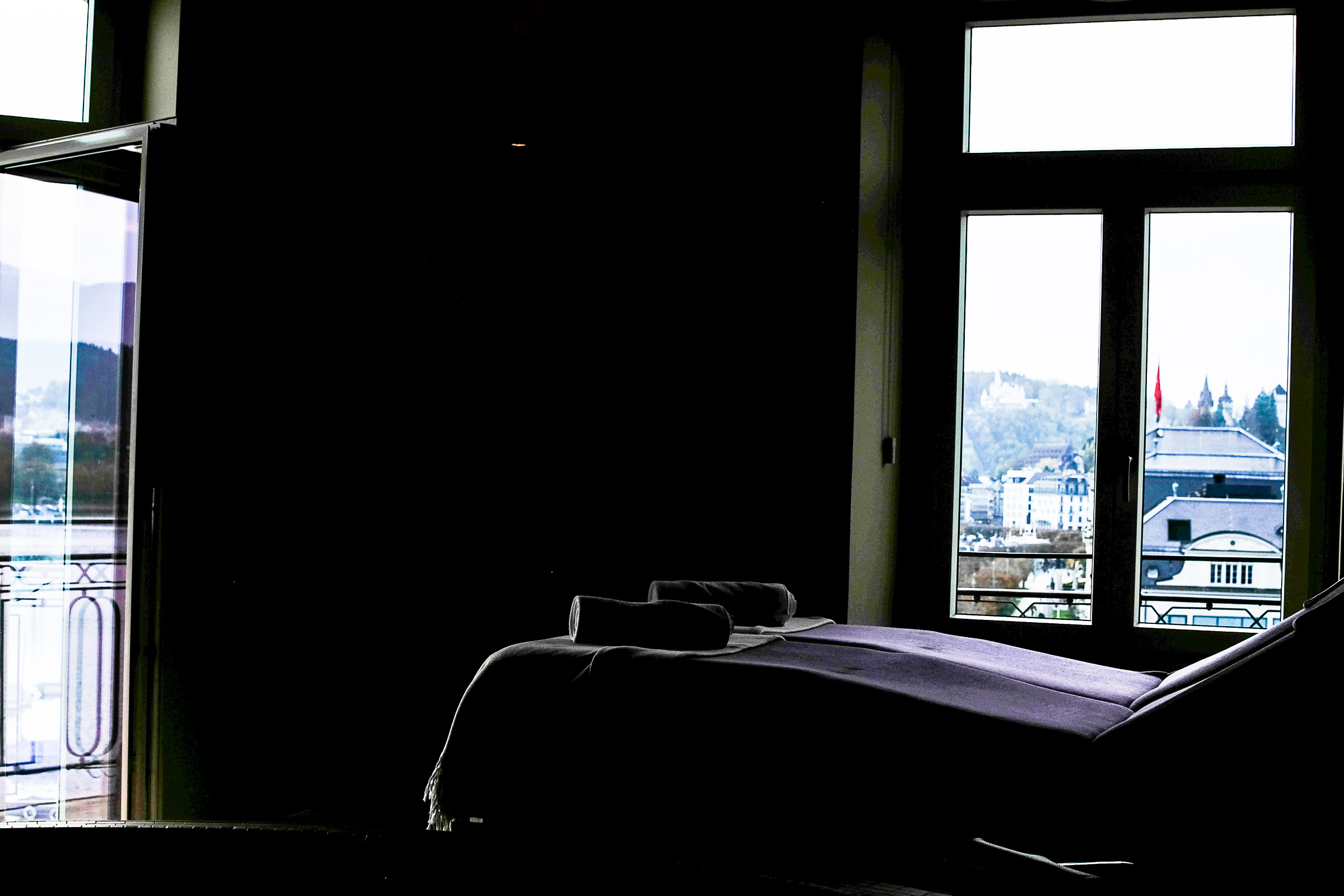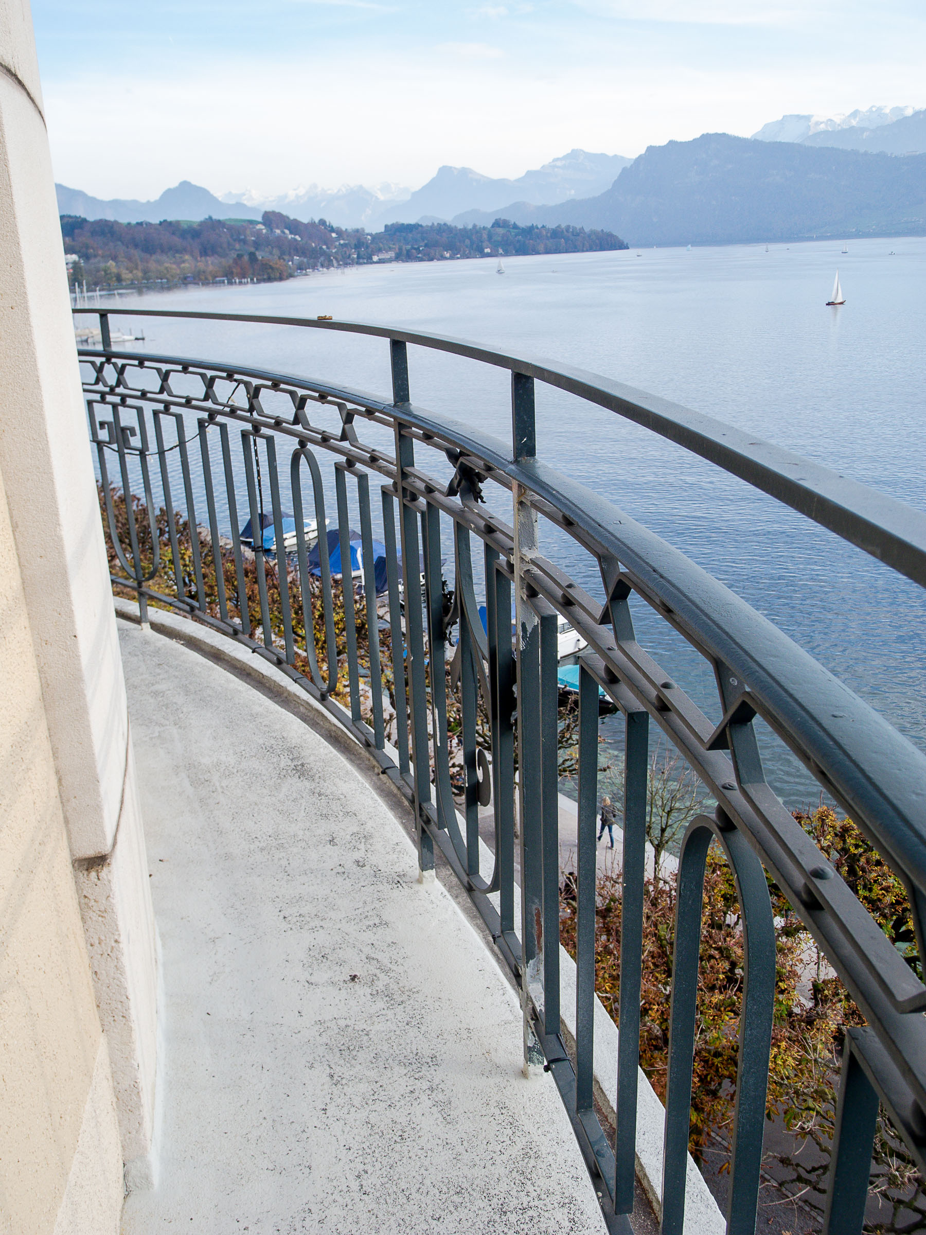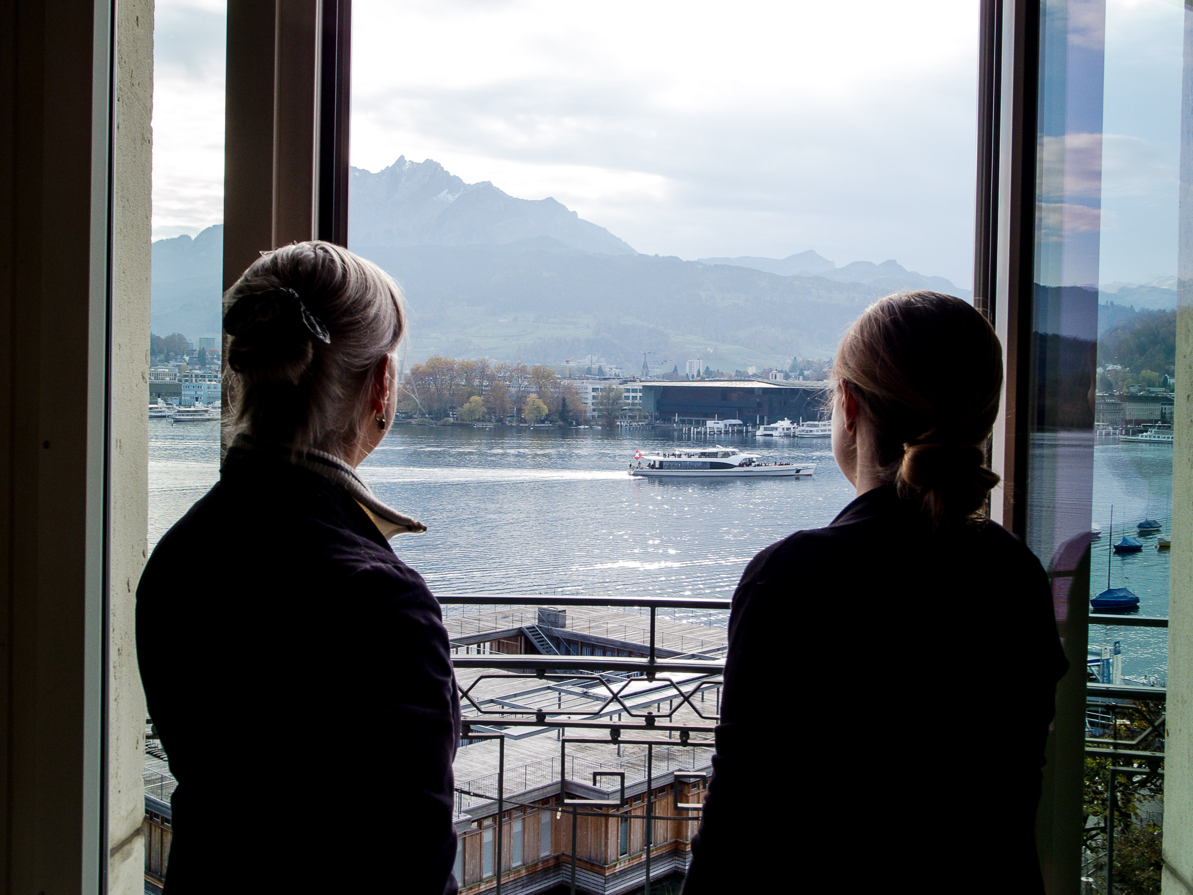 Der Blick schweift an den beiden Damen vorbei über den See und dem KKL Richtung Pilatus, der sich in ein herbstliches Nebelkleid hüllt. Die Aussicht von hier oben ist schon exzellent. Die Gäste im Spa können durch die Fensterfront einen Blick erhaschen. Die Schneeberge sehen in der langsam niedergleitenden Sonne wie Zuckerberge aus. Auf dem Dach der Seebadi stehen die Sonnenschirmständer aufgeräumt und warten tunlichst auf den nächsten Sommereinsatz.