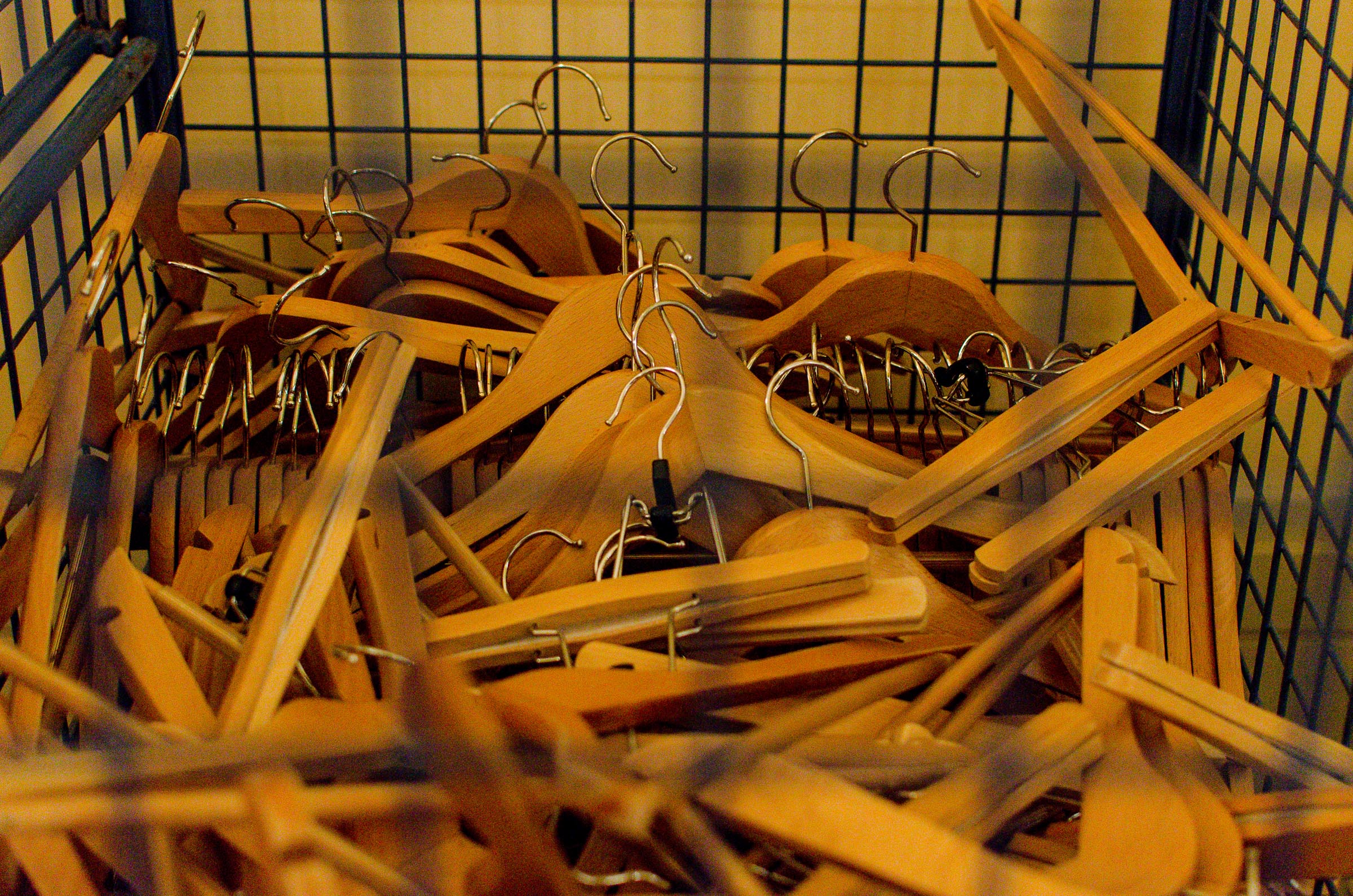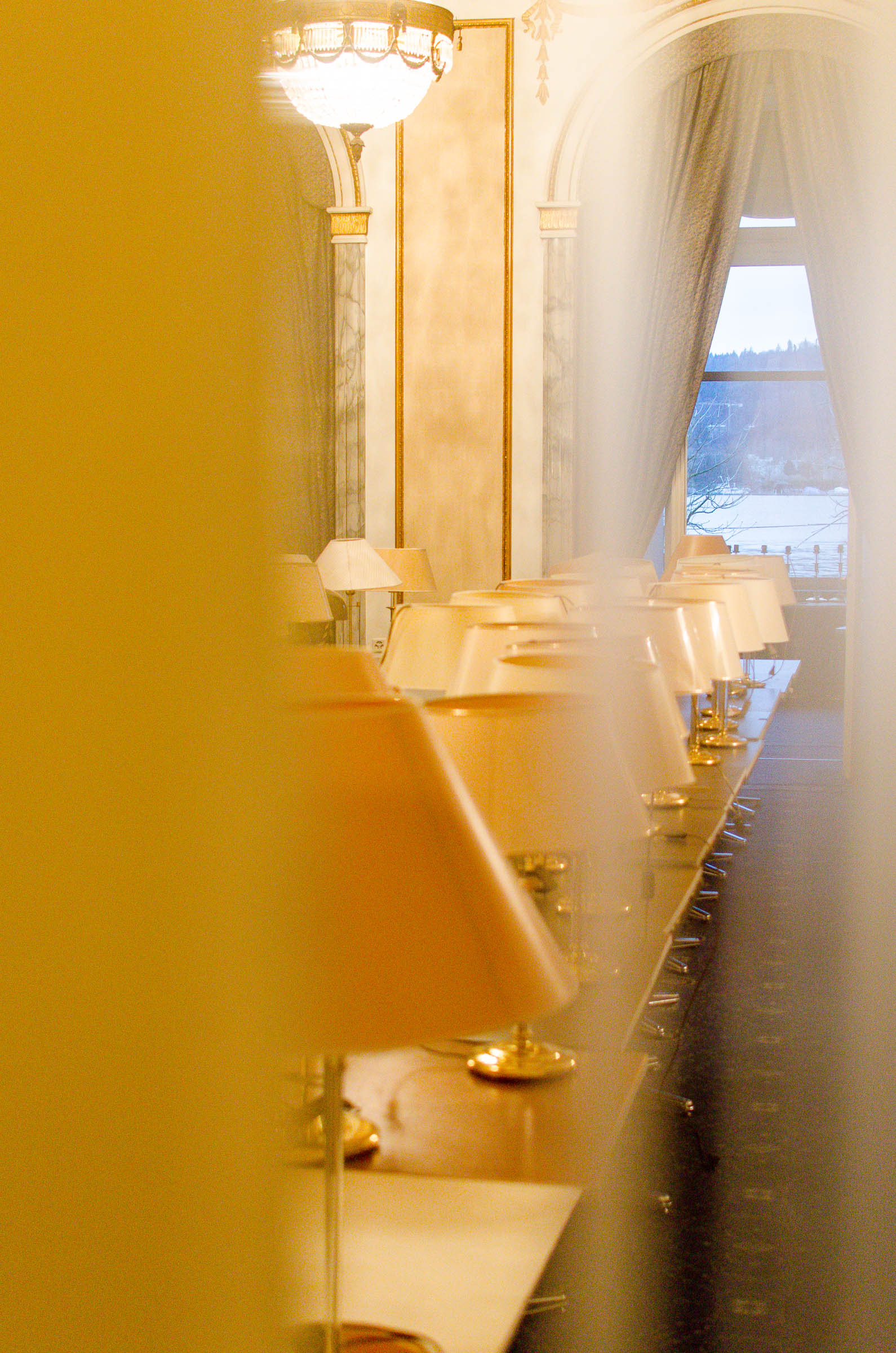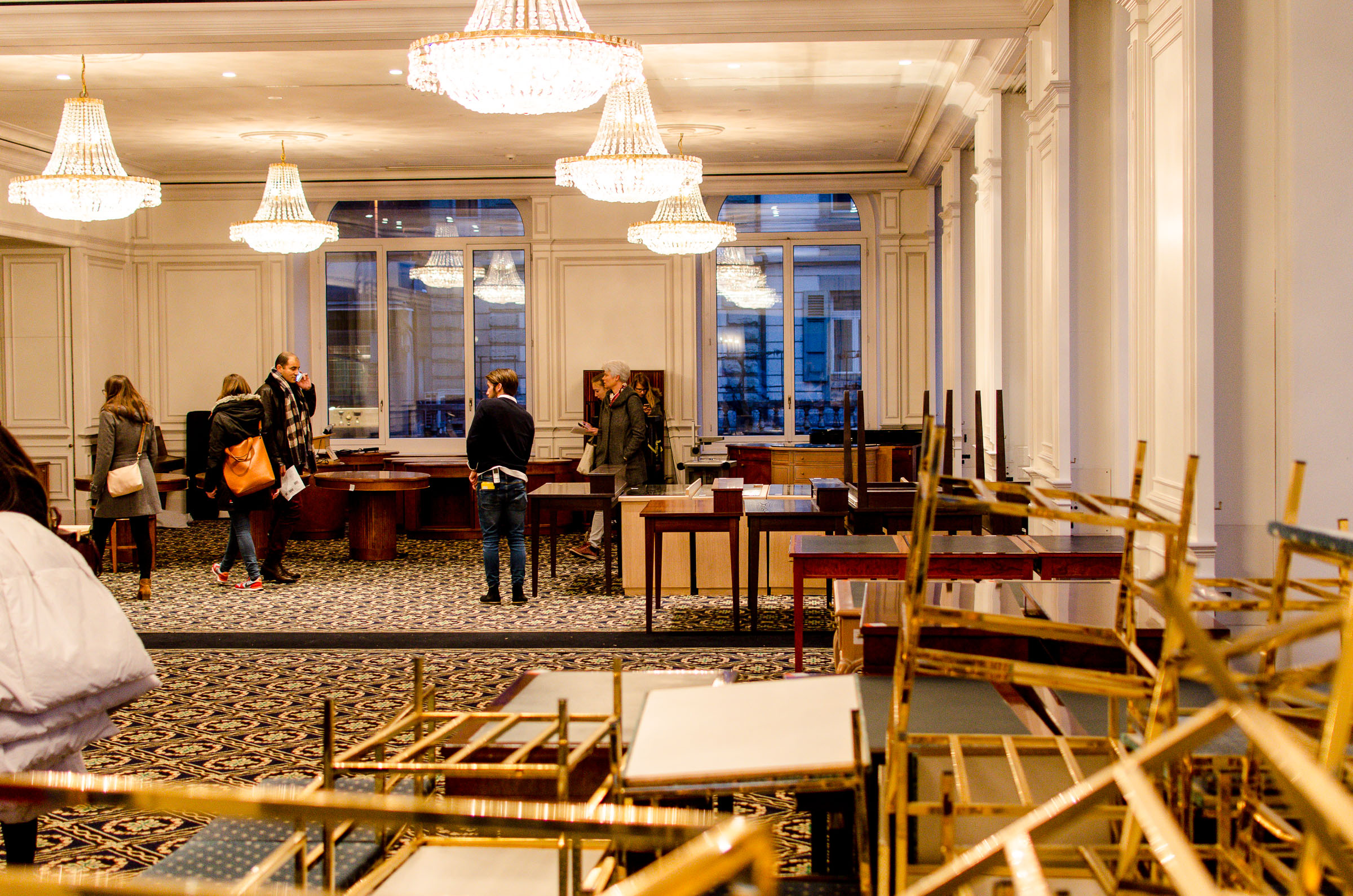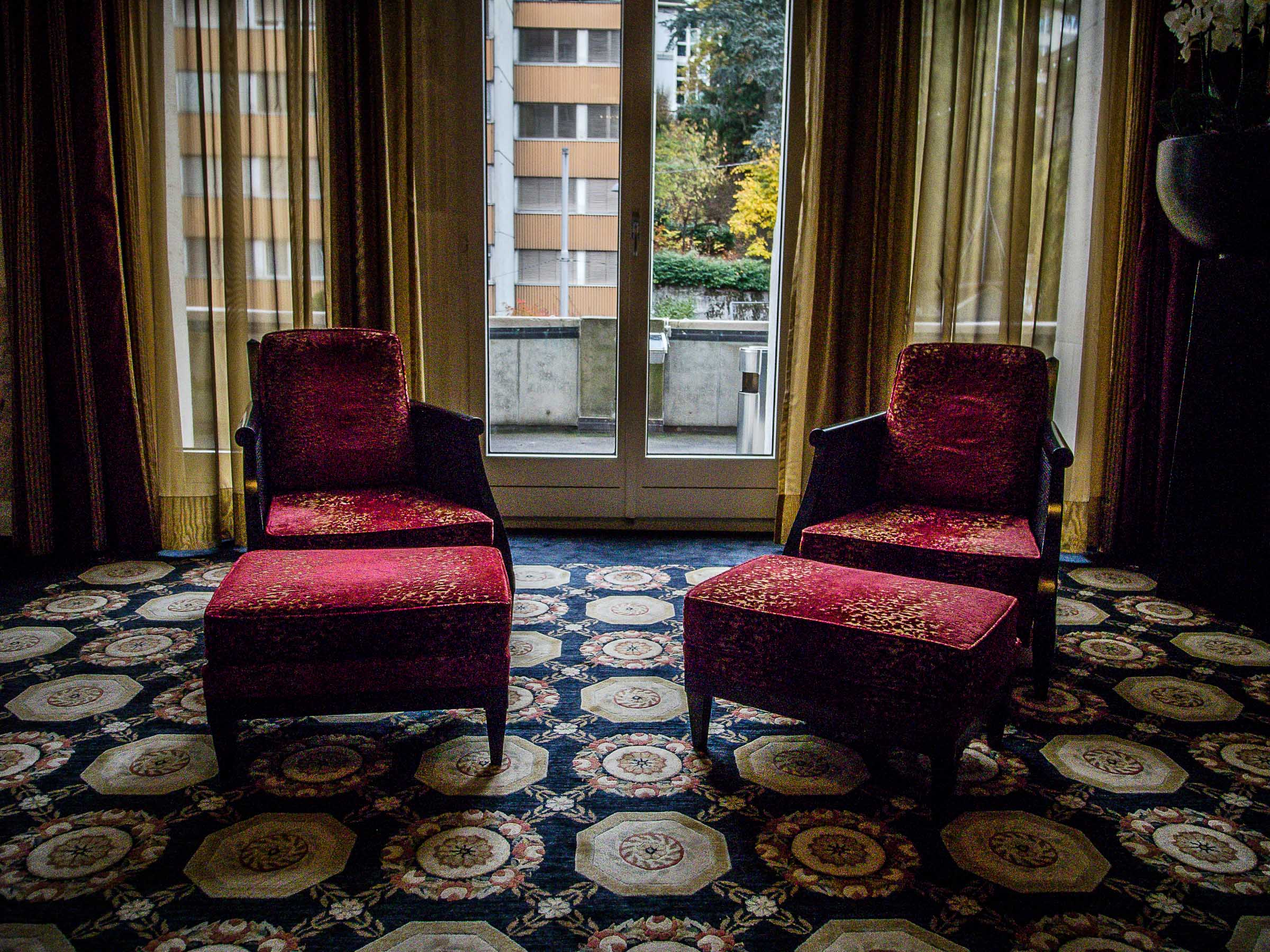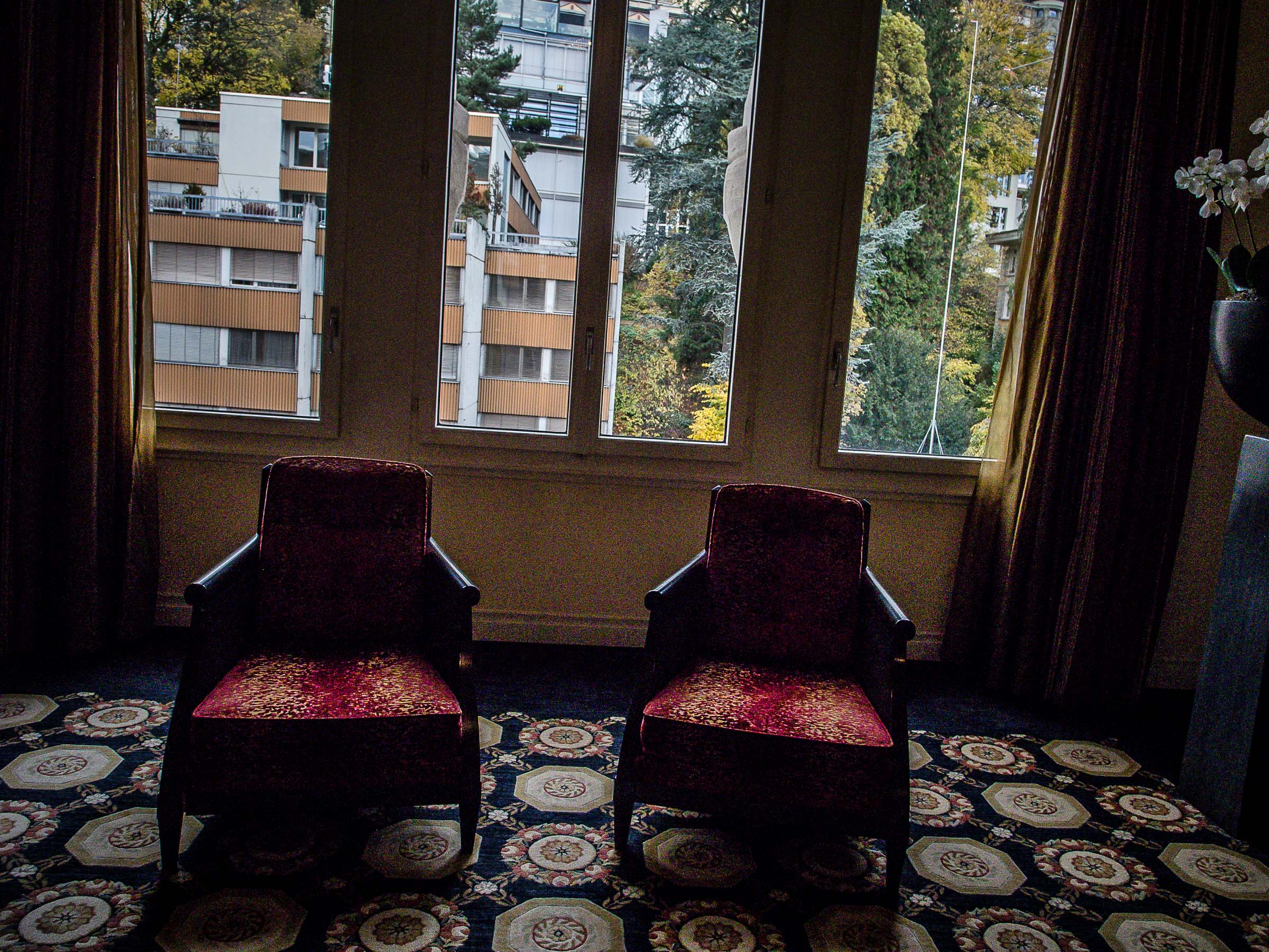 Die Kleiderbügel liegen ungeordnet in einem Transportwagen. Im nächsten Raum finden wir einen roten Fauteuil für CHF 80.--. Die Blauen sind verkauft und stehen abholbereit im grossen Saal. Das Hotel Palace Luzern wird bald in einen Dornröschenschlaf fallen.