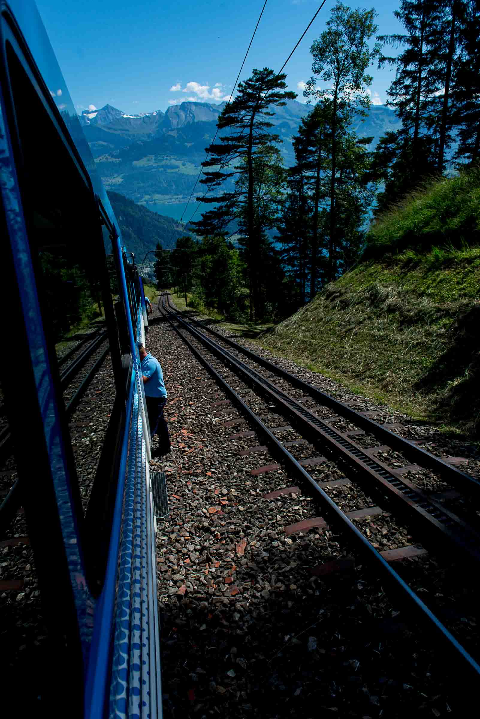Auf der Fahrt nach Vitznau erzählt der Bahnhofvorstand, Zugbegleiter, Billette-Kontrolleur, Wagenführer und Auskunftsperson in einem, der Samstag-Abend-Dienst ist schon lange, und wenn er nicht in Vitznau wohnen würde, dann wäre es schon ein langer Tag. Am nächsten Tag steht er wieder auf der Matte, die Züge fahren.