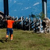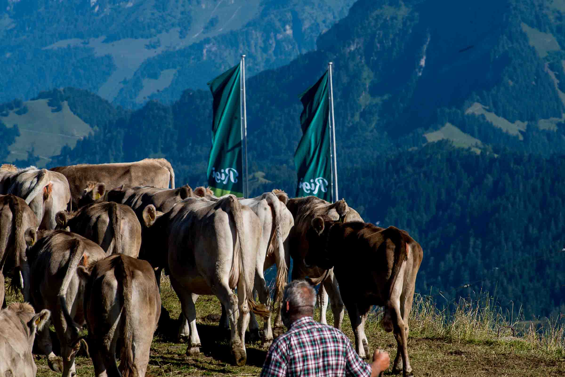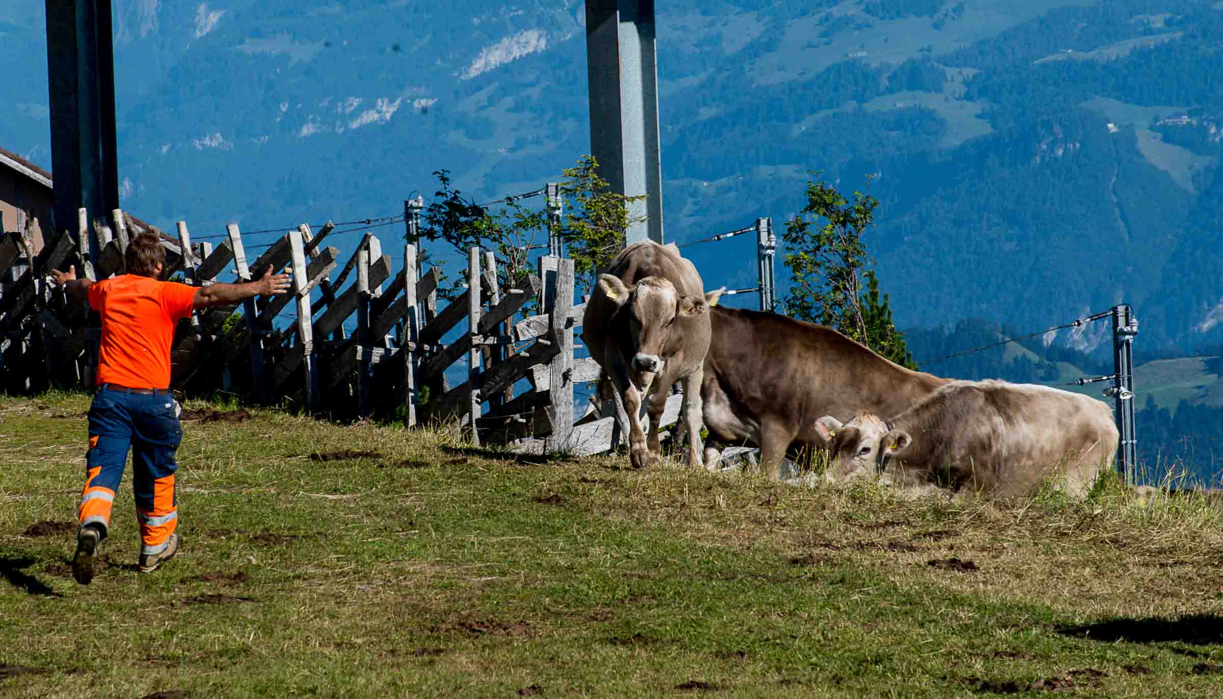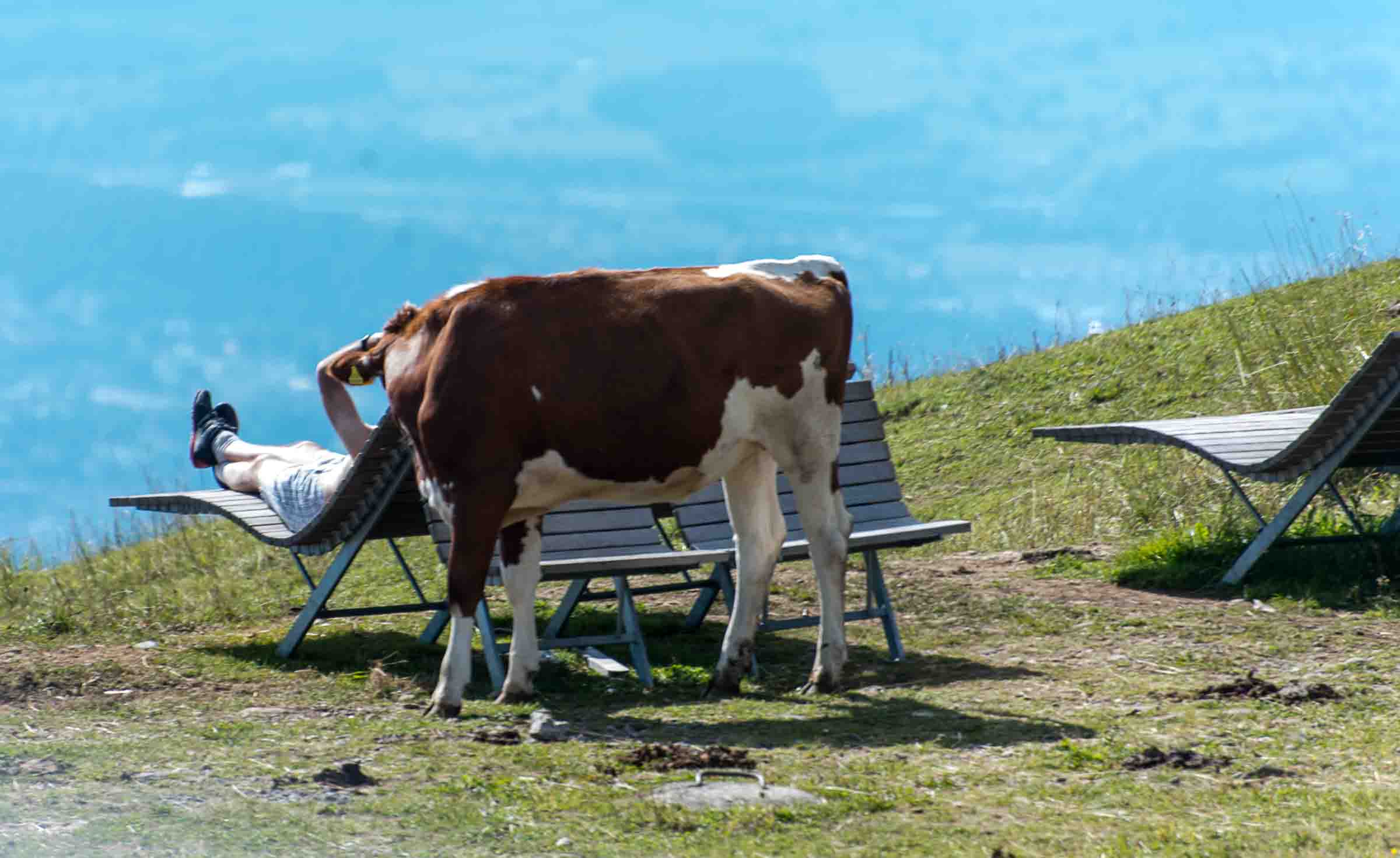 Höchste Zeit für die Kuhherde. Zurück in den Stall. Unter der Terrasse, wo noch vor wenigen Momenten einige Touristen neben Kühen auf Holzstühlen die Sonne genossen haben, ziehen die Kühe weiter.