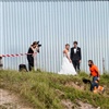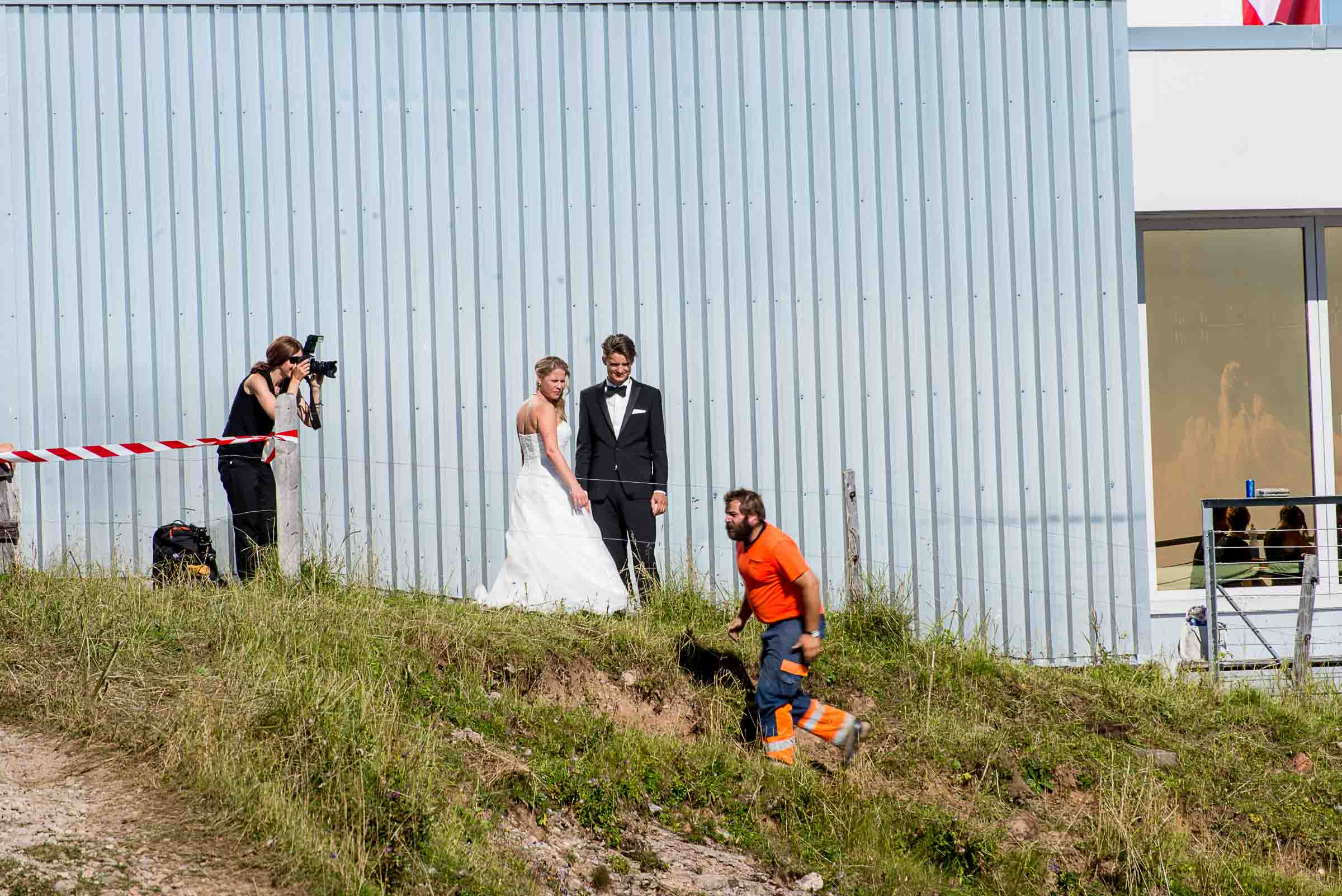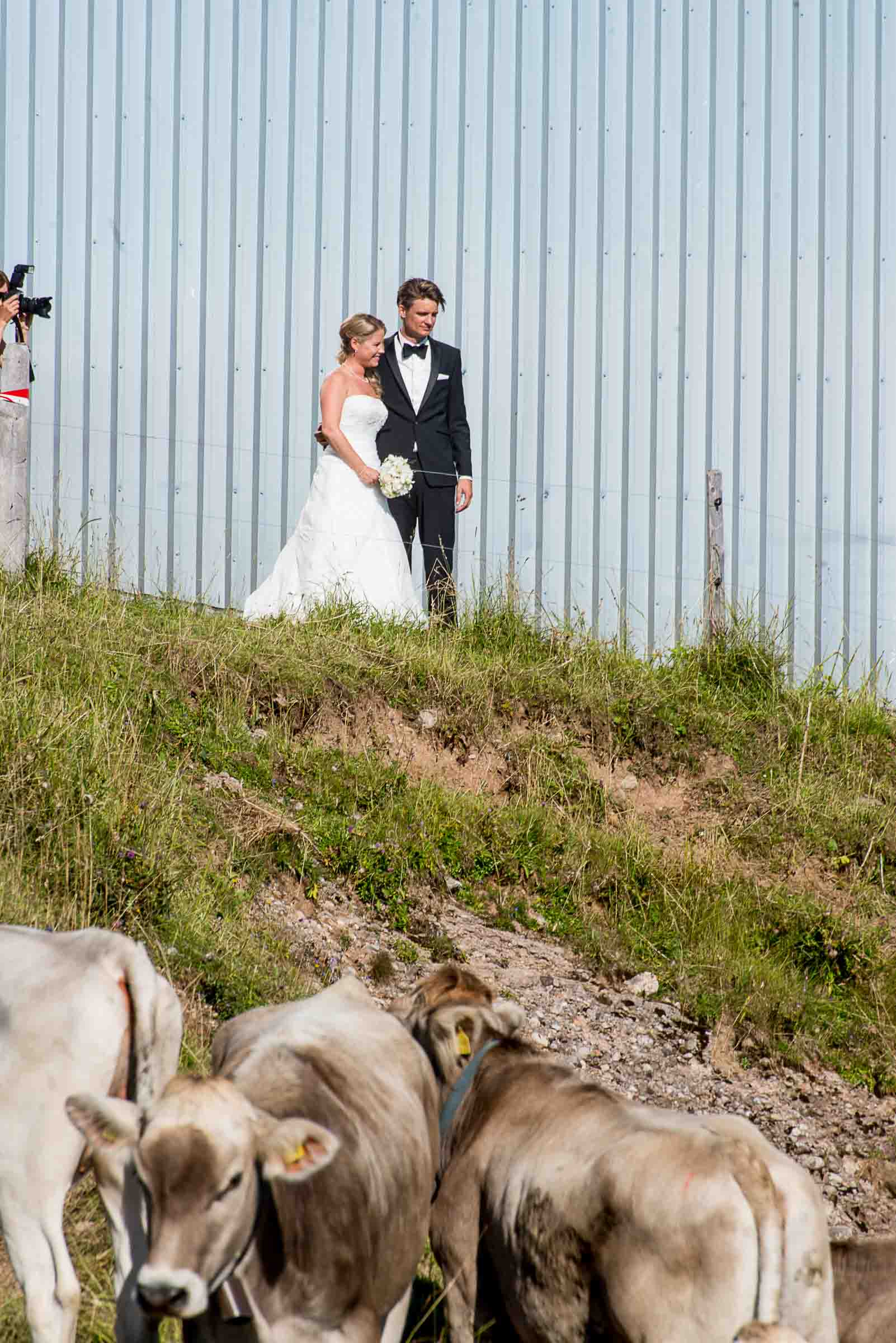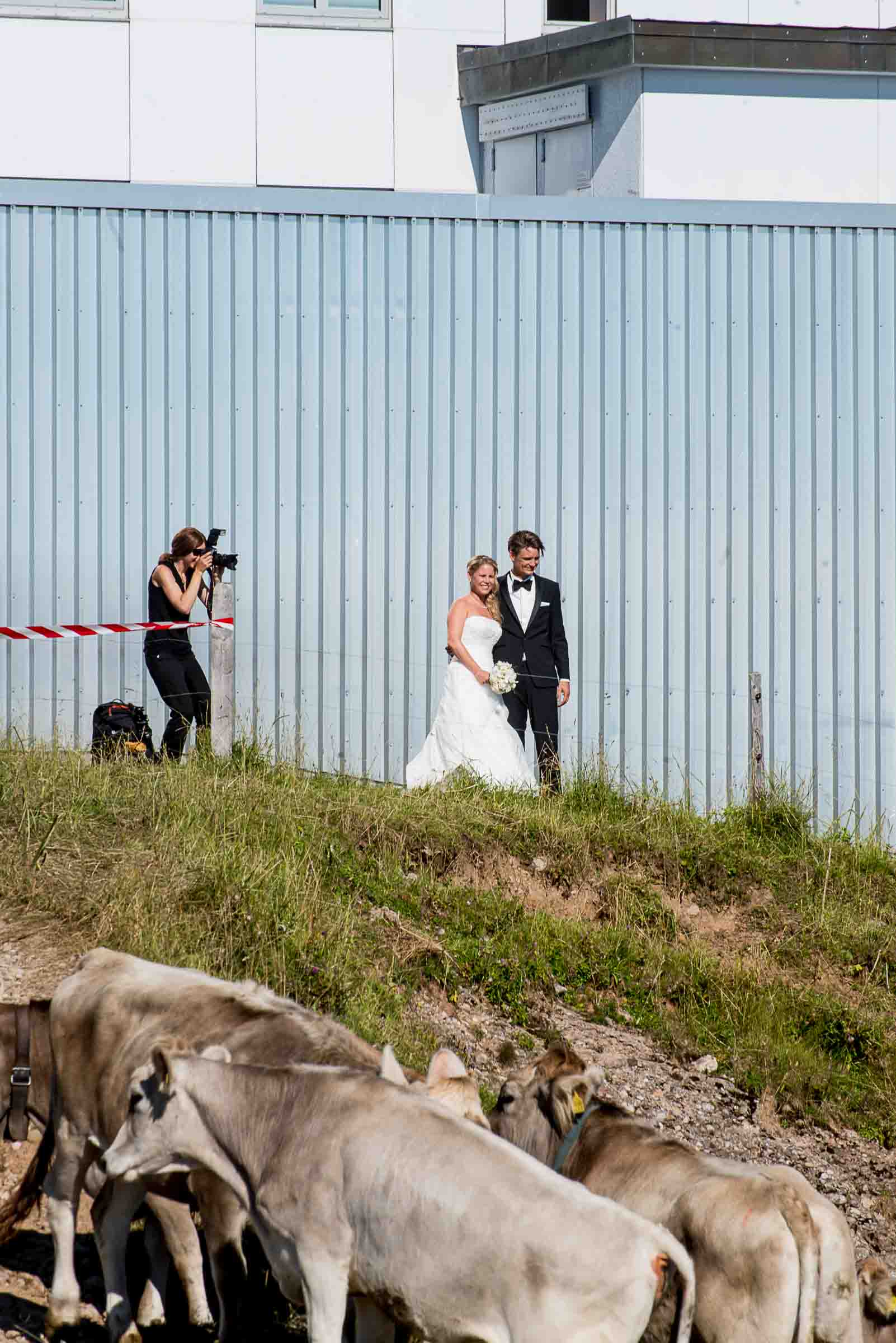 Das Brautpaar ist jetzt angekommen. Die Photographin auf Besichtigungstour und schon das erste Sujet. Die Kühe störts nicht. Den Bräutigam schon. Auf dem weiteren Weg zur richtigen Position für's Photo ist er in die Schei… gestanden. Und das Brautkleid hat auch etwas braune Farbe abgekriegt und duftet nach Alpenparfüm.